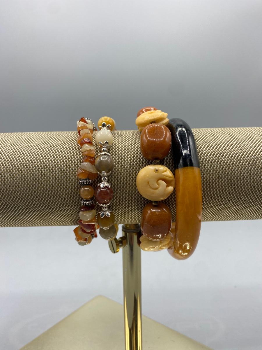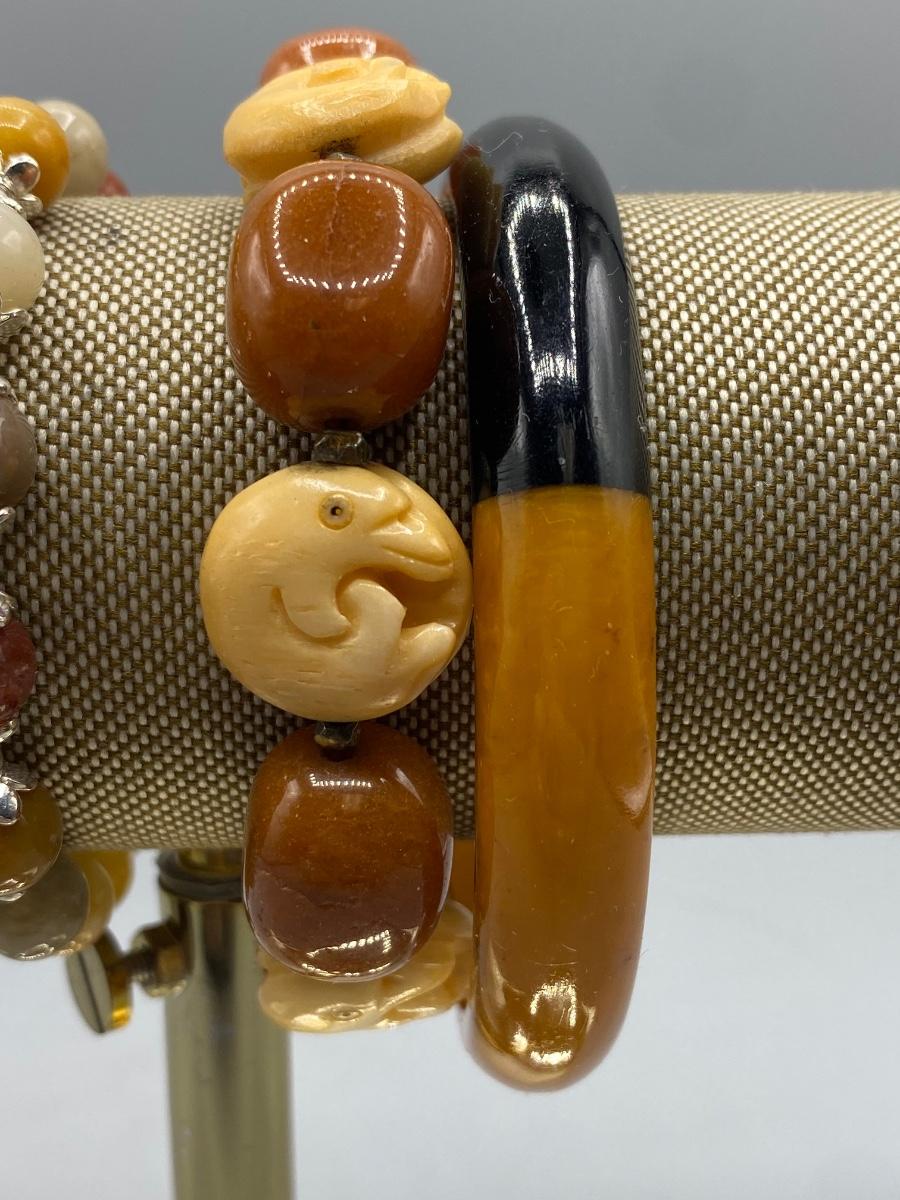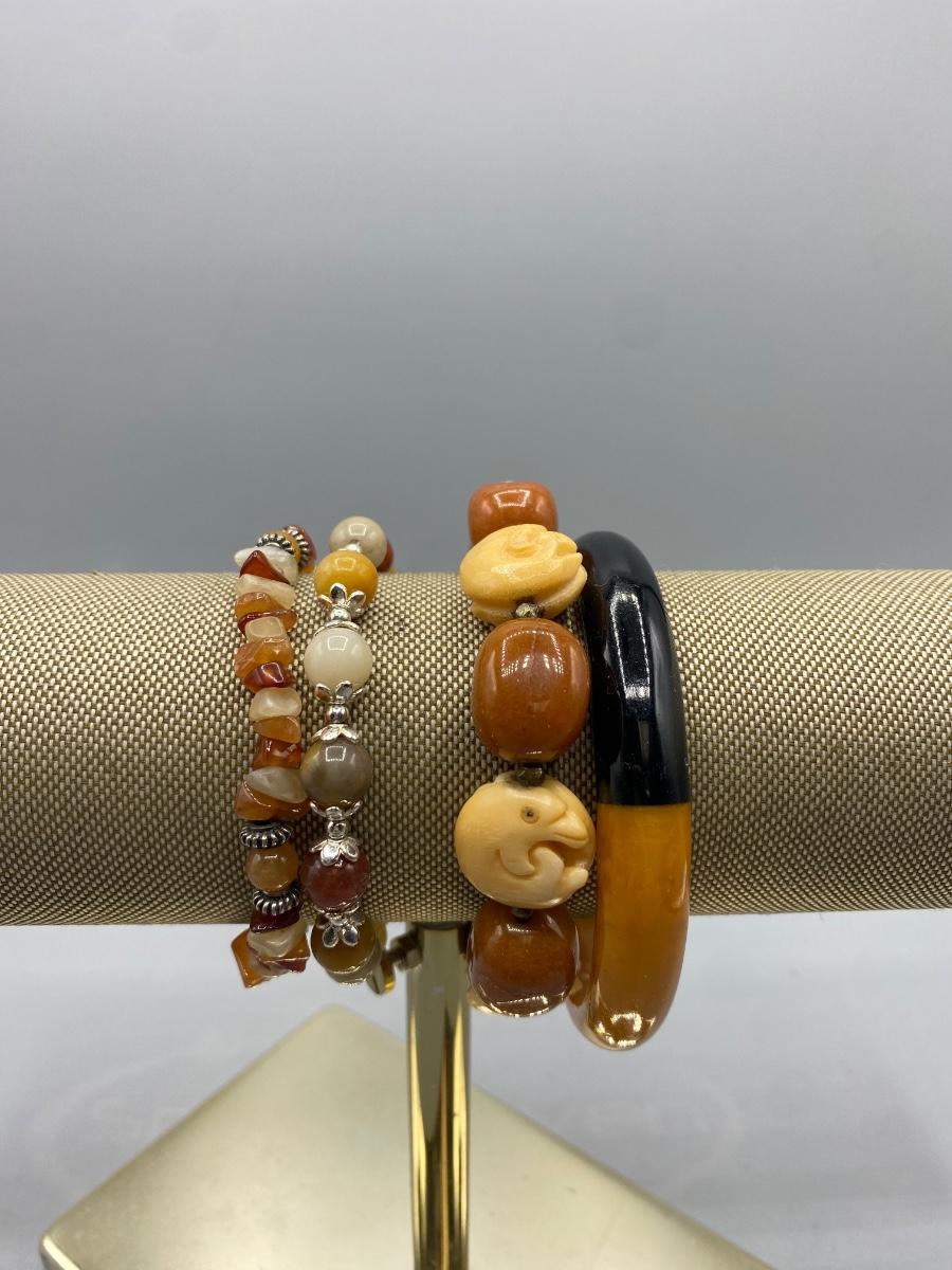 Lot of Warm Tone Stone Beaded Carved Elephant Bangle Bracelets. 4 bracelets. One is a standard bangle style bracelet. See photos.
