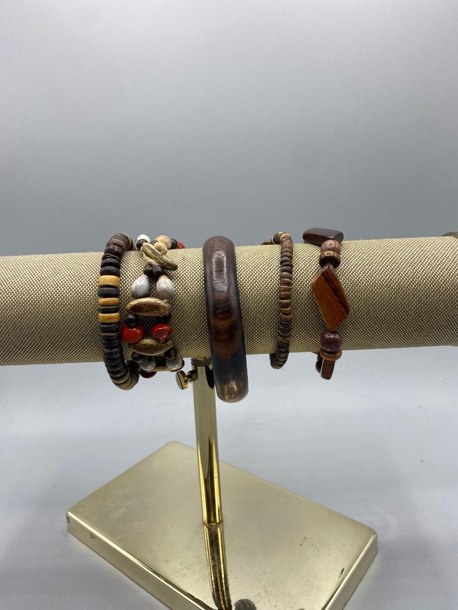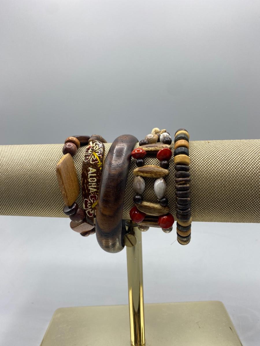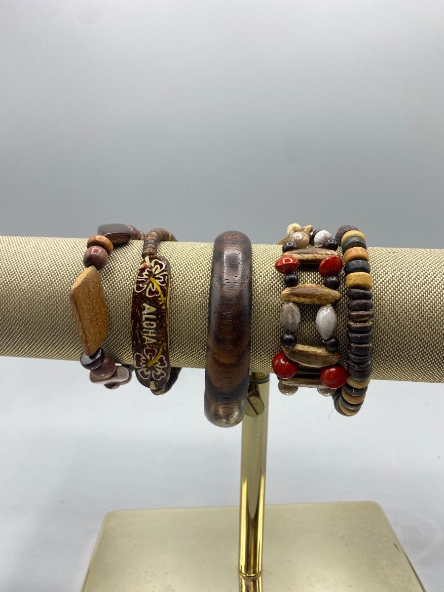 Set of 4 Wood Beaded Stretch & One Wooden Bangle Bracelet. In good condition. One looks like a Hawiian souvenir bracelet. The bangle bracelet is your average size bangle bracelet.