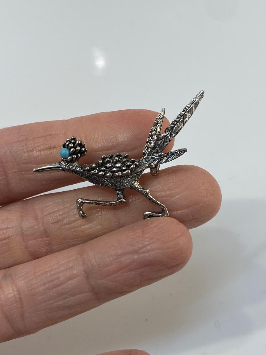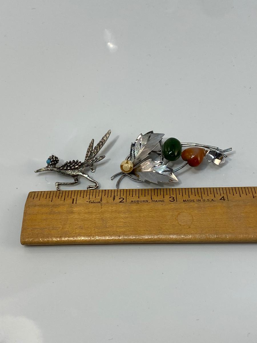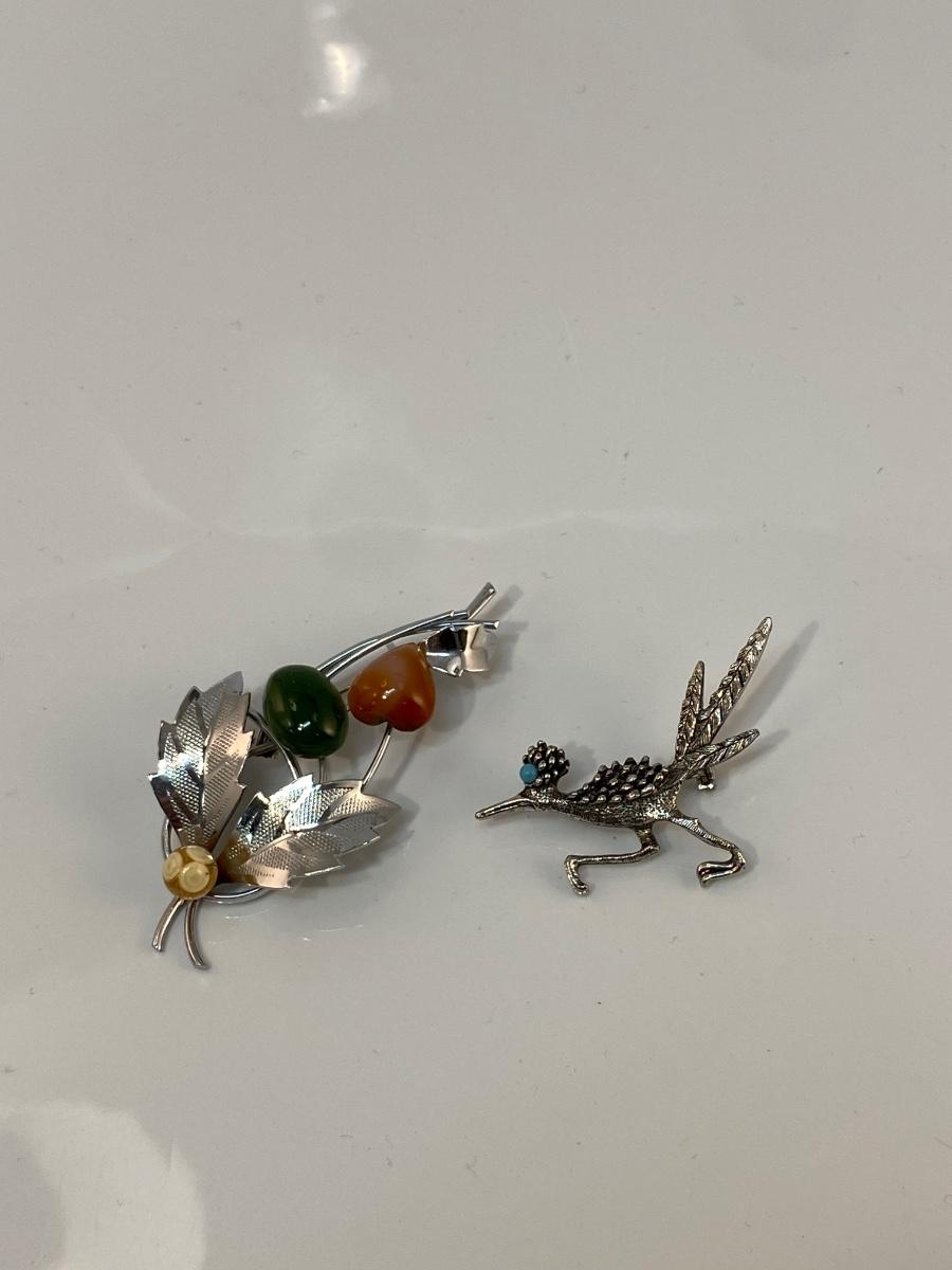 Pair of Silver Tone Vintage Pins Brooches Roadrunner & Leaf with Polished Stones