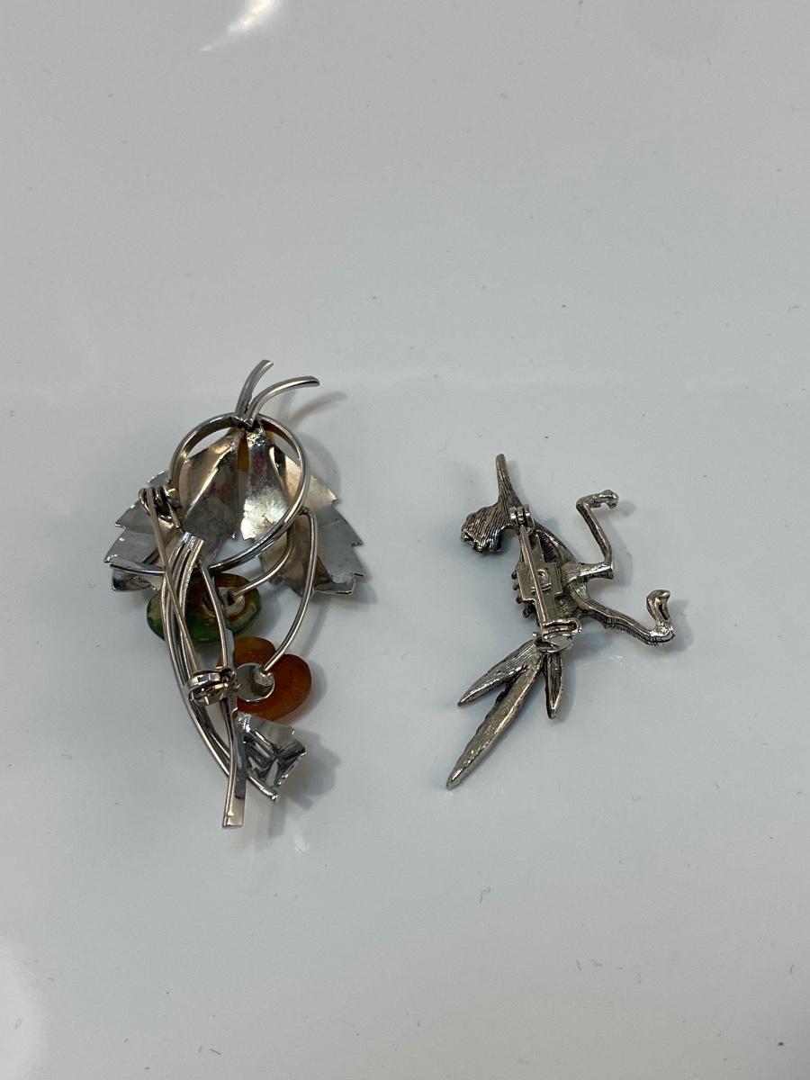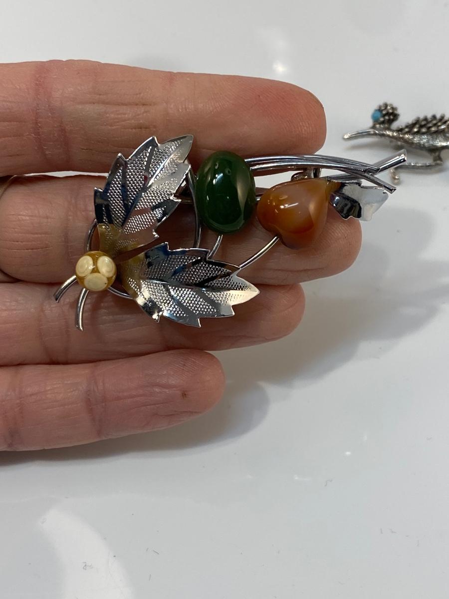 Pair of Silver Tone Vintage Pins Brooches Roadrunner & Leaf with Polished Stones. Both are in good condition. No sterling marks.