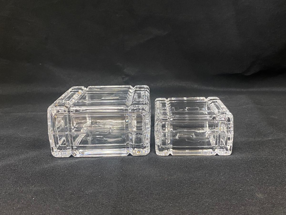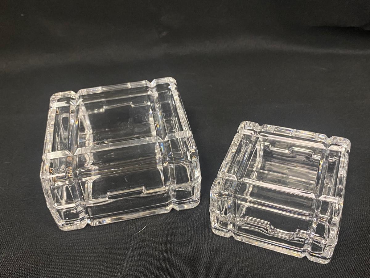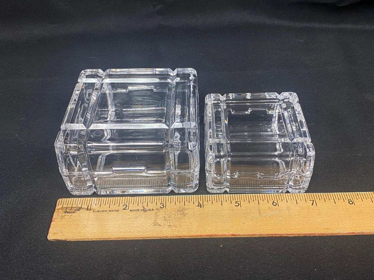 Pair of Retro Cut Glass Crystal Square Jewelry Trinket Boxes. Similar cut patterns just different sizes. Good condition.