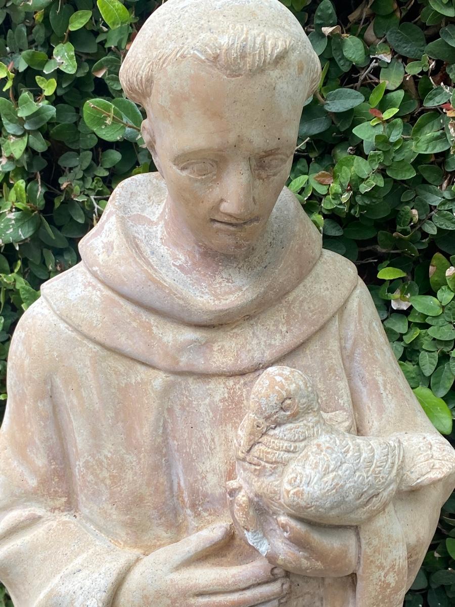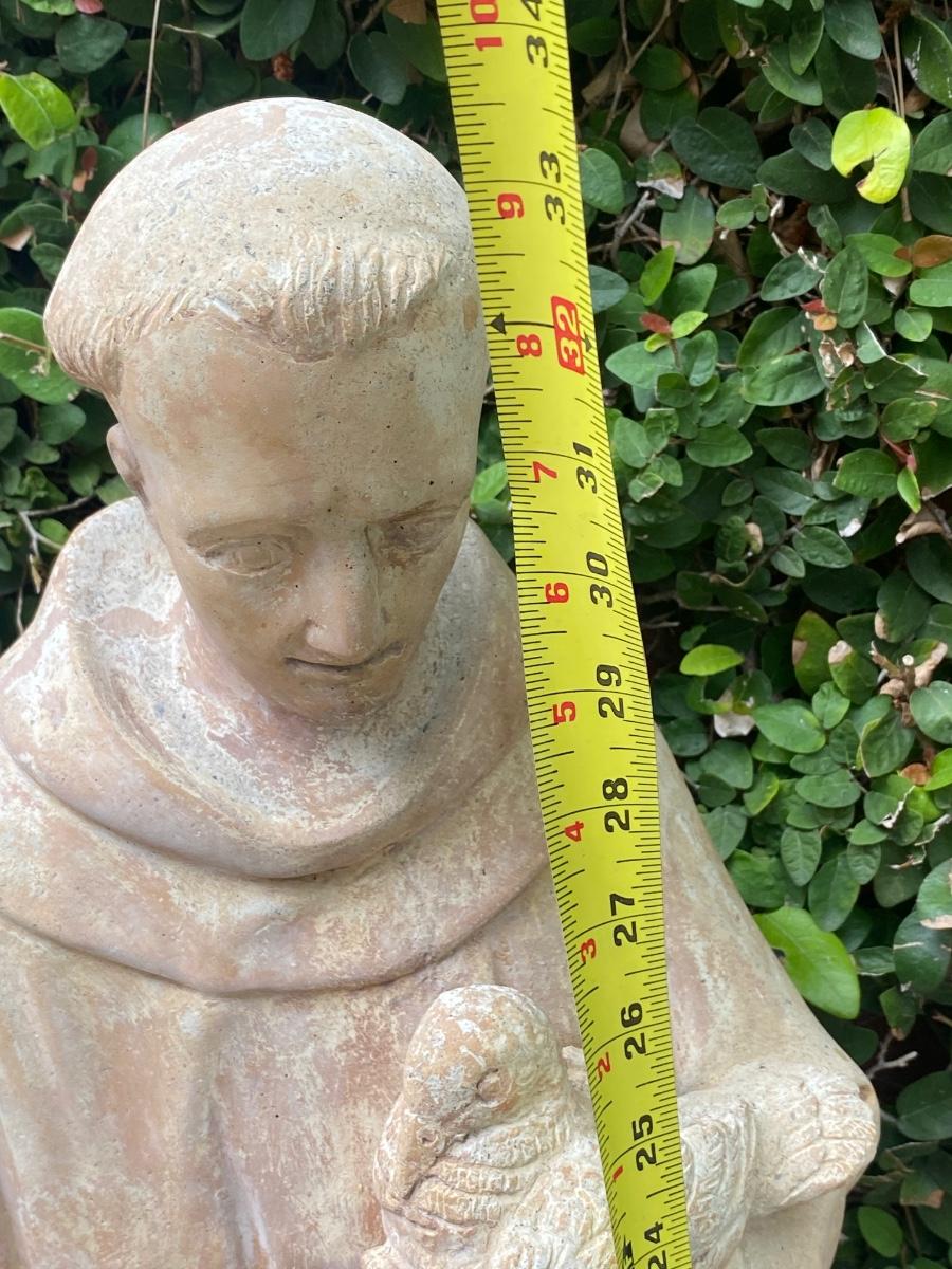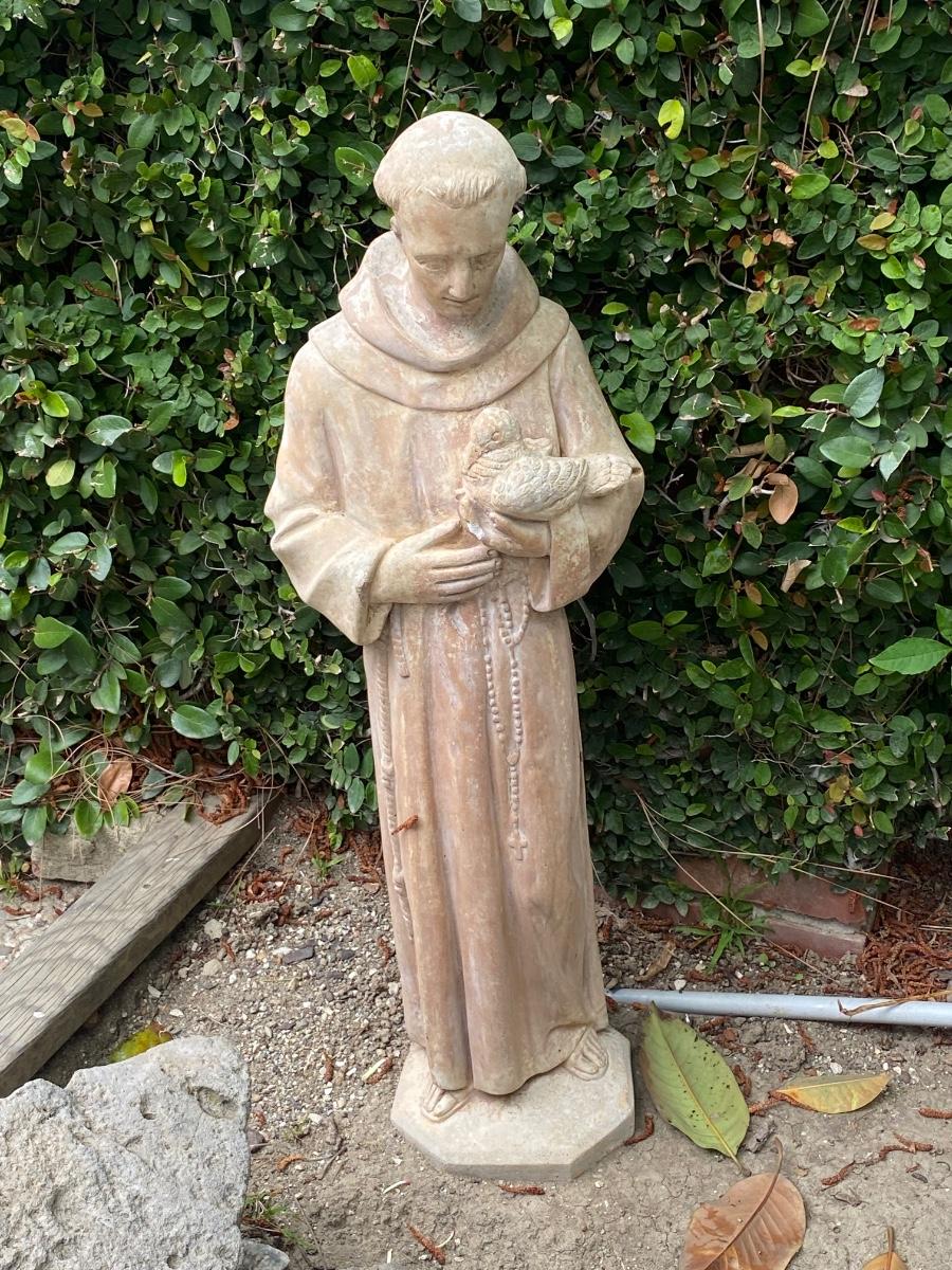 Tall Saint Francis Stone Cement Garden Statue. In good, weathered condition. About 33" tall.