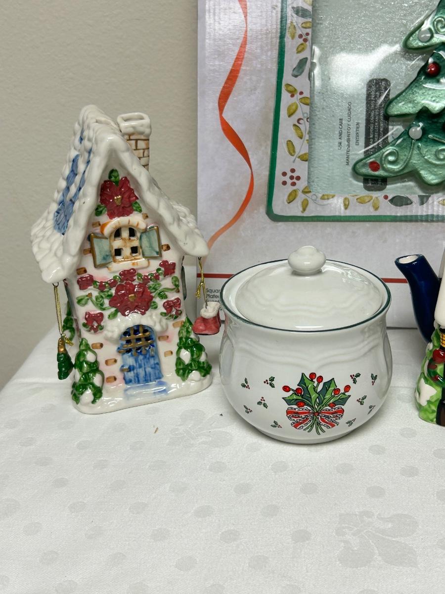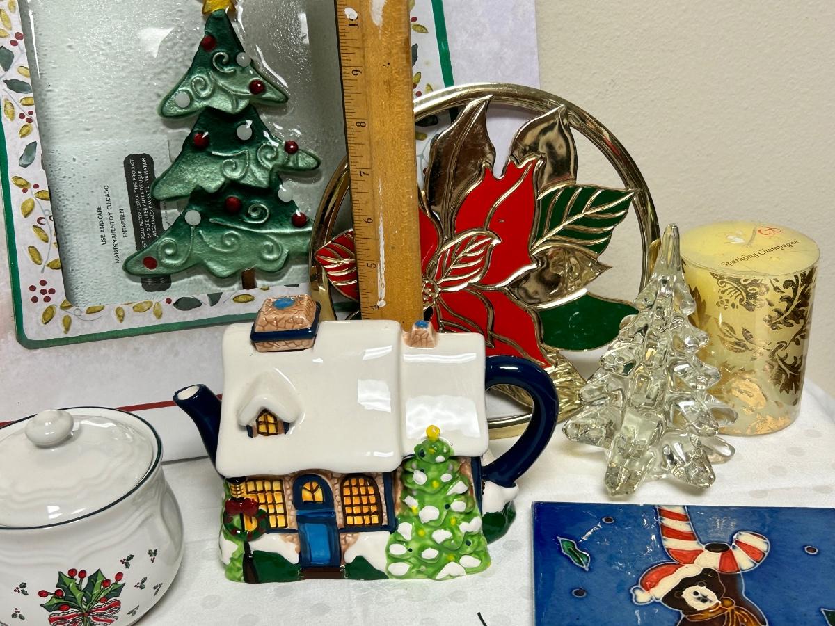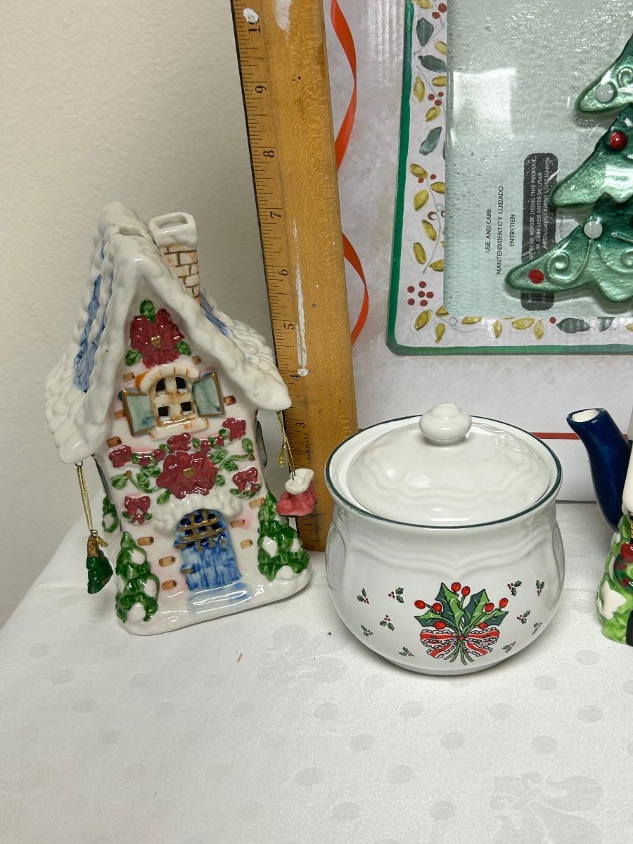 Christmas Holiday Kitchen Decor Serving Pieces Teapot Platter Sugar Bowl. Mixed lot of serving pieces and decor. in good previously owned condition.