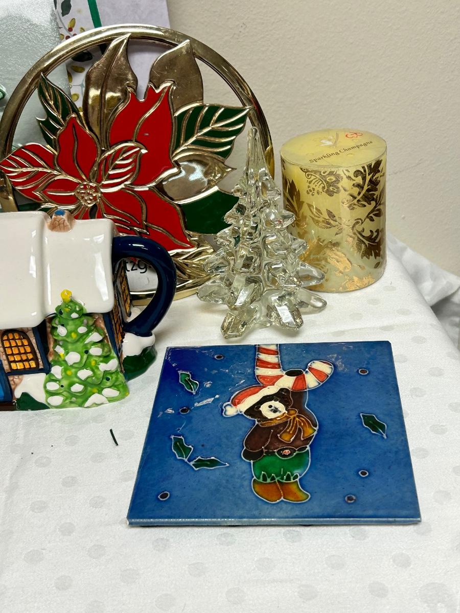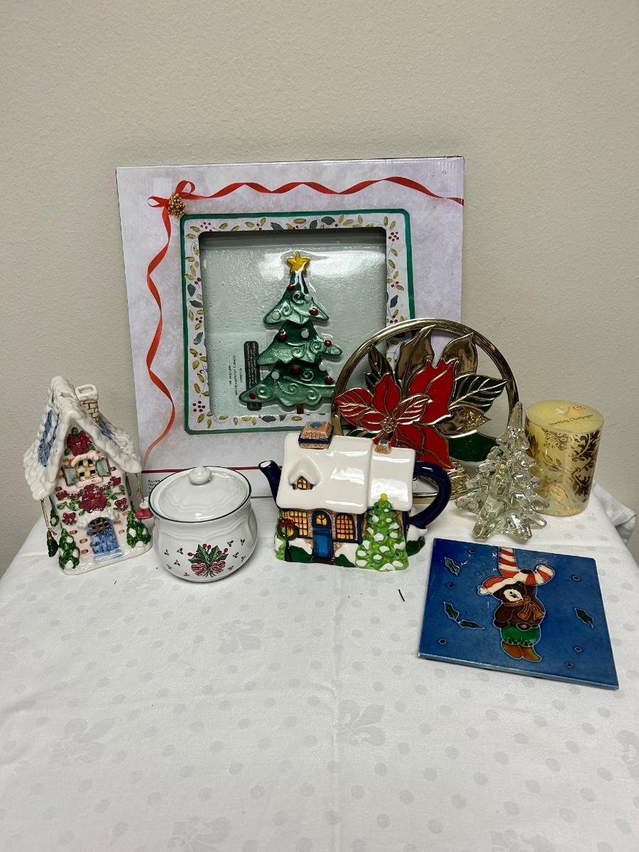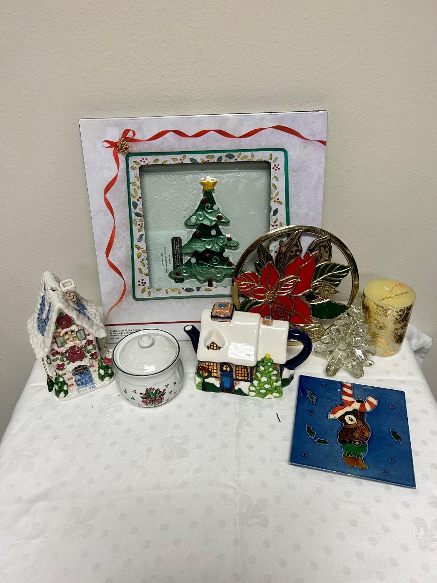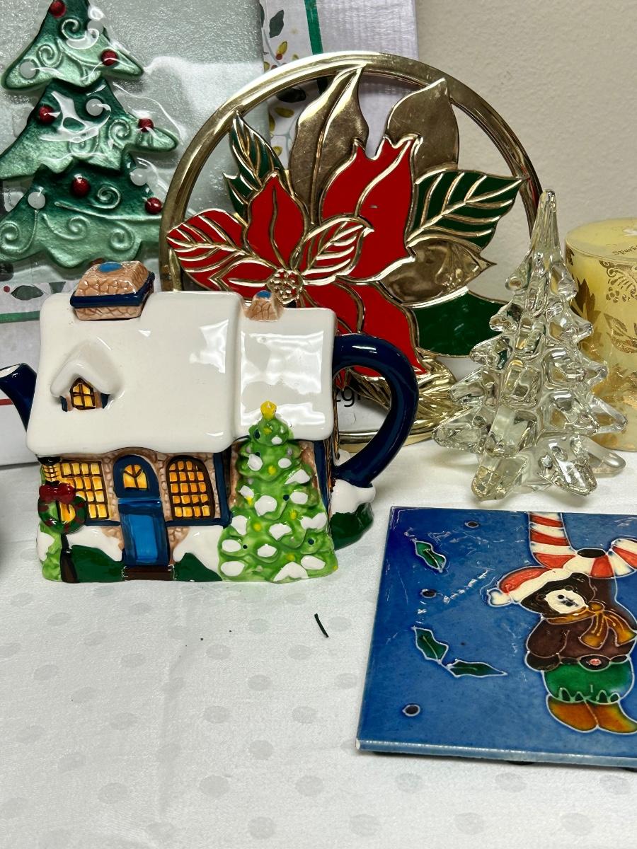 Christmas Holiday Kitchen Decor Serving Pieces Teapot Platter Sugar Bowl. Mixed lot of serving pieces and decor. in good previously owned condition.