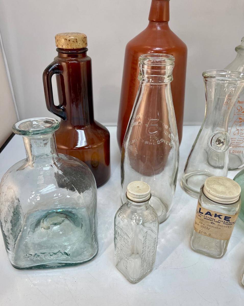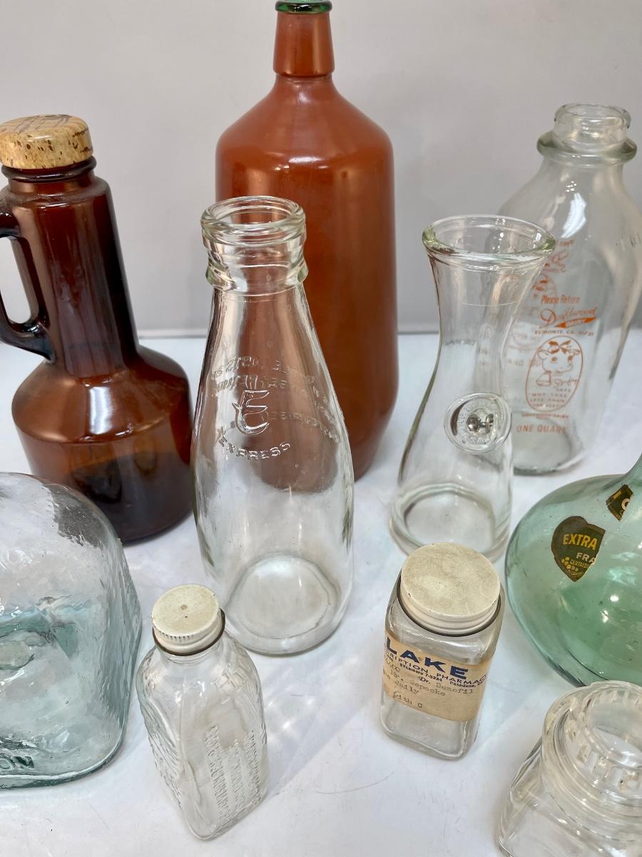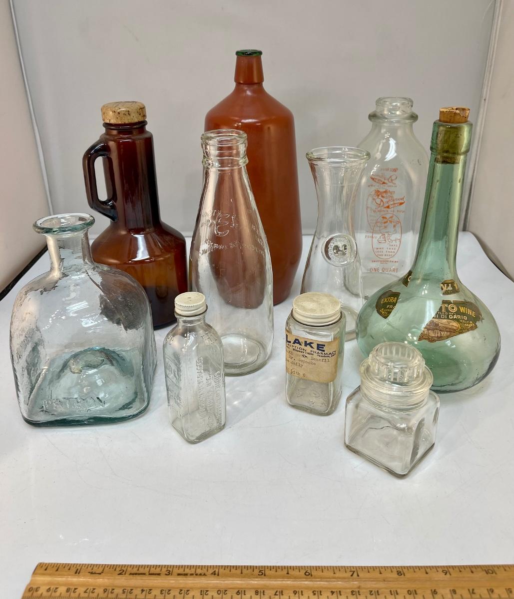 Mixed Lot of Various Size and Colored Glass Bottle Jars Decanters. Great mix of shape and size. In vintage conditions.