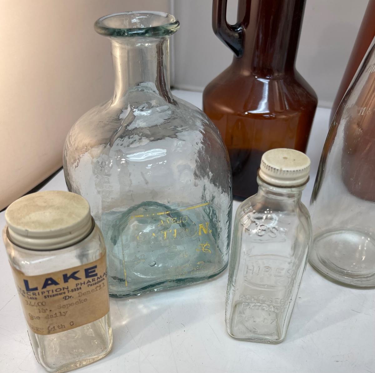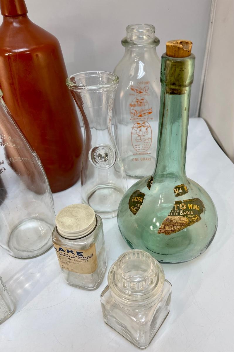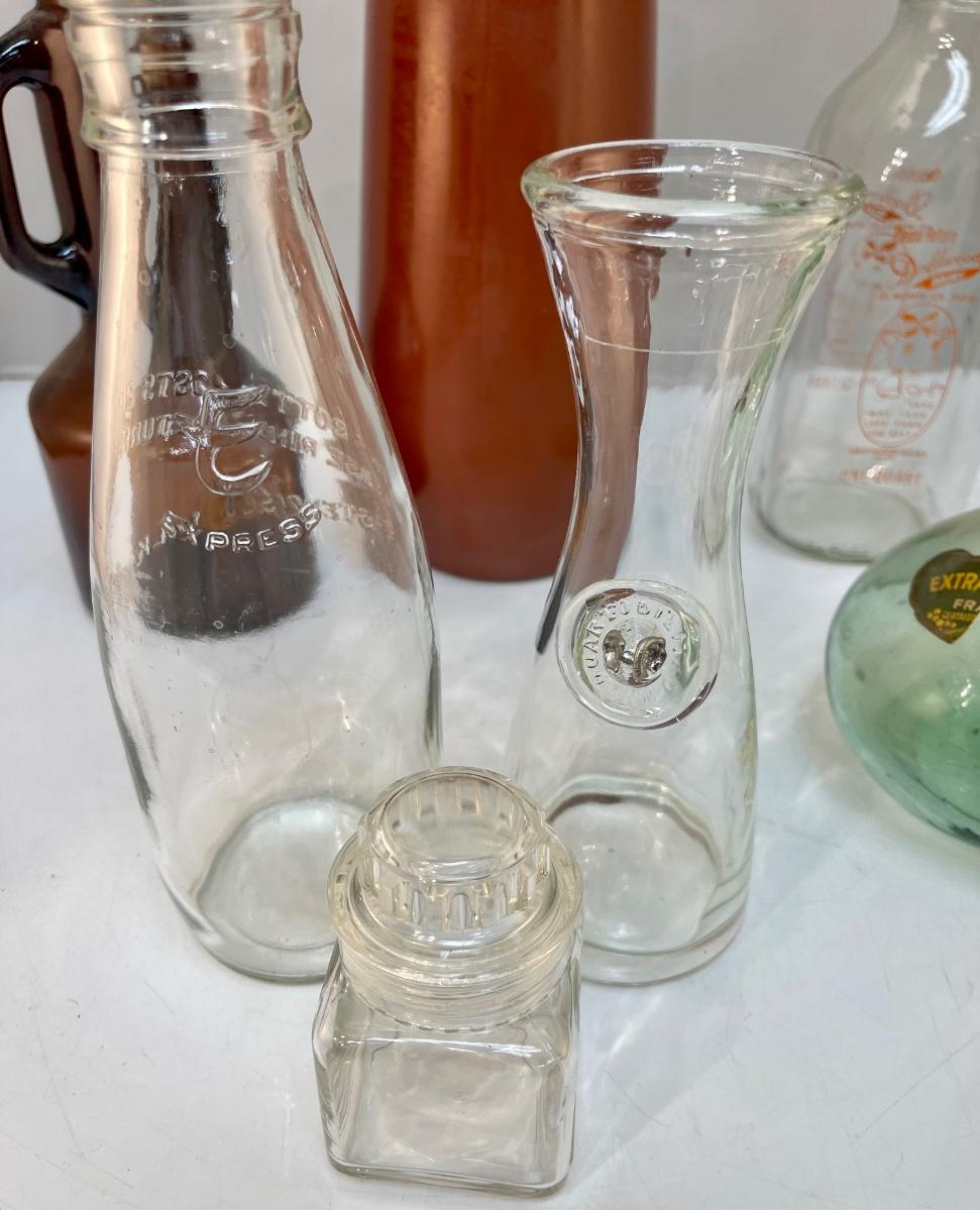 Mixed Lot of Various Size and Colored Glass Bottle Jars Decanters. Great mix of shape and size. In vintage conditions.