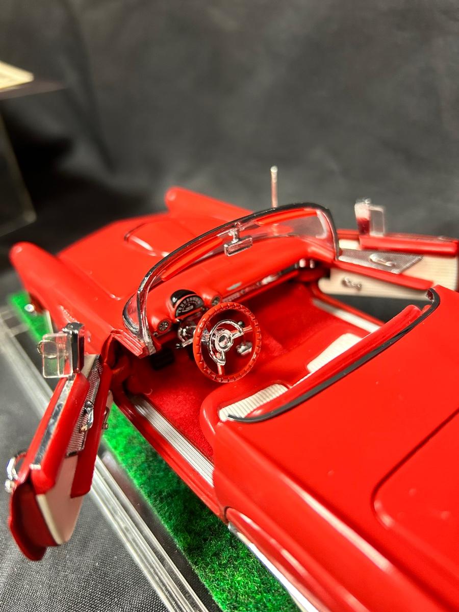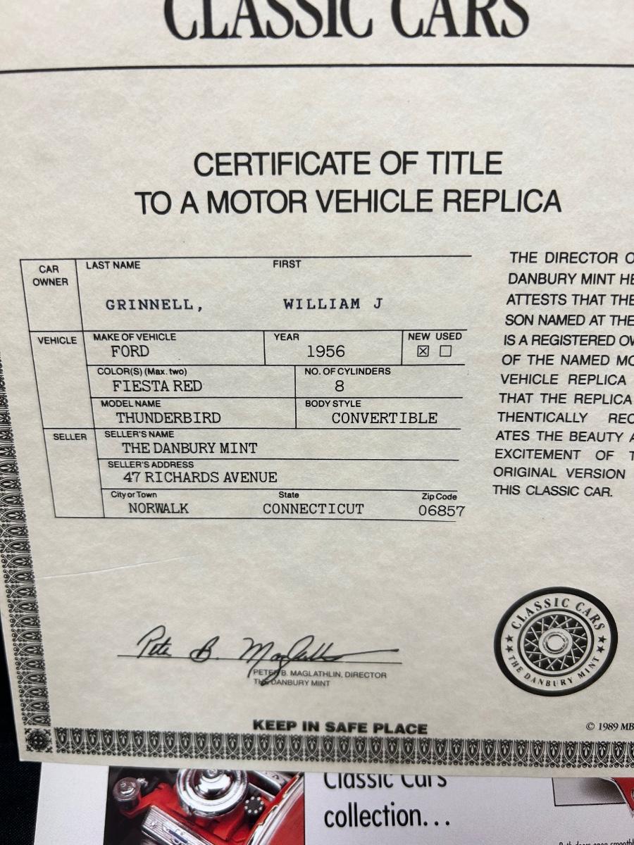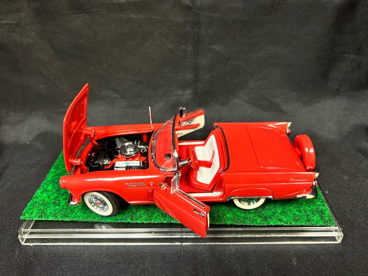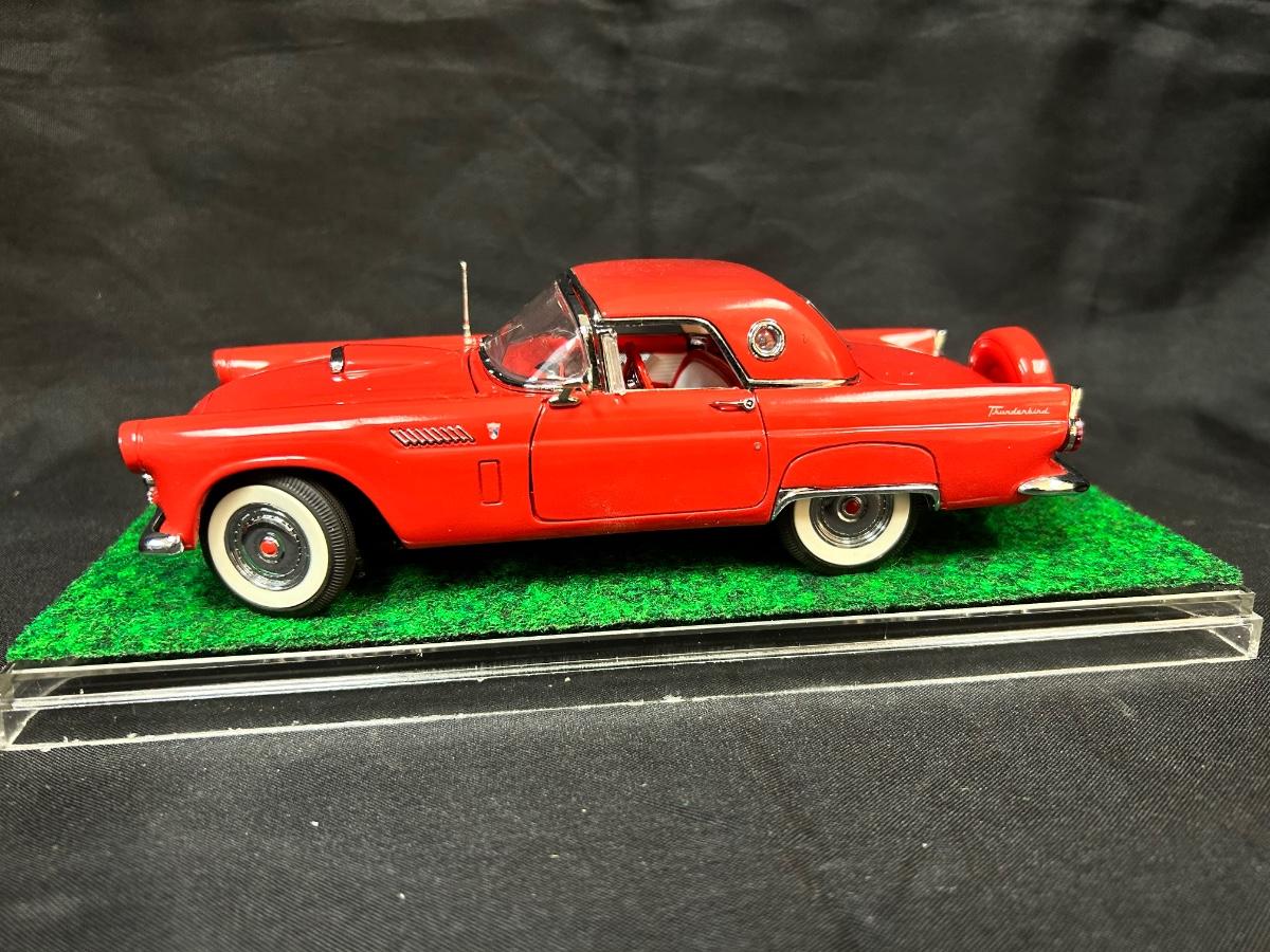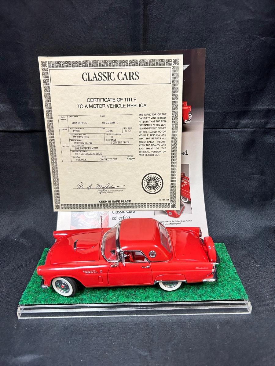 1956 Ford Thunderbird Convertible Fiesta Red Premium Scale Model Car Auto Automobile with COA Danbury Mint. In good collector condition. Hard top convertible Ford Thunderbird comes with COA. Hood and doors open, steering wheel control front end. Comes with plastic display box but the box shows signs of age from years of storage. About 8" size.