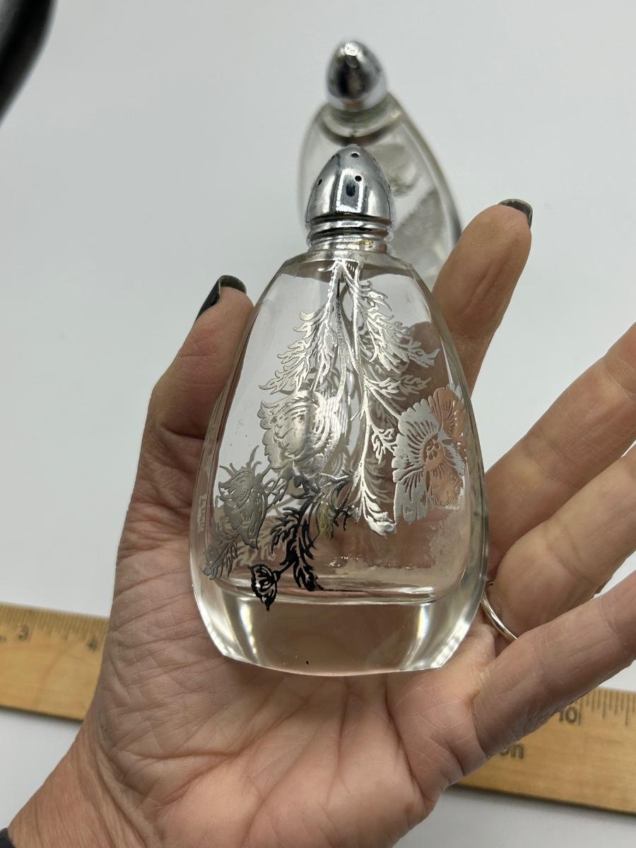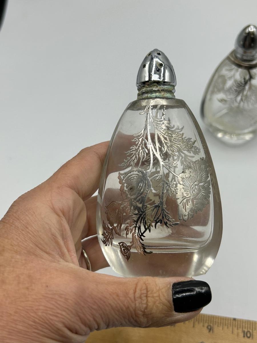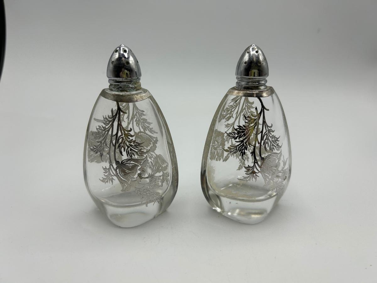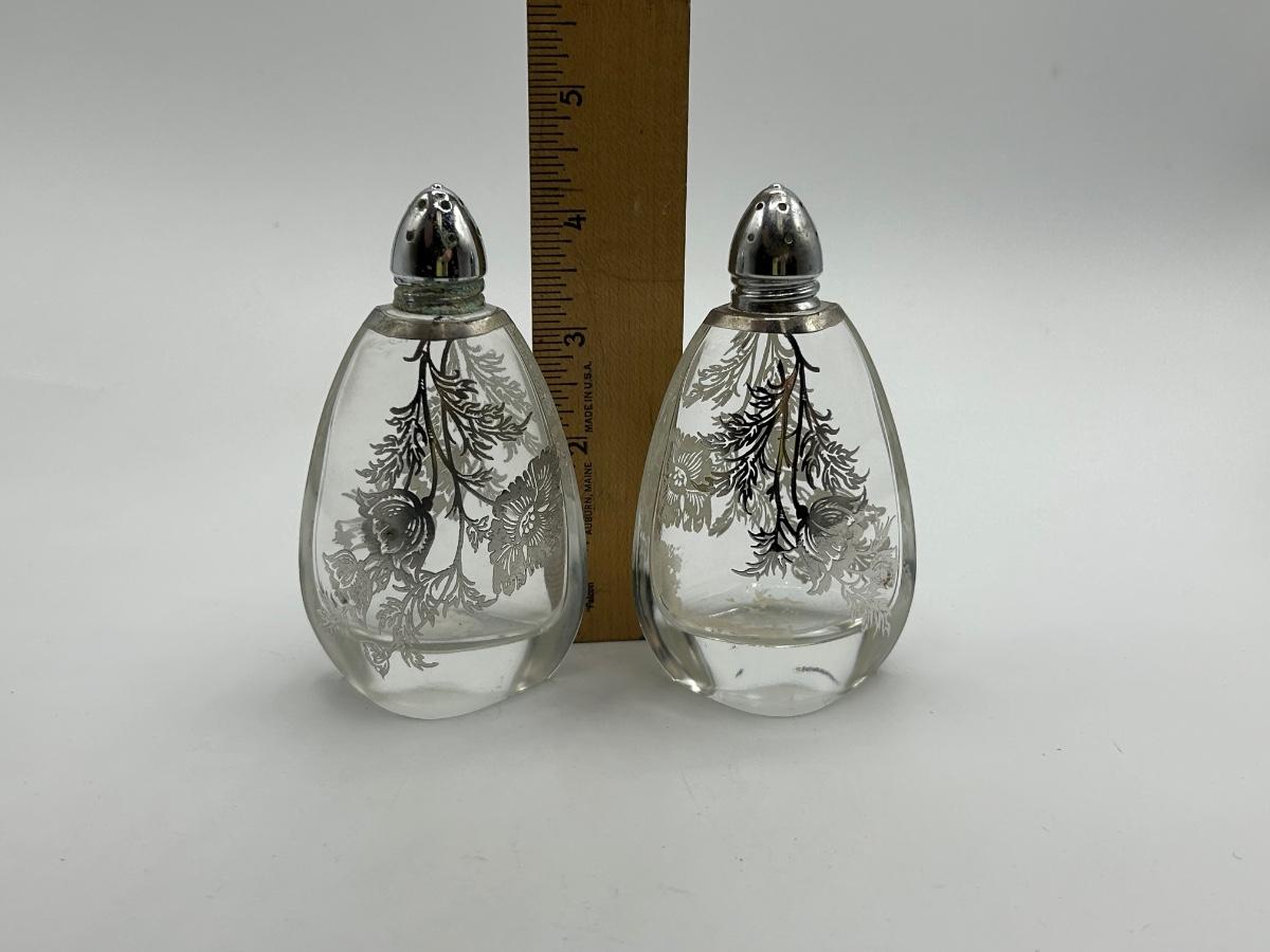Pair of Vintage Silver Over Glass Floral Pattern Salt and Pepper Shakers