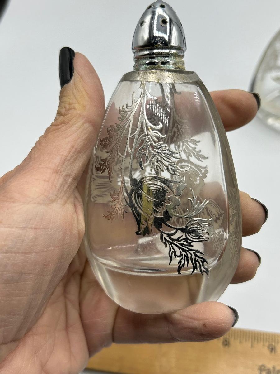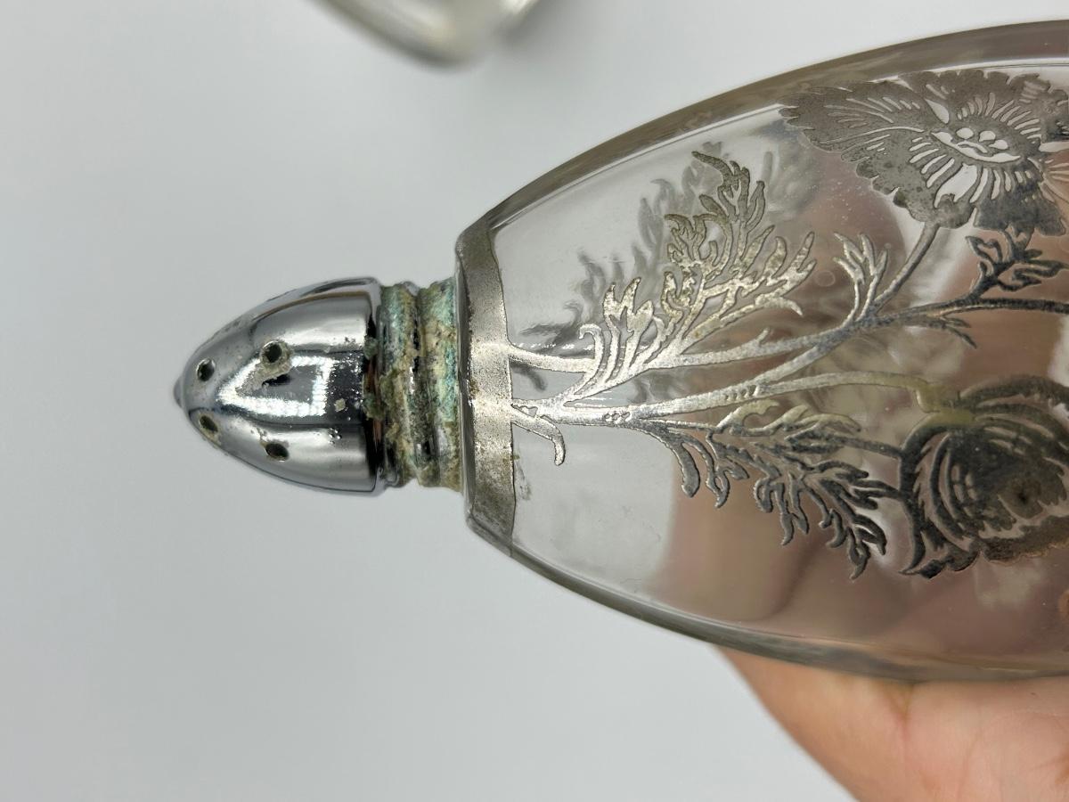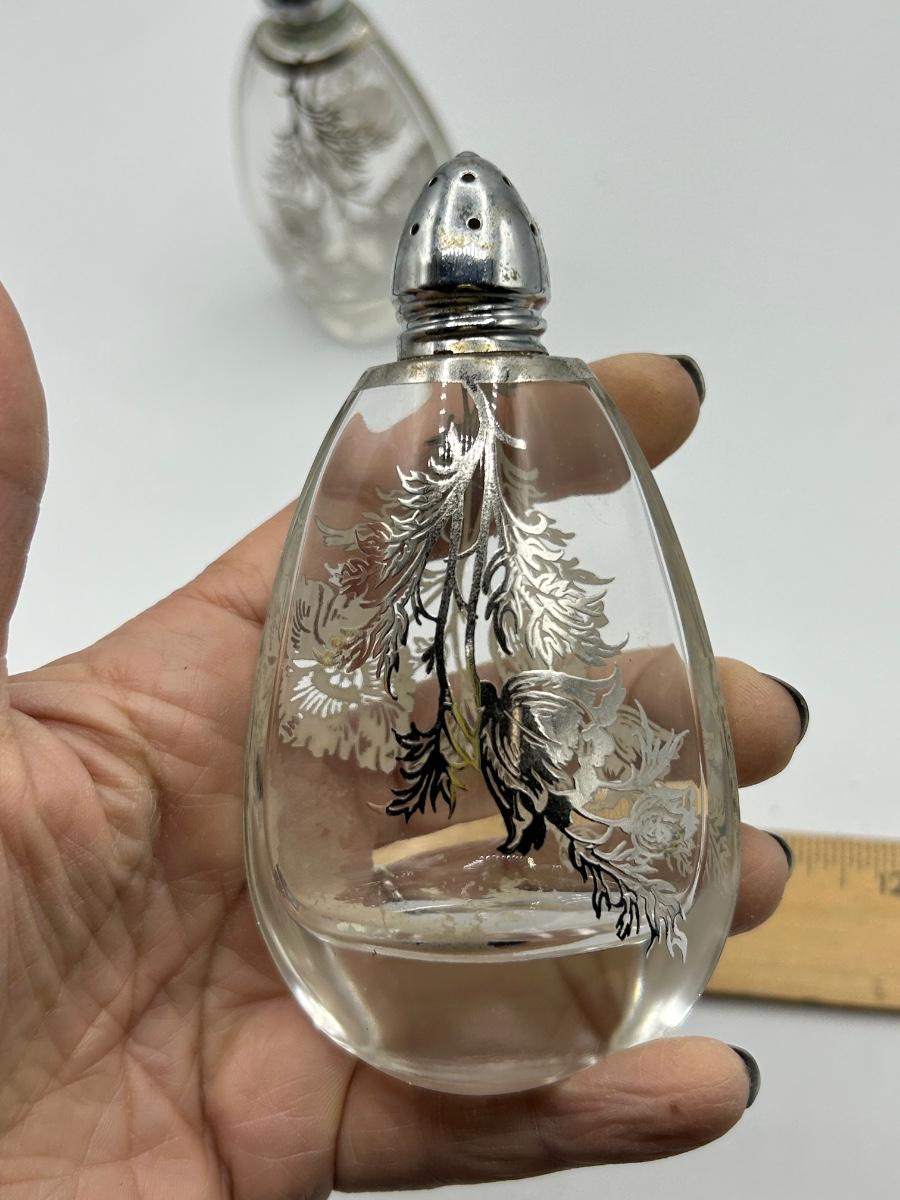Pair of Vintage Silver Over Glass Floral Pattern Salt and Pepper Shakers. Did not find any sterling marks. The salt shaker is a little corroded from salt, may need to soak in vinegar to open. Display nicely.