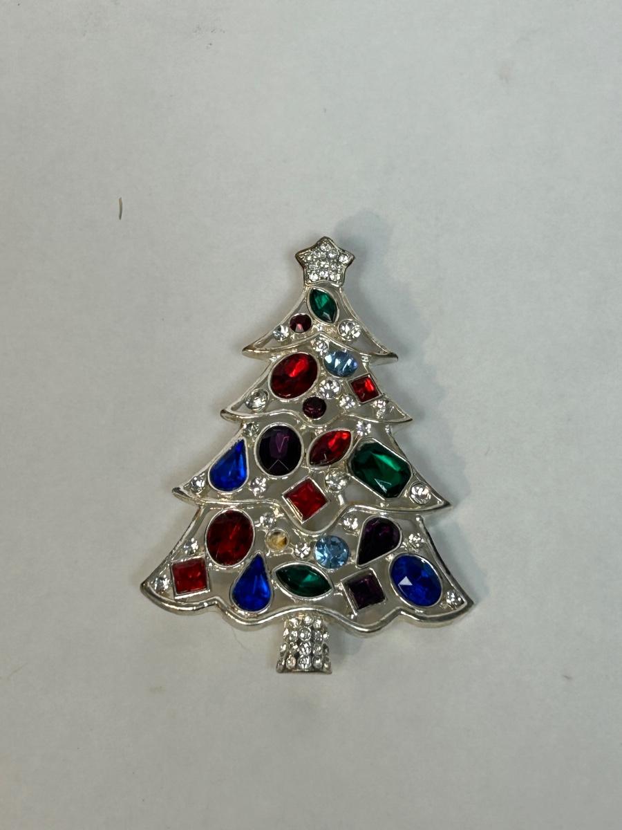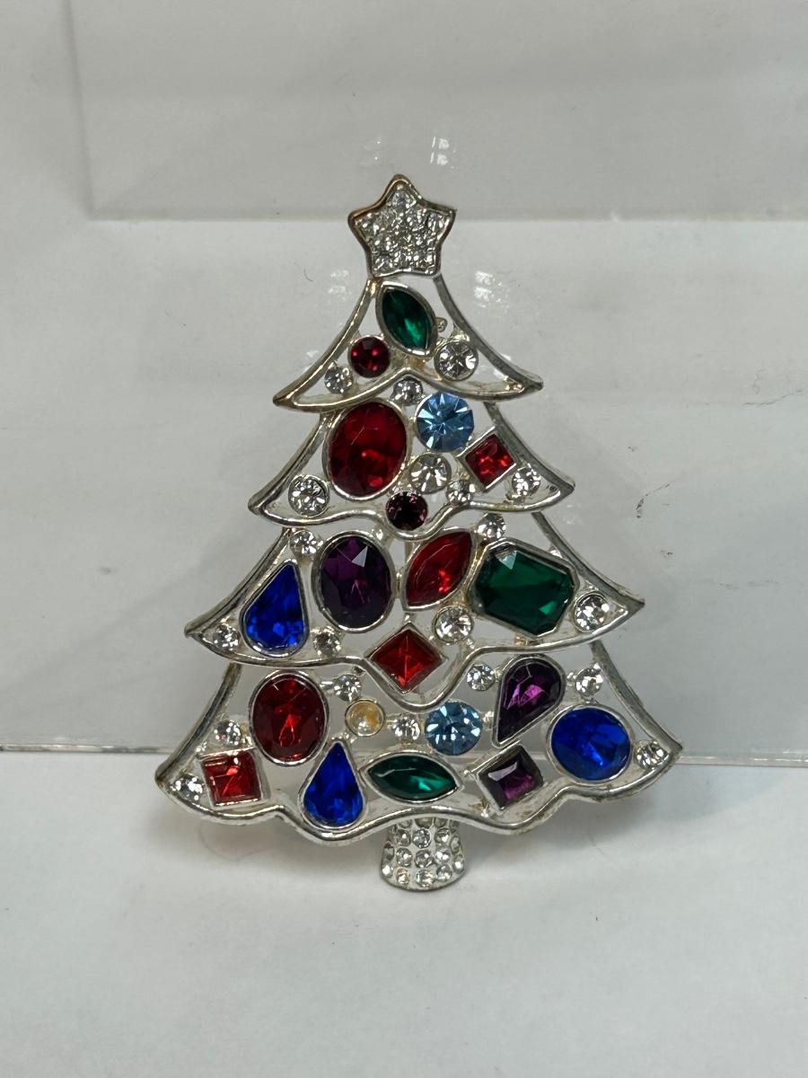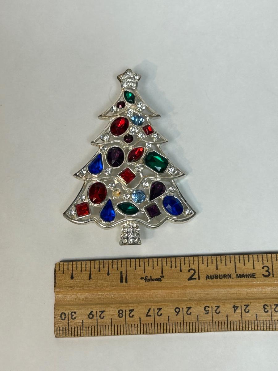 Silver Tone Christmas Holiday Tree Pin Brooch with Jewel Like Rhinestones. In good condition. There is a small missing rhinestone near the bottom of the pin, but it doesn't stand out too much. Under 3" size.