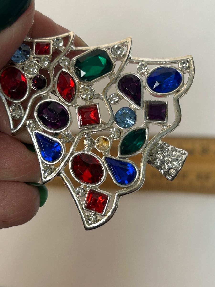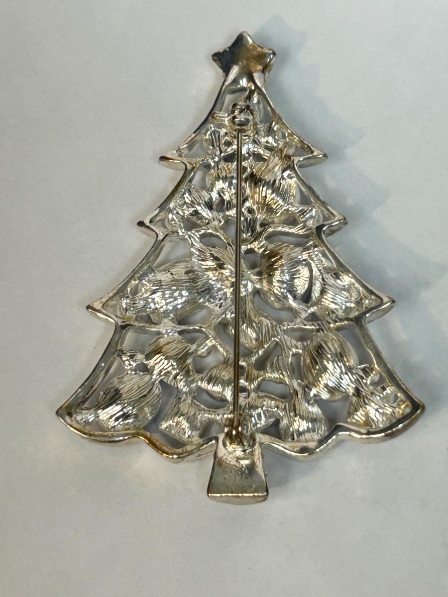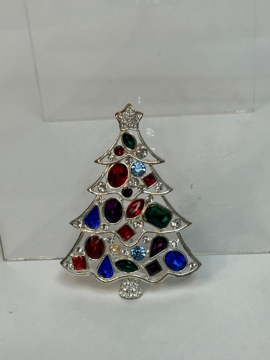 Silver Tone Christmas Holiday Tree Pin Brooch with Jewel Like Rhinestones. In good condition. There is a small missing rhinestone near the bottom of the pin, but it doesn't stand out too much. Under 3" size.