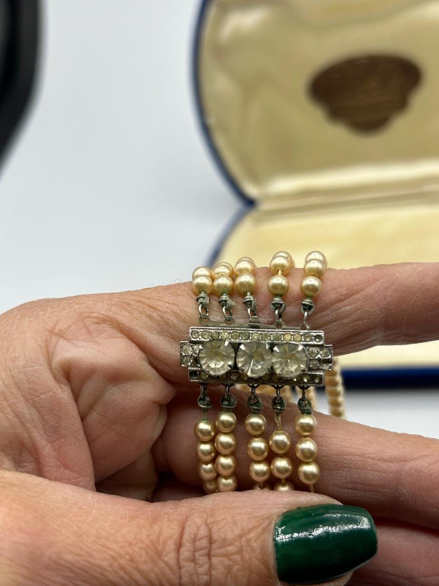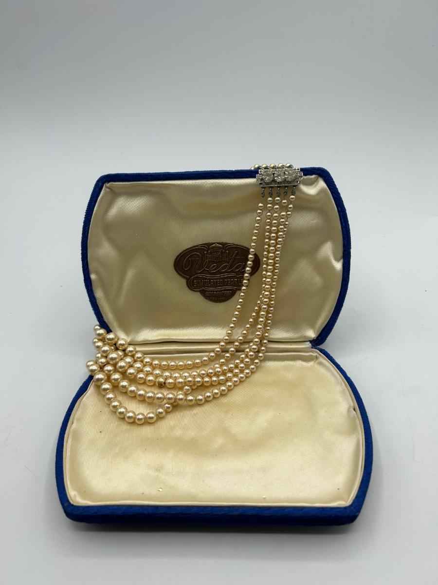 Vintage Veda Simulated Pearls Choker Style Necklace Five Strand Rhinestone Clasp. In good condition. On the heavy side for a necklace. Comes with velvet box.