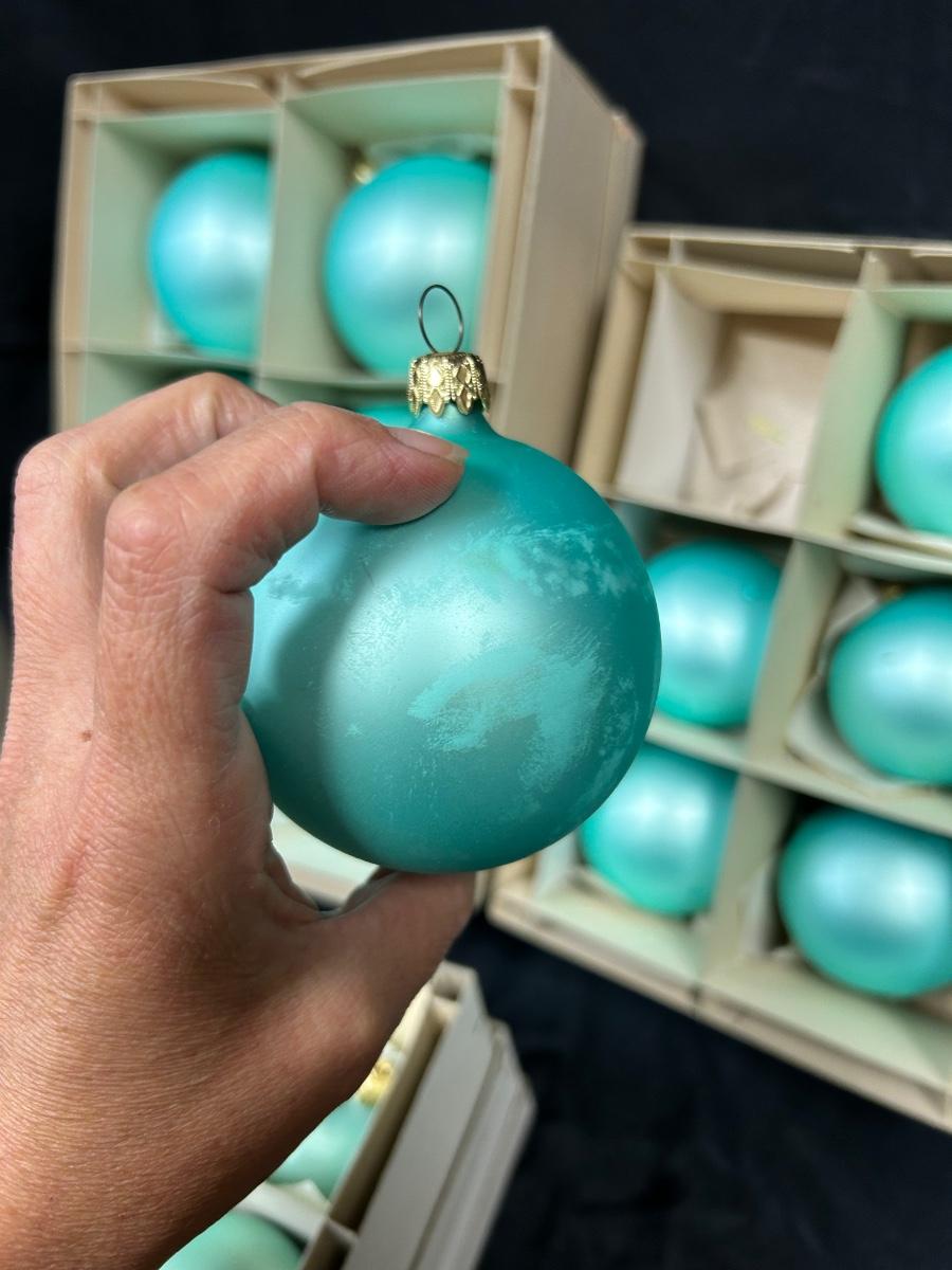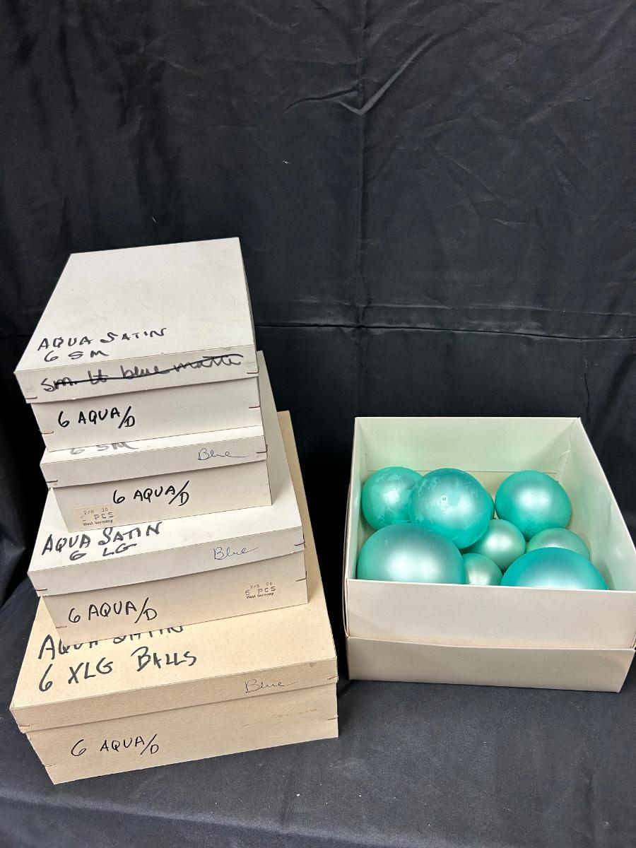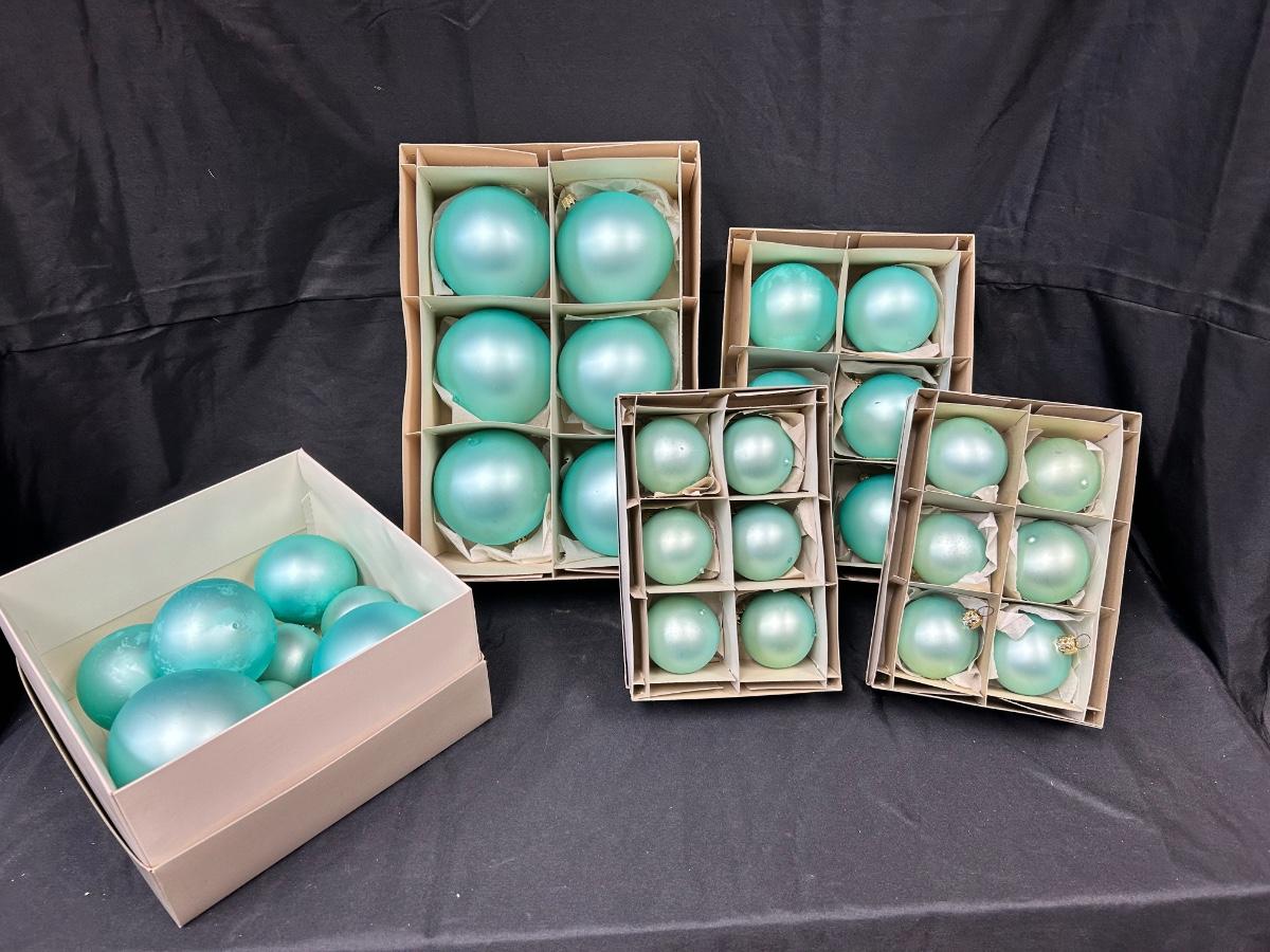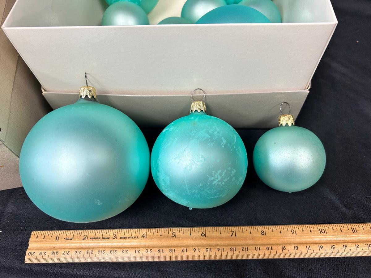 Lot of Turquoise Satin Blue Blown Glass Christmas Holiday Ornaments Three Sizes. In good vintage condition. Hand blown glass, slight variation in each ornament, not perfectly round. None seem to have damage just some discoloration spots from age. 35 total ornaments, 8 large, 9 medium, 18 small.