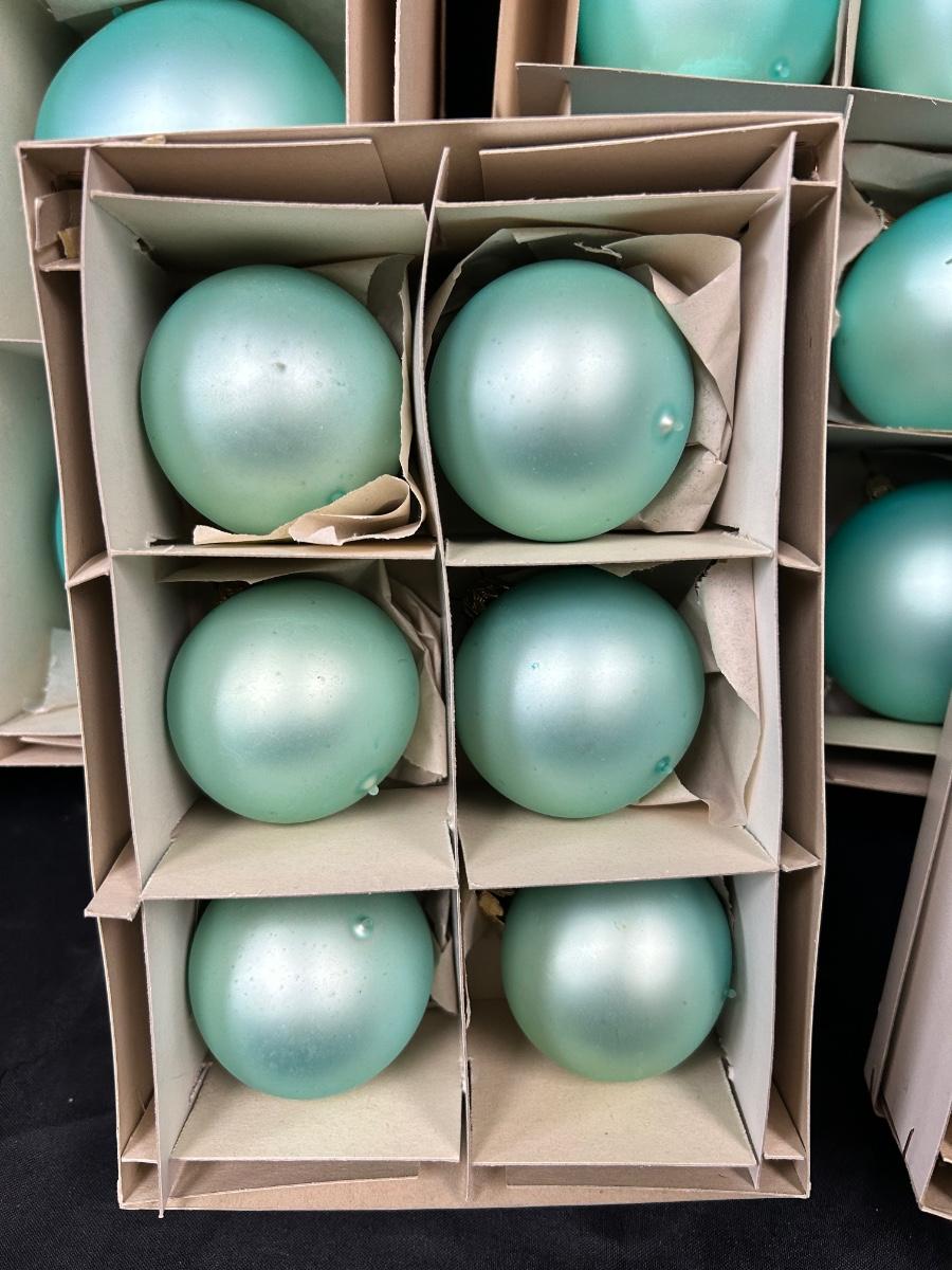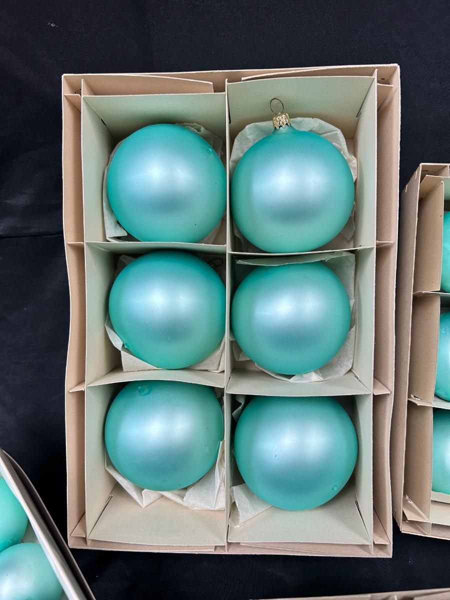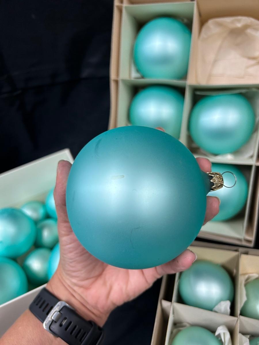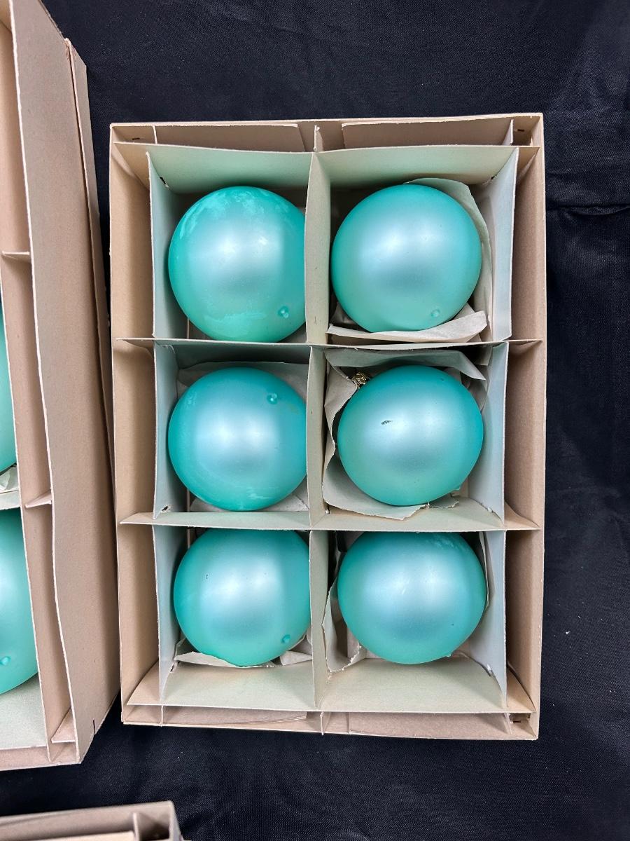 Lot of Turquoise Satin Blue Blown Glass Christmas Holiday Ornaments Three Sizes. In good vintage condition. Hand blown glass, slight variation in each ornament, not perfectly round. None seem to have damage just some discoloration spots from age. 35 total ornaments, 8 large, 9 medium, 18 small.