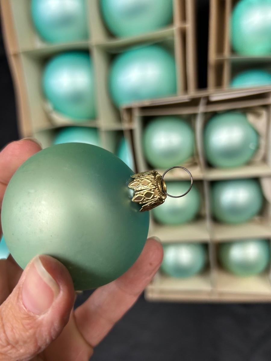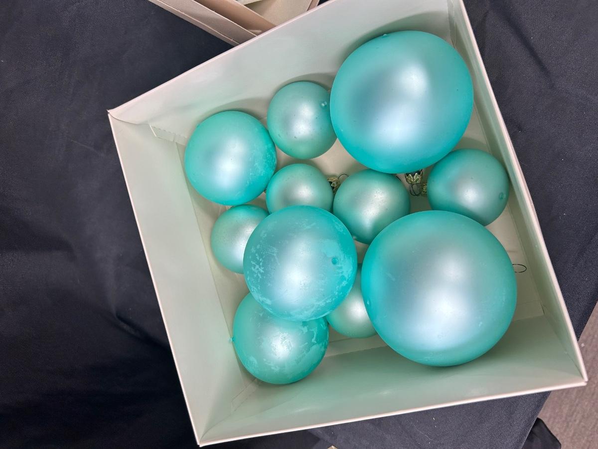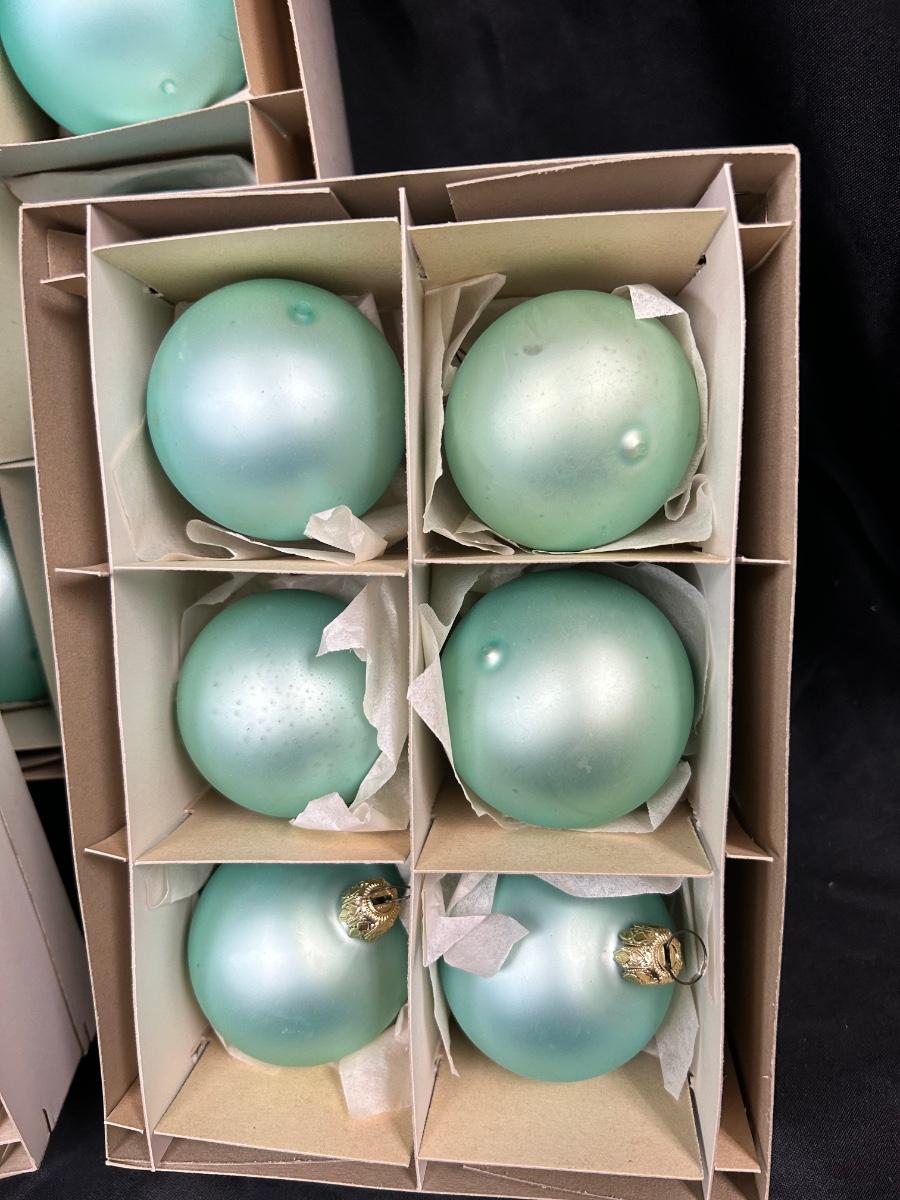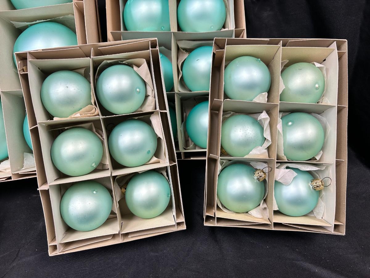 Lot of Turquoise Satin Blue Blown Glass Christmas Holiday Ornaments Three Sizes. In good vintage condition. Hand blown glass, slight variation in each ornament, not perfectly round. None seem to have damage just some discoloration spots from age. 35 total ornaments, 8 large, 9 medium, 18 small.