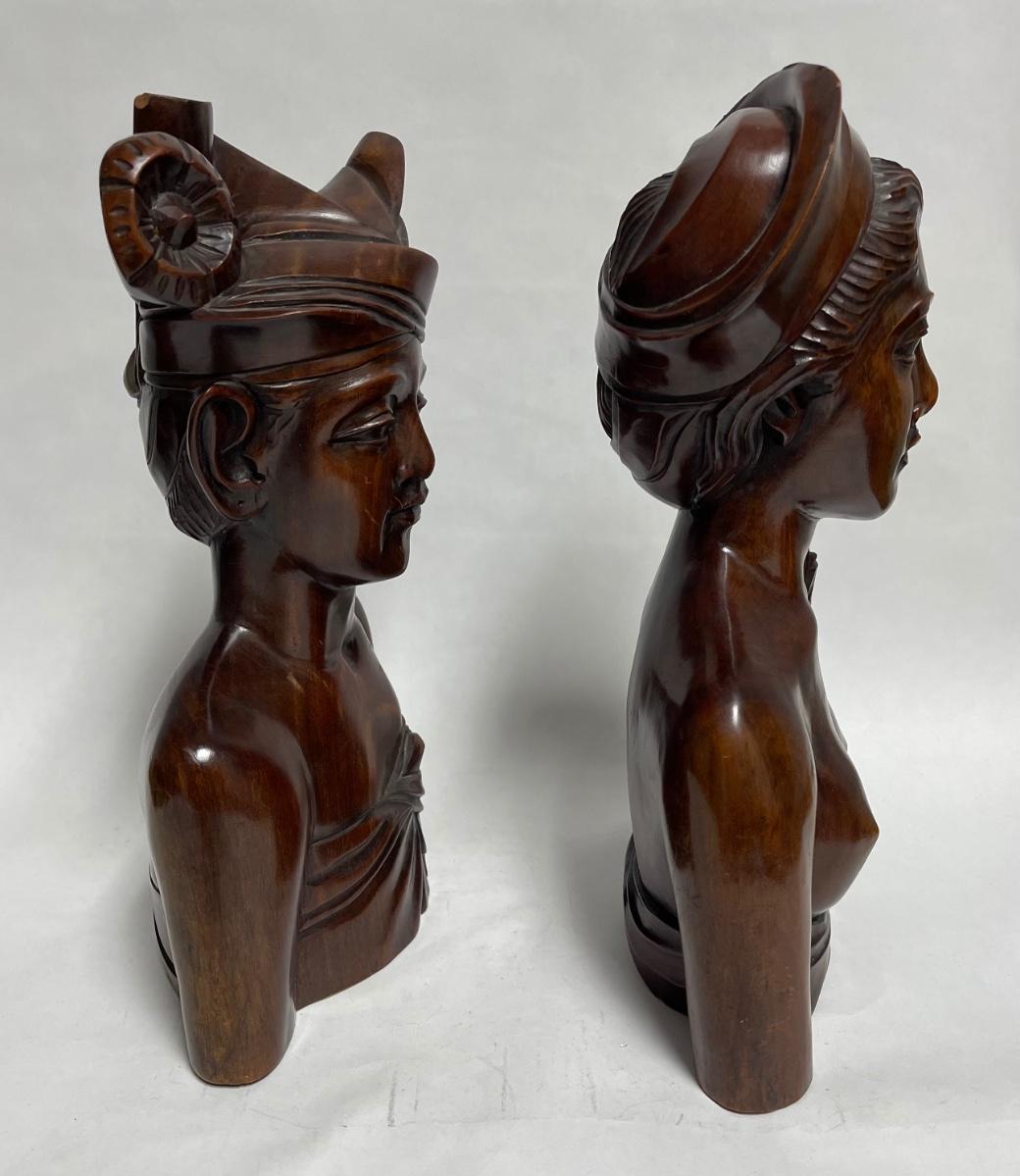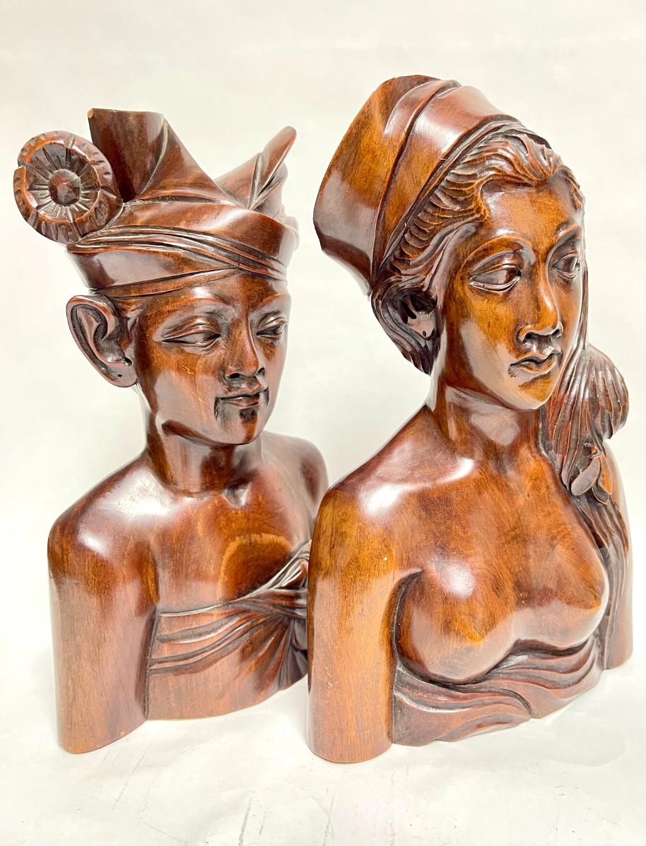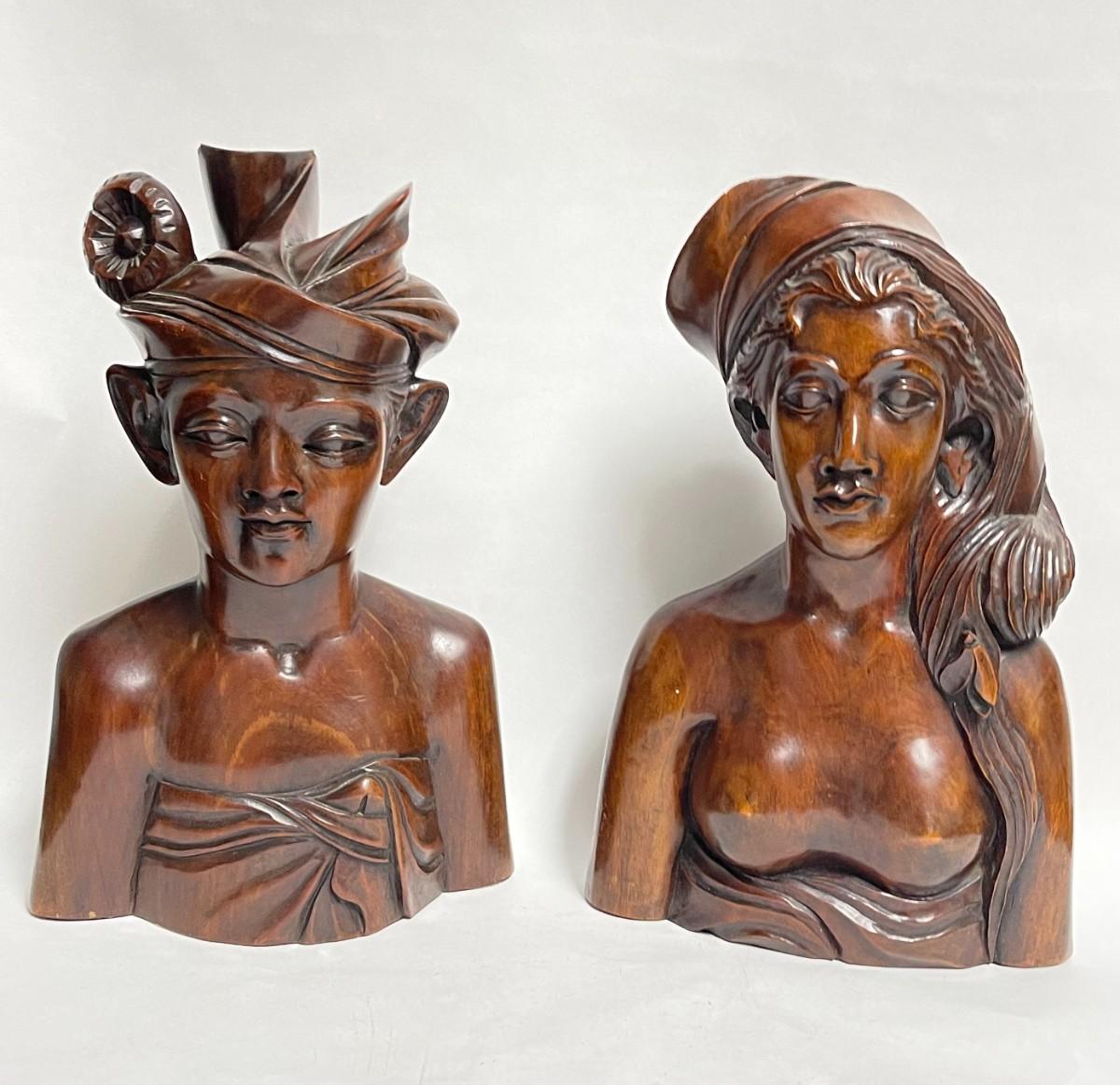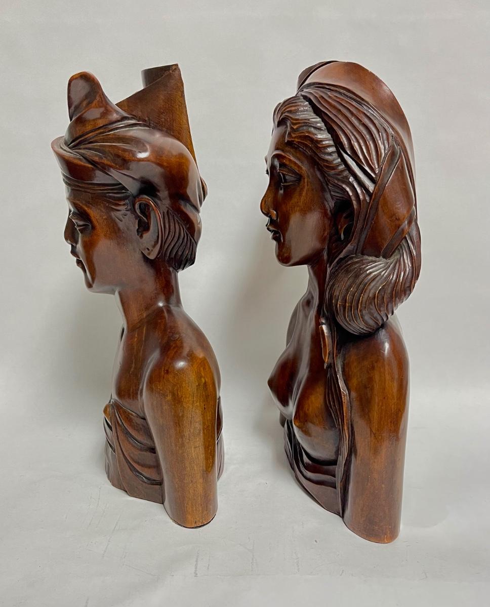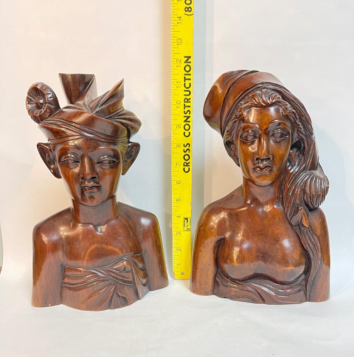 antique Carved Ballinese Indonesian Bali Couple Man and Lady nude bust wood carving sculpture