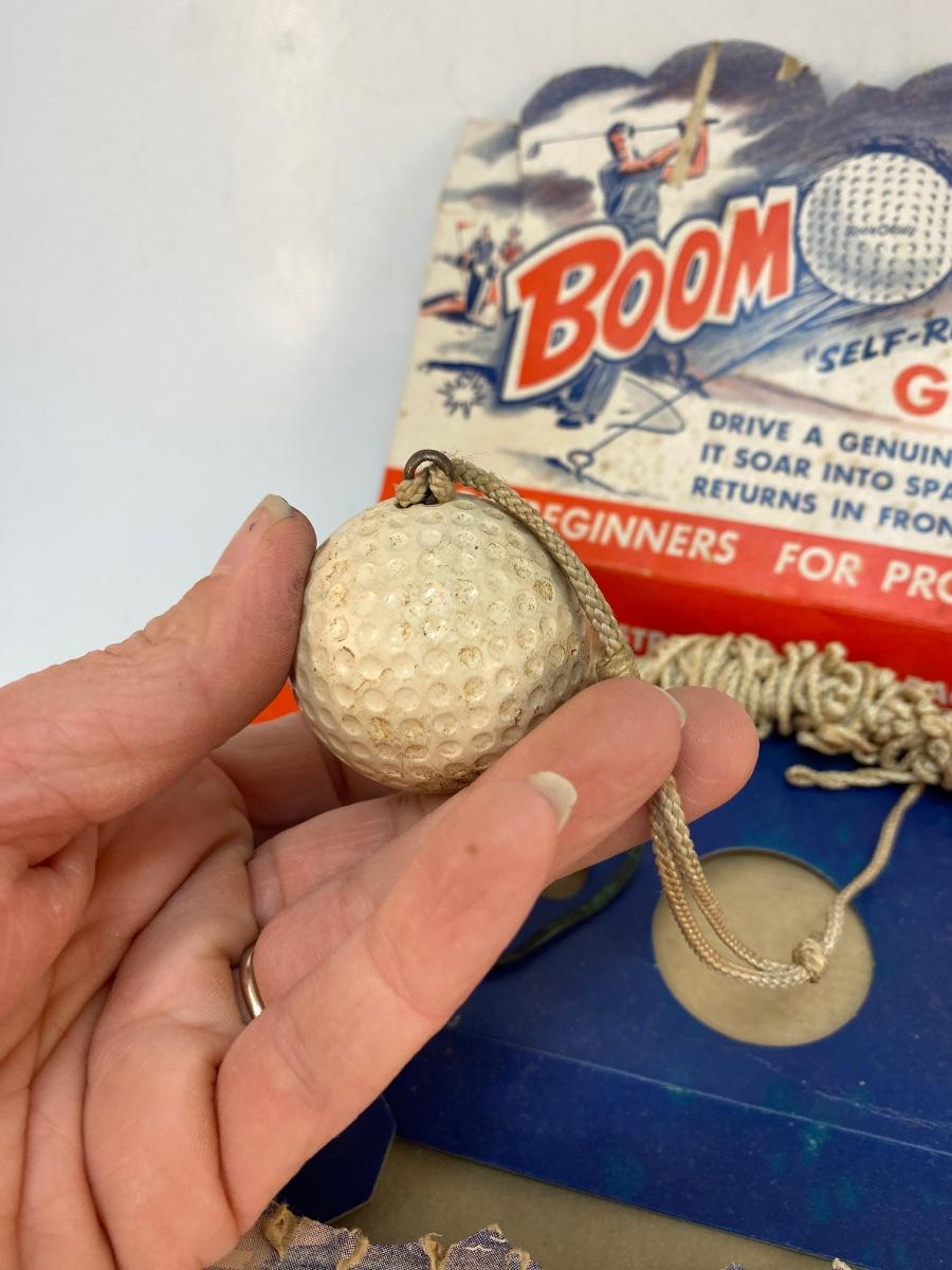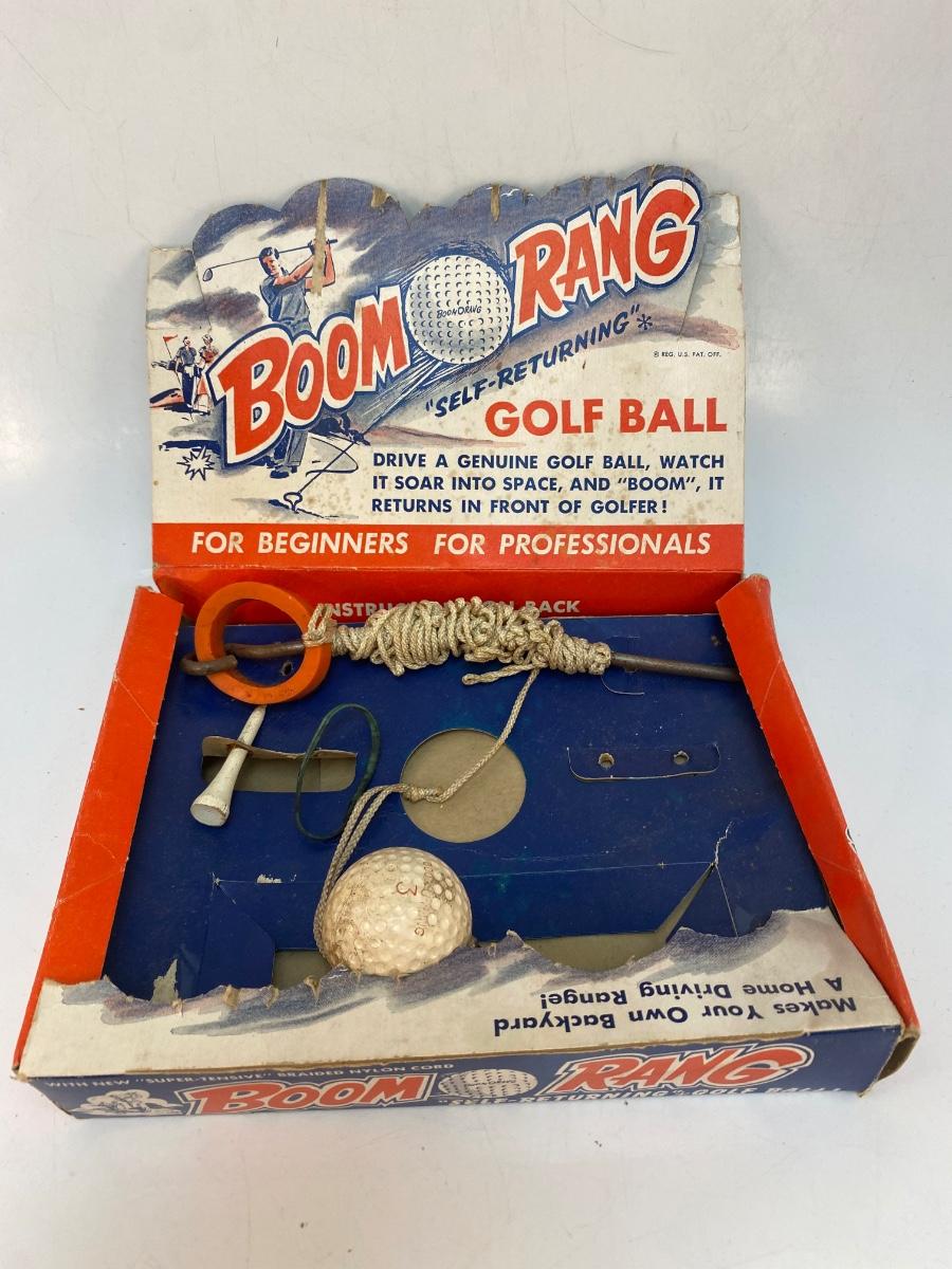 Vintage BOOM O RANG Self Returning Golf Ball Golfing Trainer. In original box. Box has instructions on the back side. Made to hit with club and pull string to retrieve ball. Great for practicing ones swing just about anywhere.
