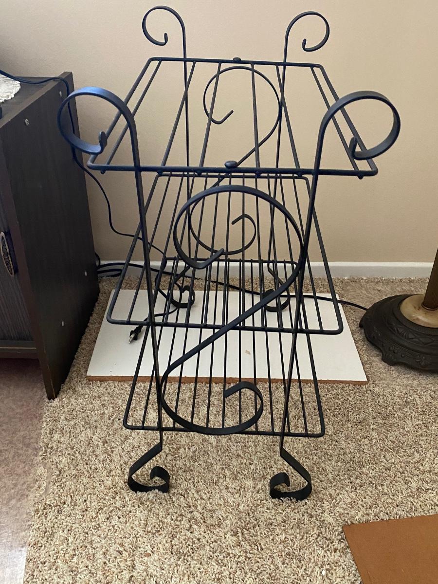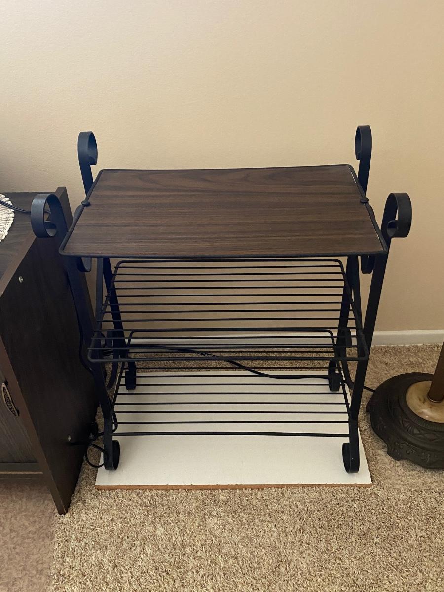 Small Three Tier Black Metal Wrought Iron Side Table Plant Stand with Removeable Top. In good used condition. Wood top can be removed easily, piece slides into place.