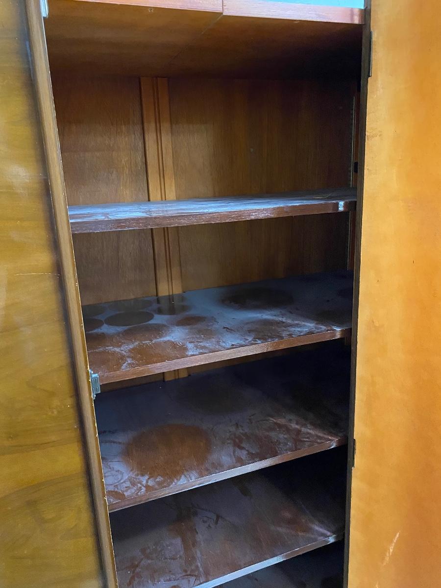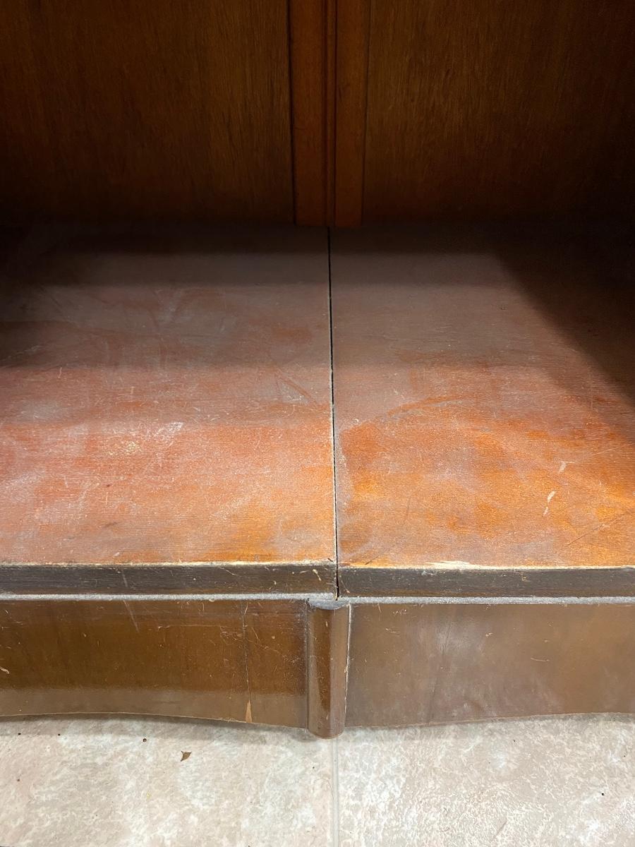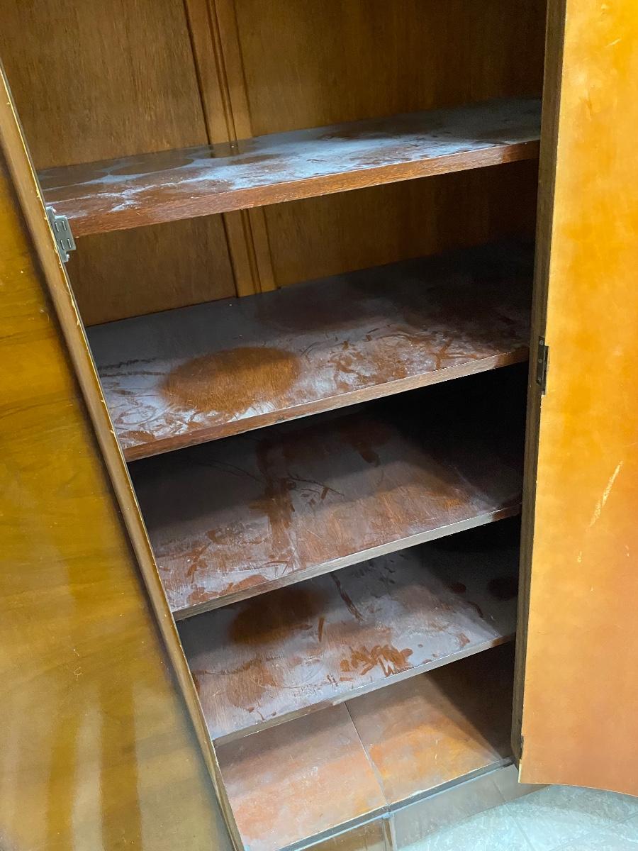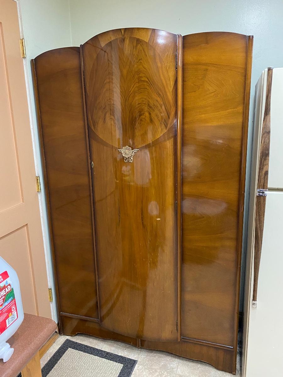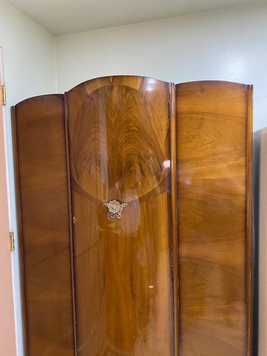 Art deco style wood cabinet armoire. Beautiful walnut veneer finish, bow front door. Adjustable shelves inside. Cabinet is split in the center, not sure why. Outside is in good condition. About 3' to 4' wide and 6' tall. LOCAL PICK UP IN FULLERTON.