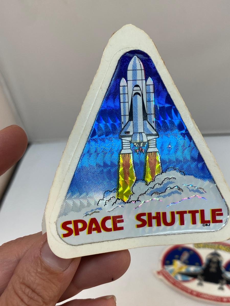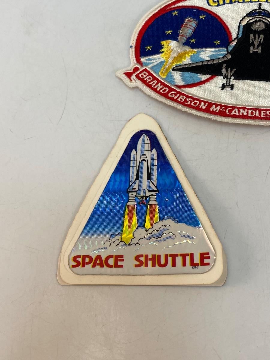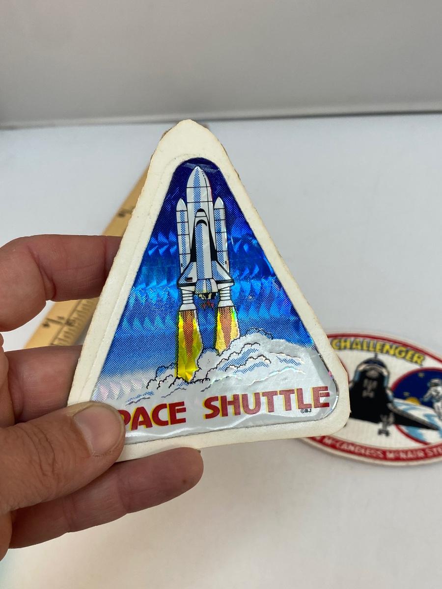 Retro NASA Challenger Space Shuttle Astronaut Patch & Holographic Triangle Shaped Sticker. Souvenir style items. Both are in good condition. Sticker is unused, on original paper backing.
