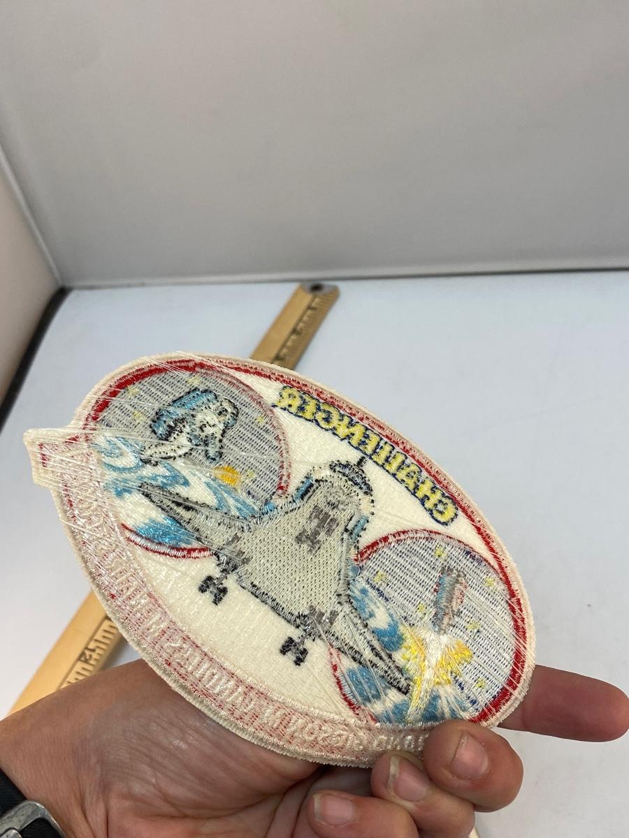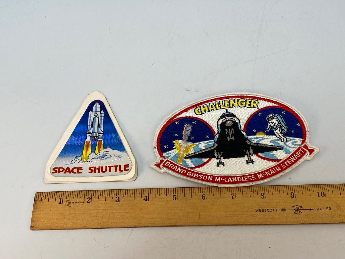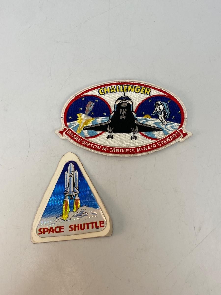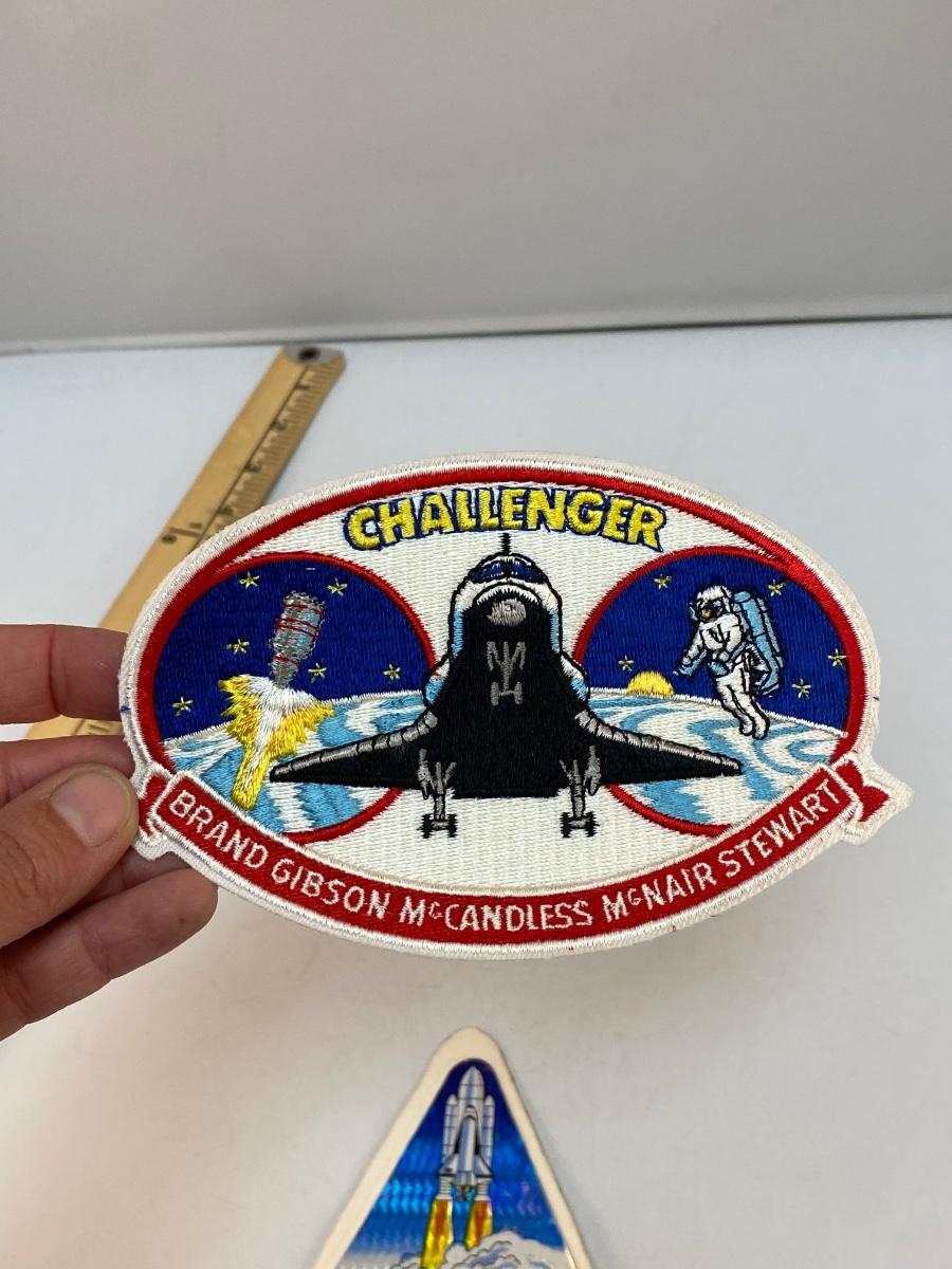 Retro NASA Challenger Space Shuttle Astronaut Patch & Holographic Triangle Shaped Sticker. Souvenir style items. Both are in good condition. Sticker is unused, on original paper backing.