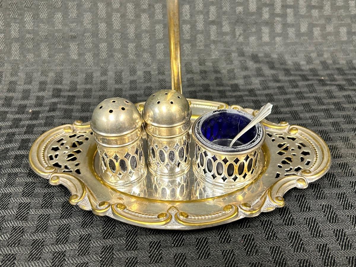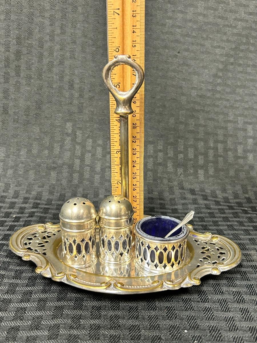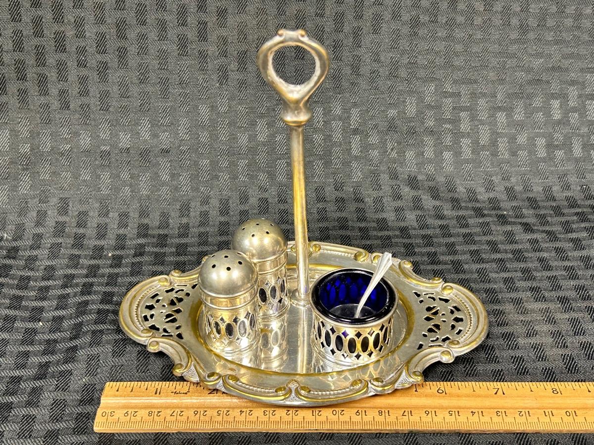 Vintage Silver Plate Salt and Pepper Shaker Set with Caddy and Open Cellar Cobalt Blue Glass