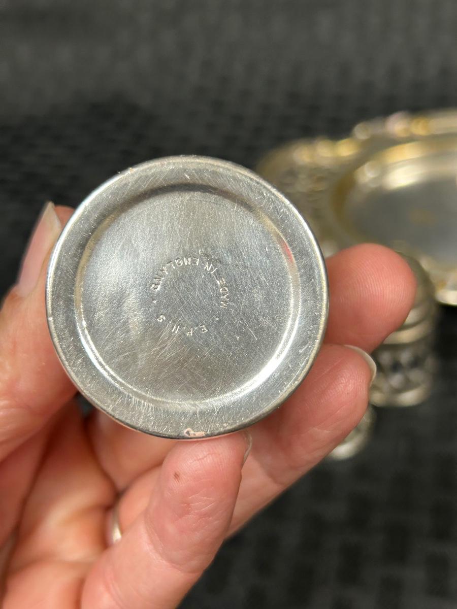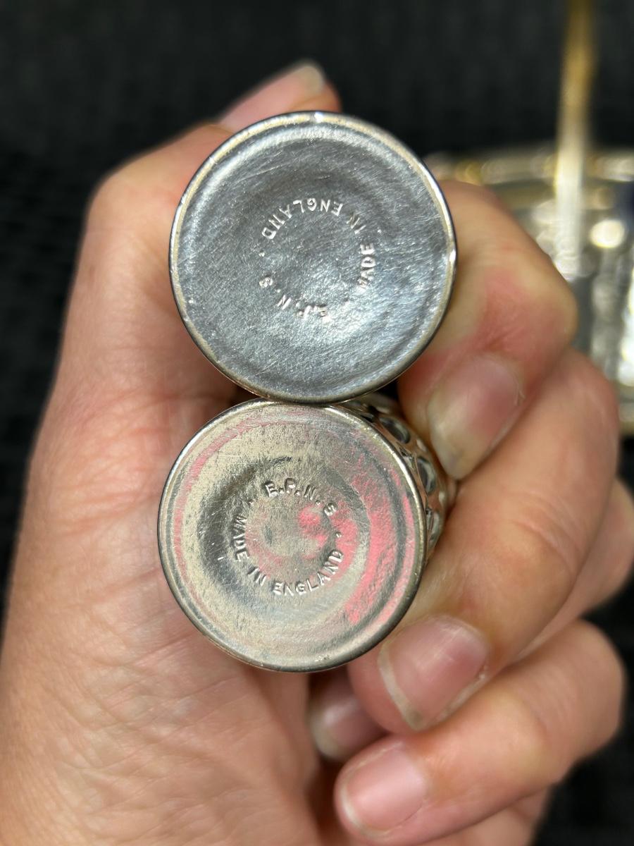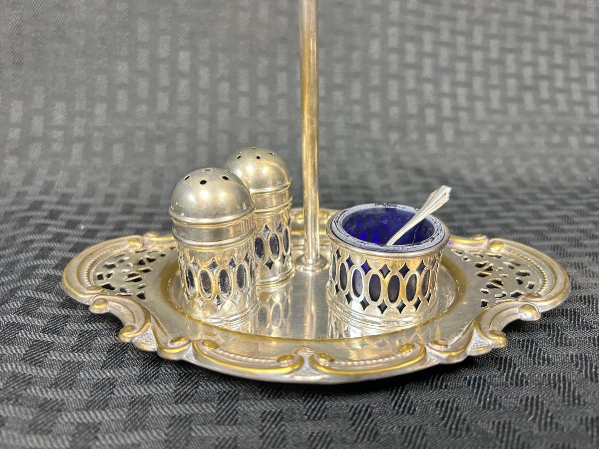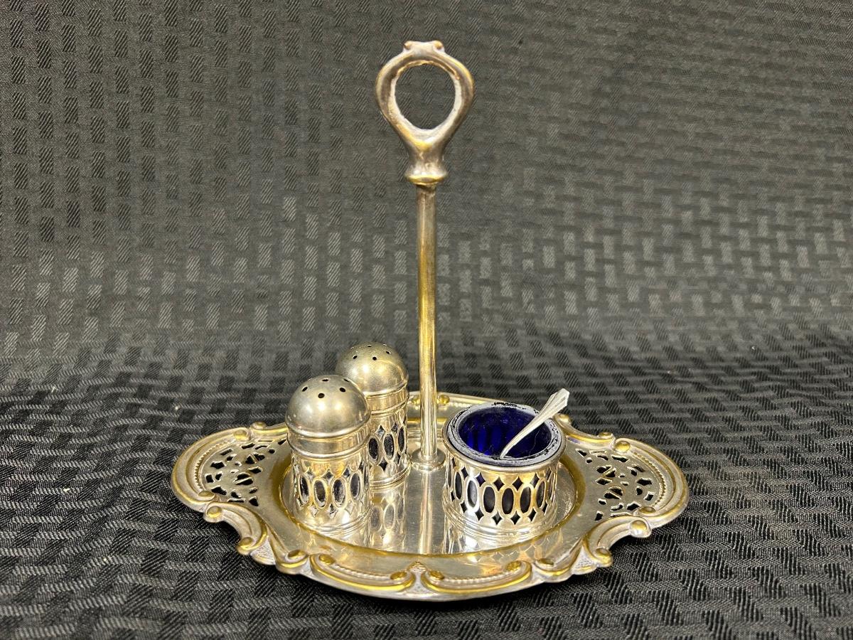 Vintage Silver Plate Salt and Pepper Shaker Set with Caddy and Open Cellar Cobalt Blue Glass