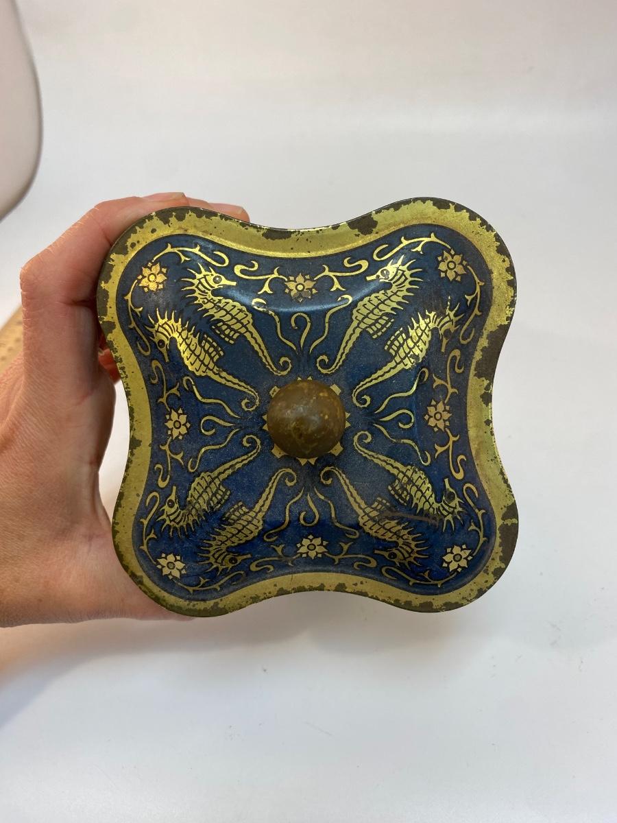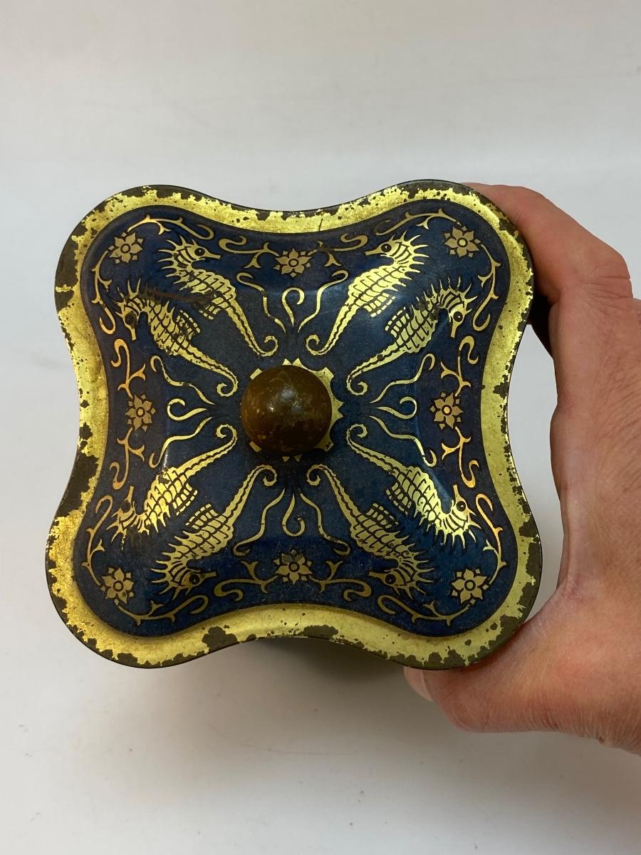 Vintage Nautical Maritime Sailing Ships Cookie Biscuit Tin Seahorses and Flowers Lid. Some light signs of age but displays great.