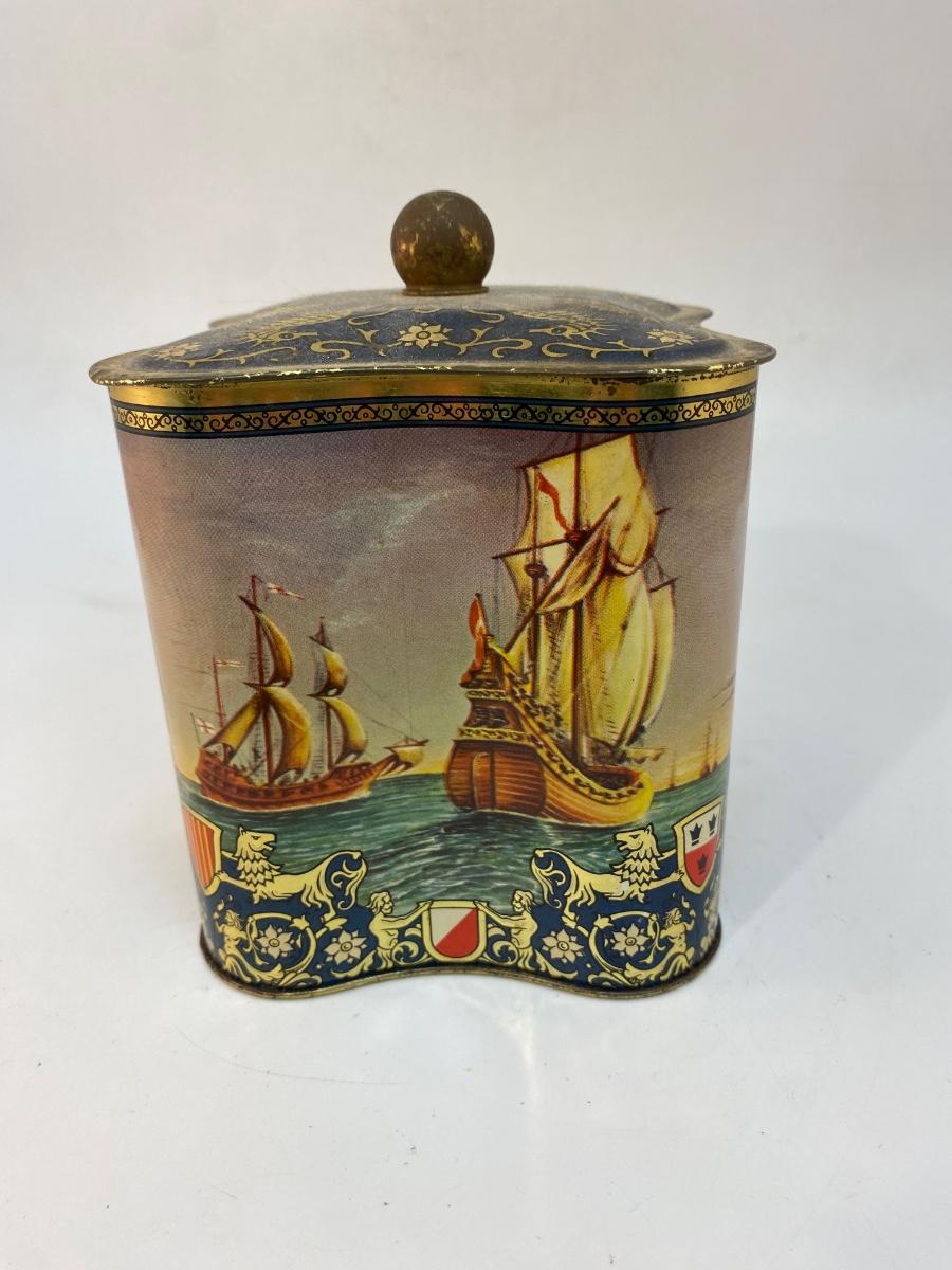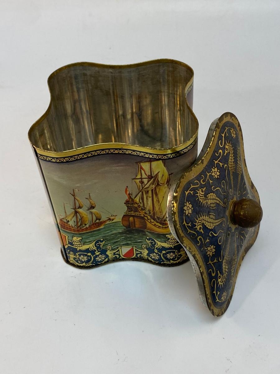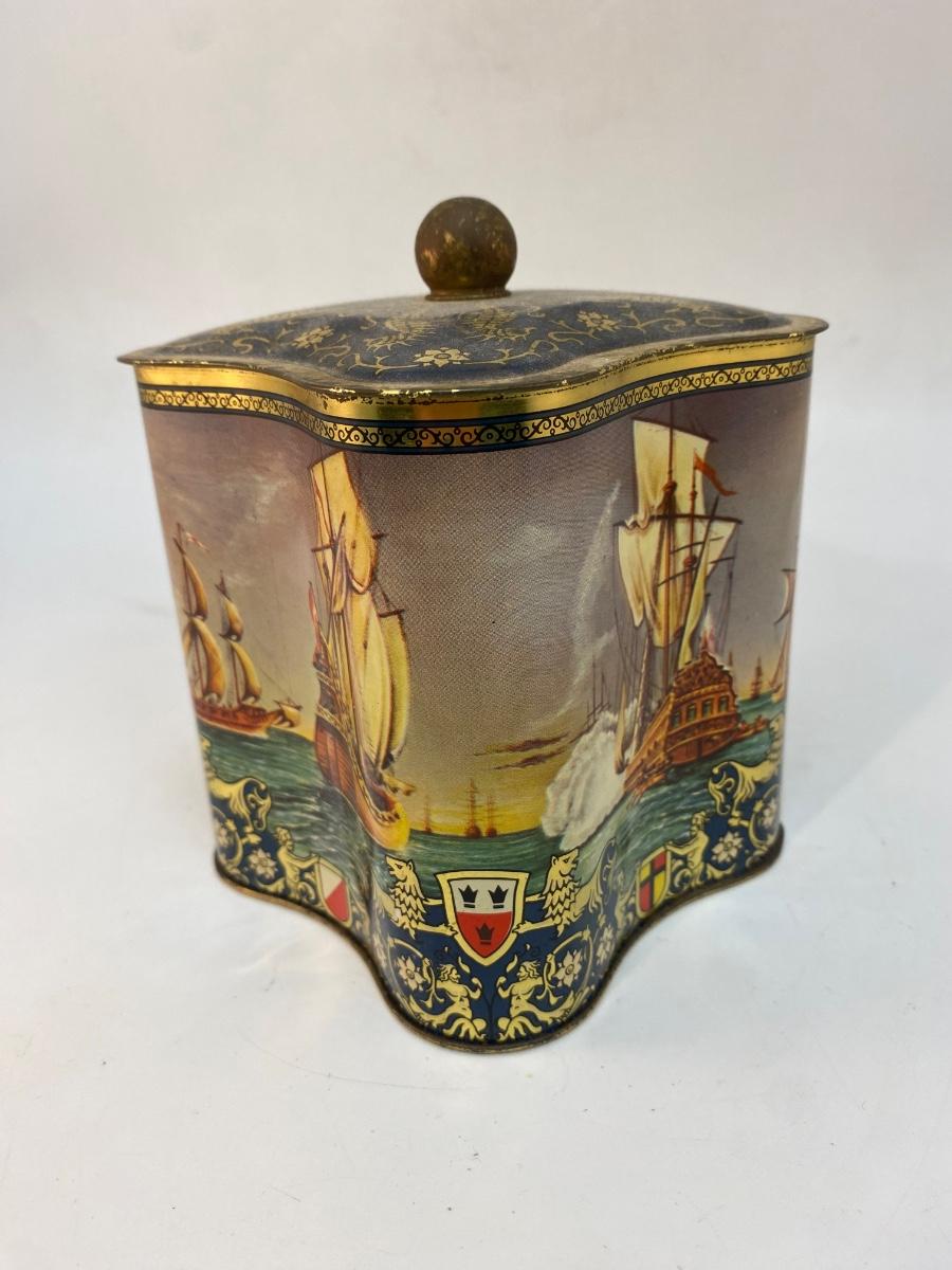Vintage Nautical Maritime Sailing Ships Cookie Biscuit Tin Seahorses and Flowers Lid