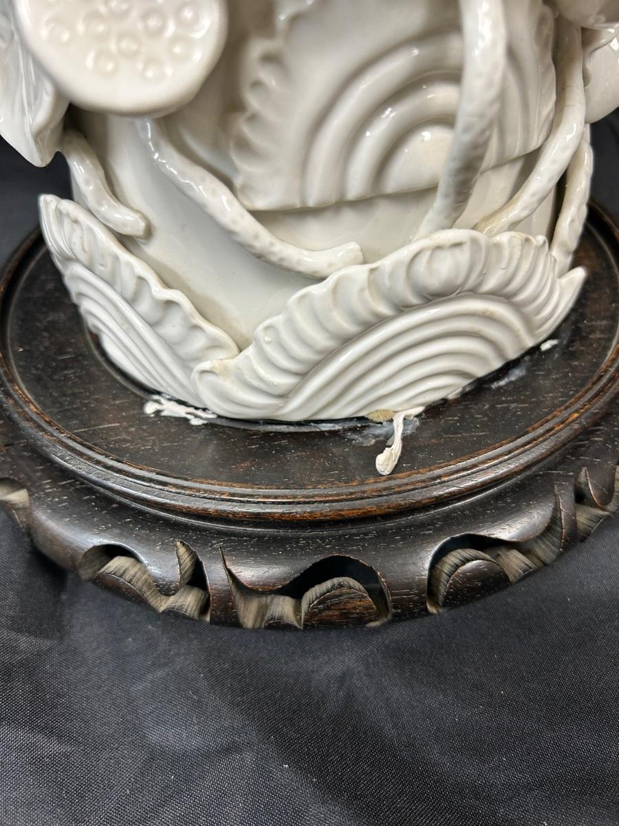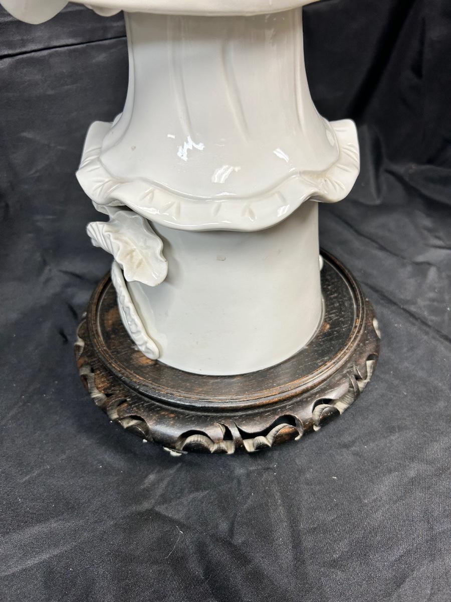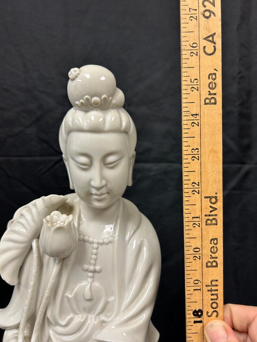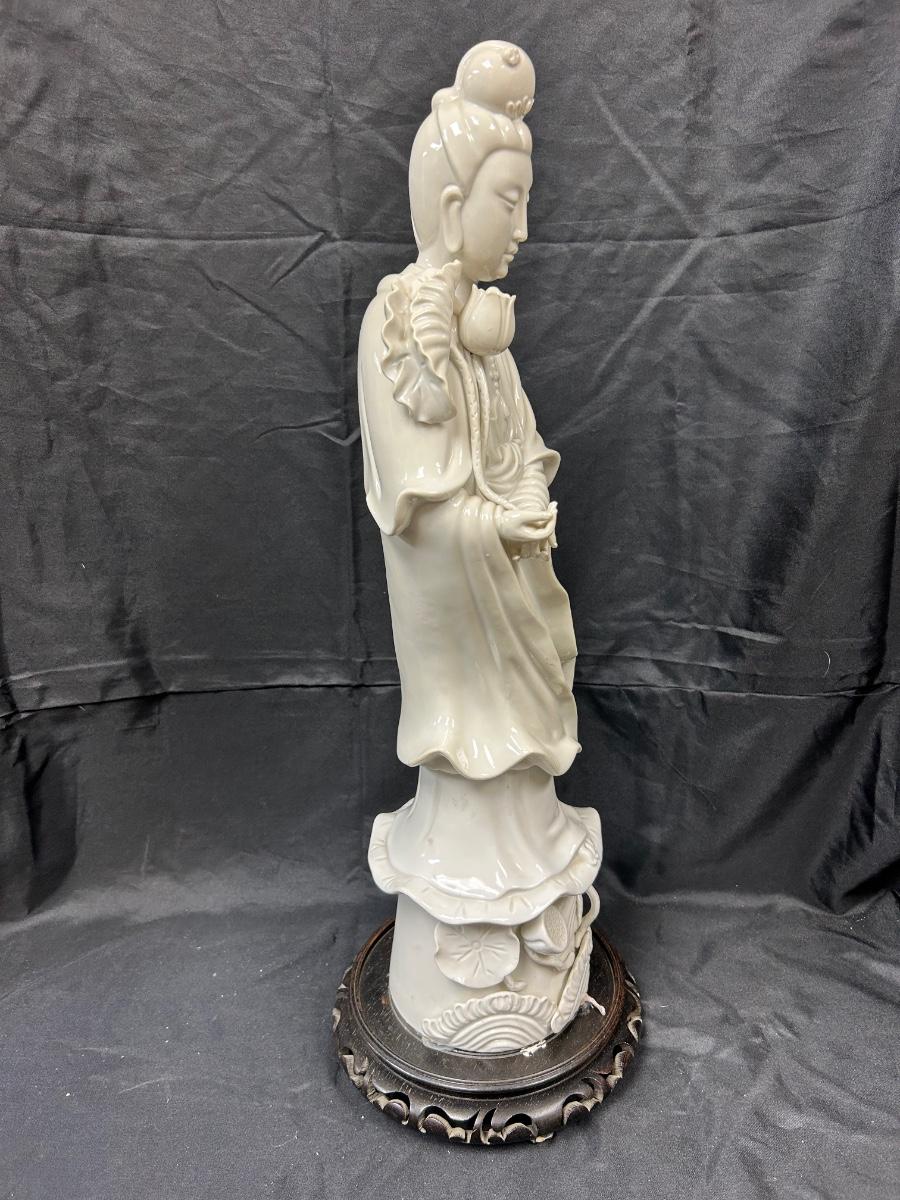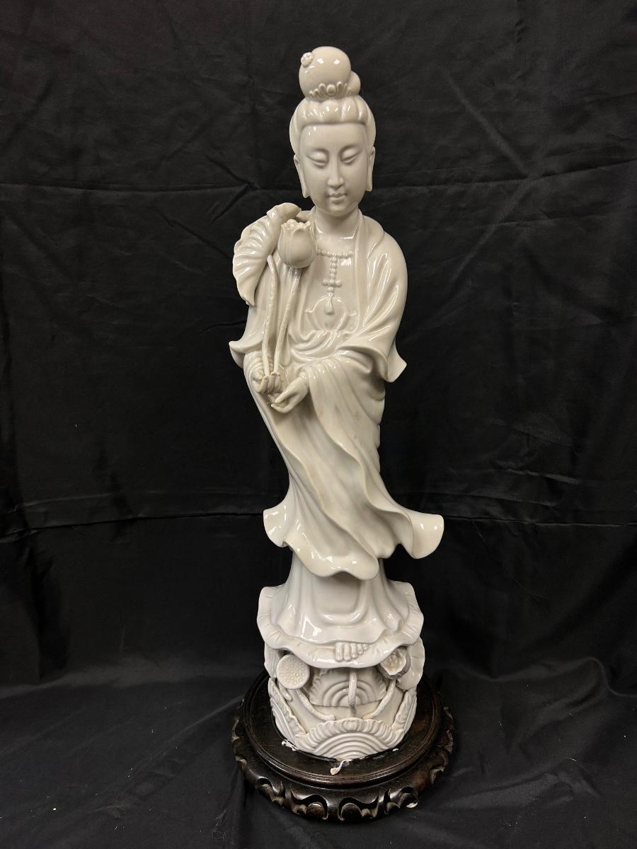 Large White Porcelain Ceramic Blanc-de-Chine Thai Buddha Woman Figurine Statue on Wood Base. In good condition. About 2' tall. Believe the statue is puttied to the wood base. No damage or chips noticed.