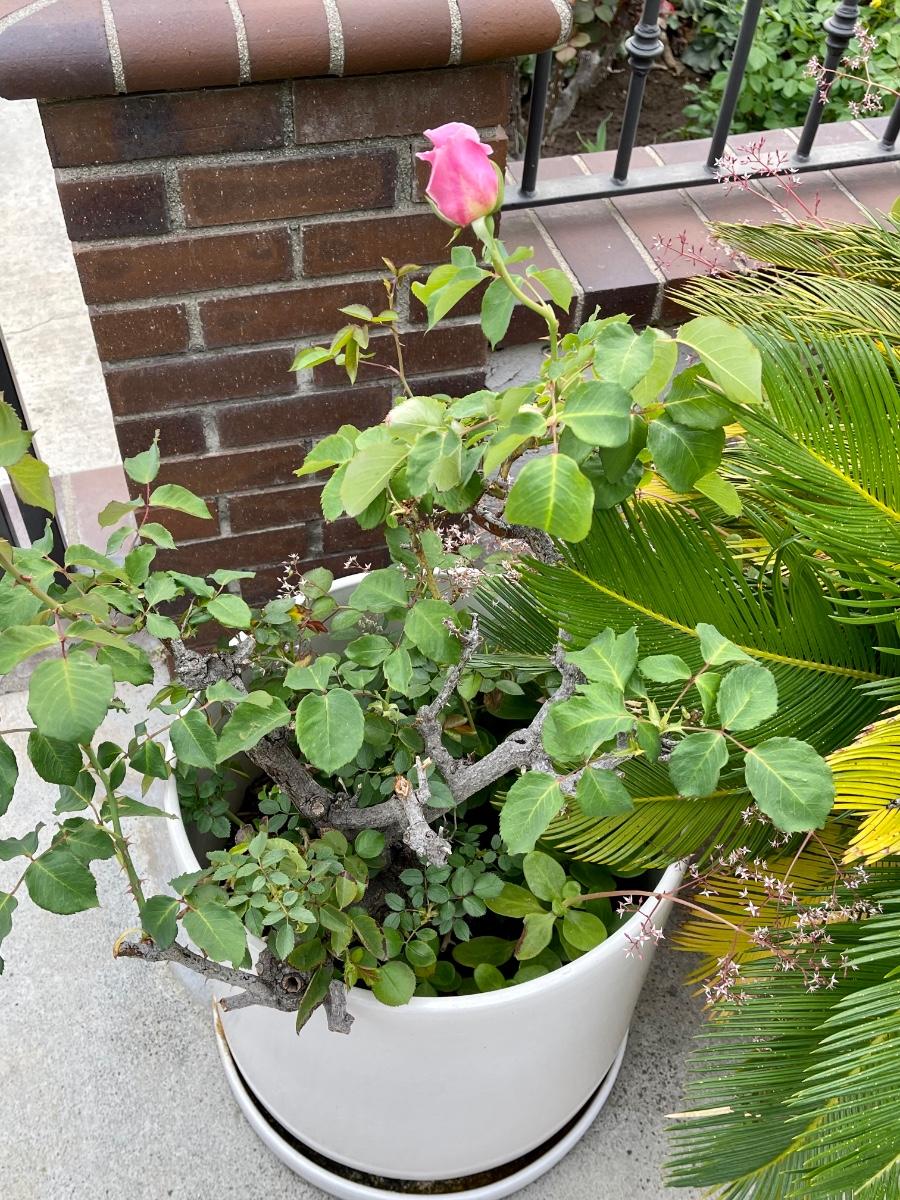 Established rose bush in pot. Flowers look like they might be pink. White ceramic planter pot.