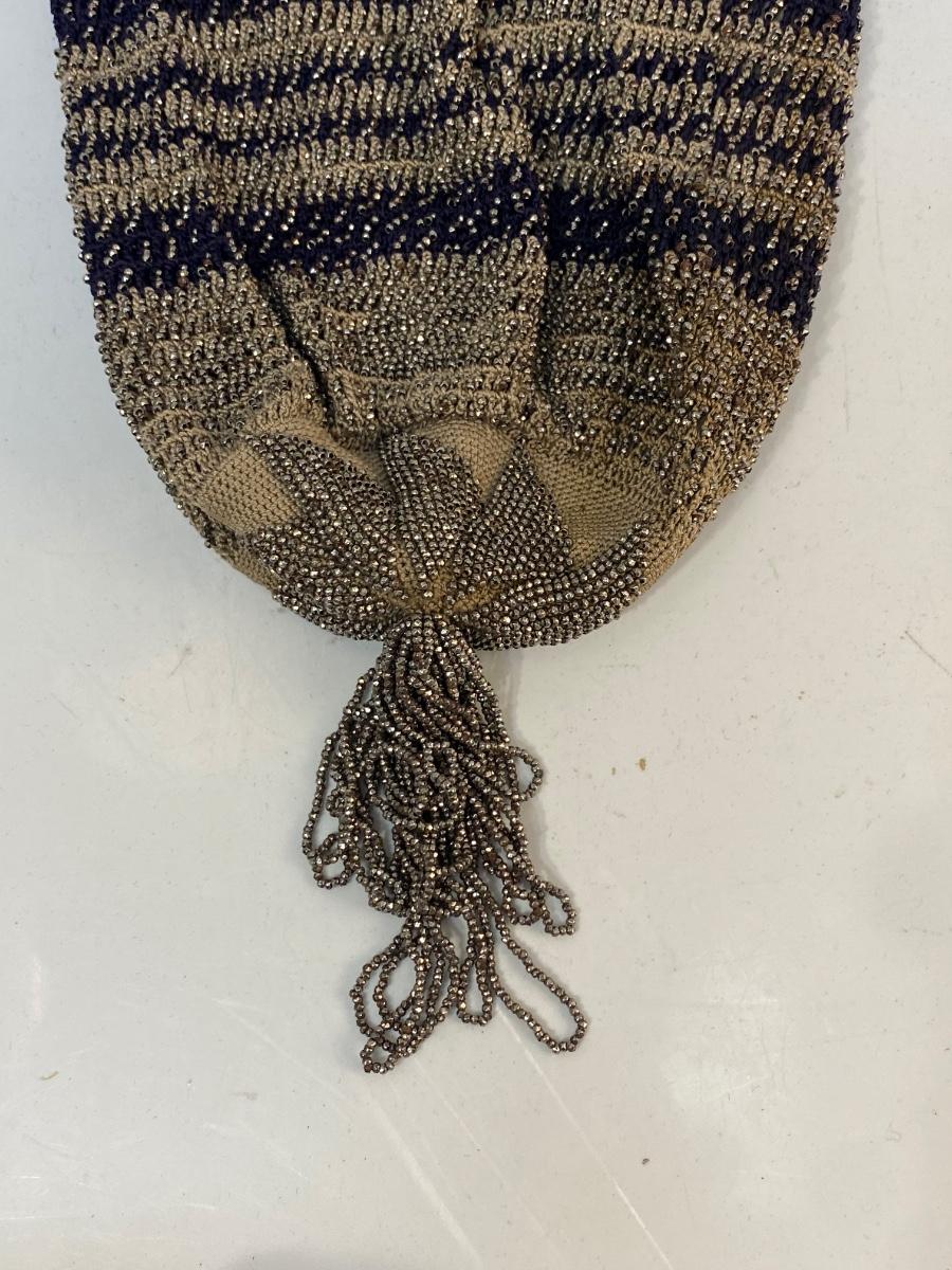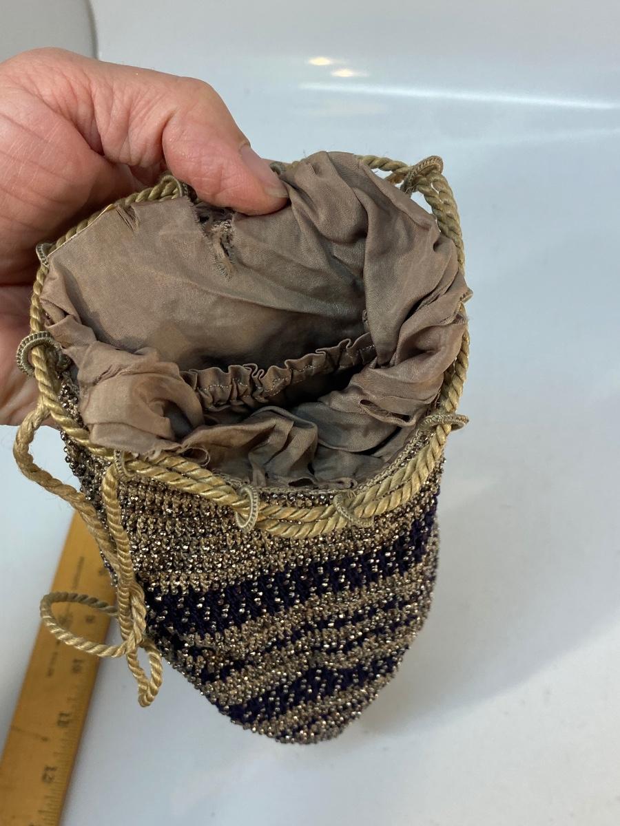 Vintage Antique Microbeaded Knitted Drawstring Bag Purse. Beads have been added to the knit work for extra detail. In good condition, lining is worn.