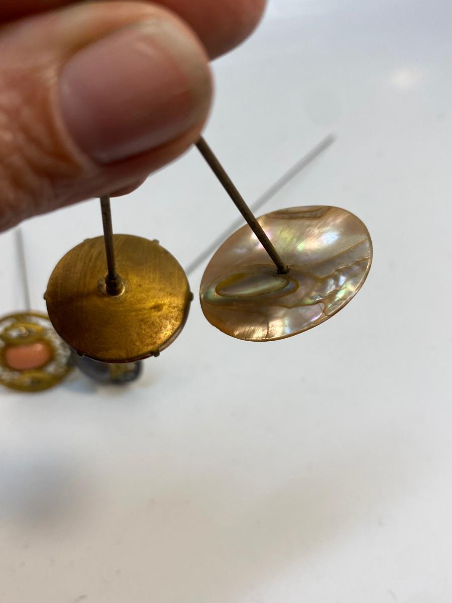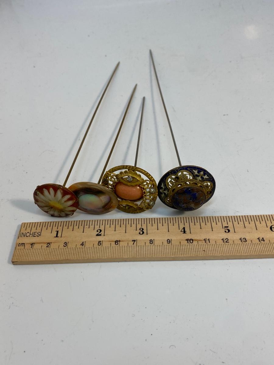 Lot of 4 Vintage Antique Hat Pins. Variety of pins in antique condition. Between 5" and 9" length. No gold or sterling marks. One is made of mother of pearl; another looks like lapis. See photos for pin details