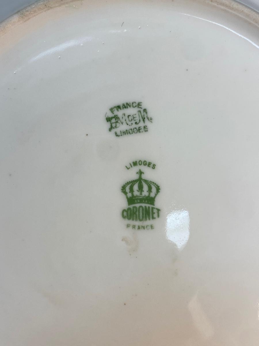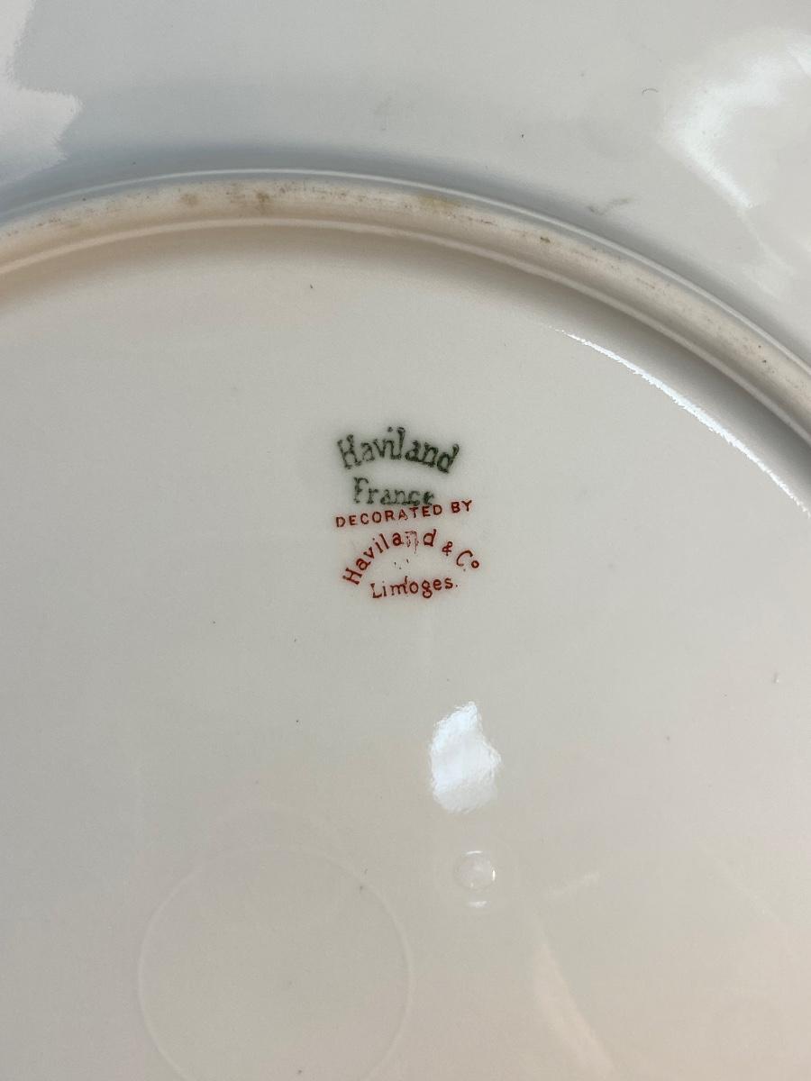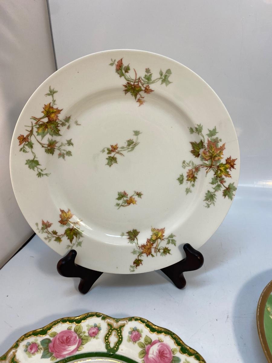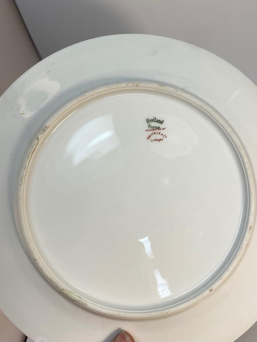Lot of Three Vintage Limoges France Porcelain China Plates. Each one different, all stamped Limoges. The white plate with leaf like pattern does have a flea bite chip along edge, unnoticeable for the most part unless you run finger across it.