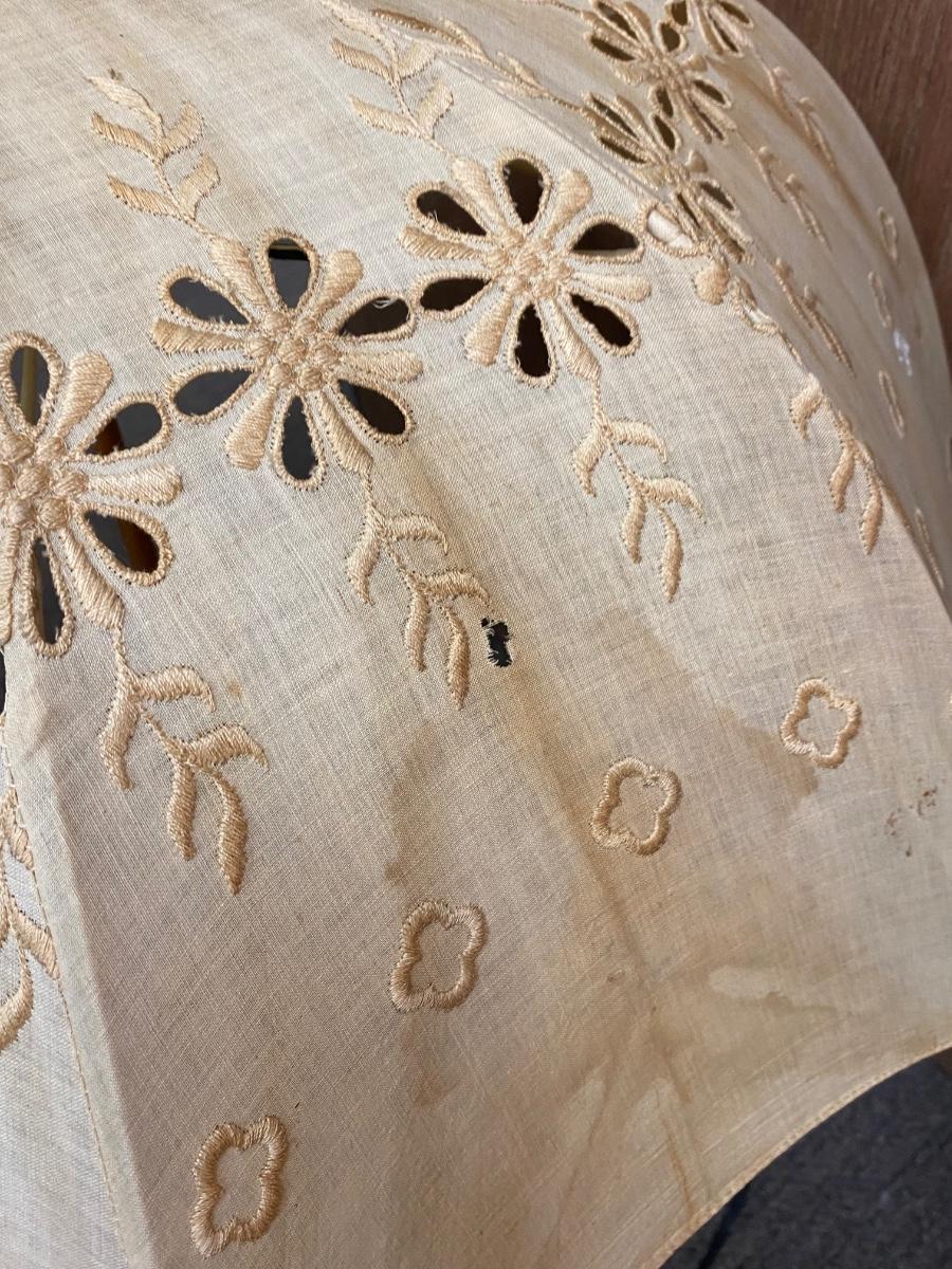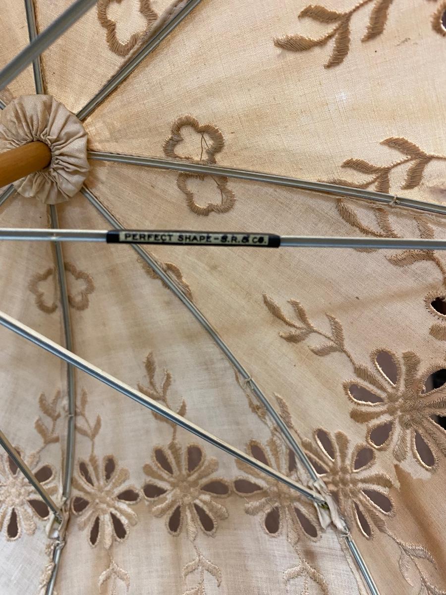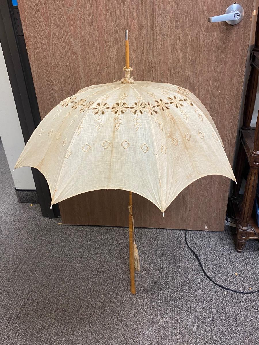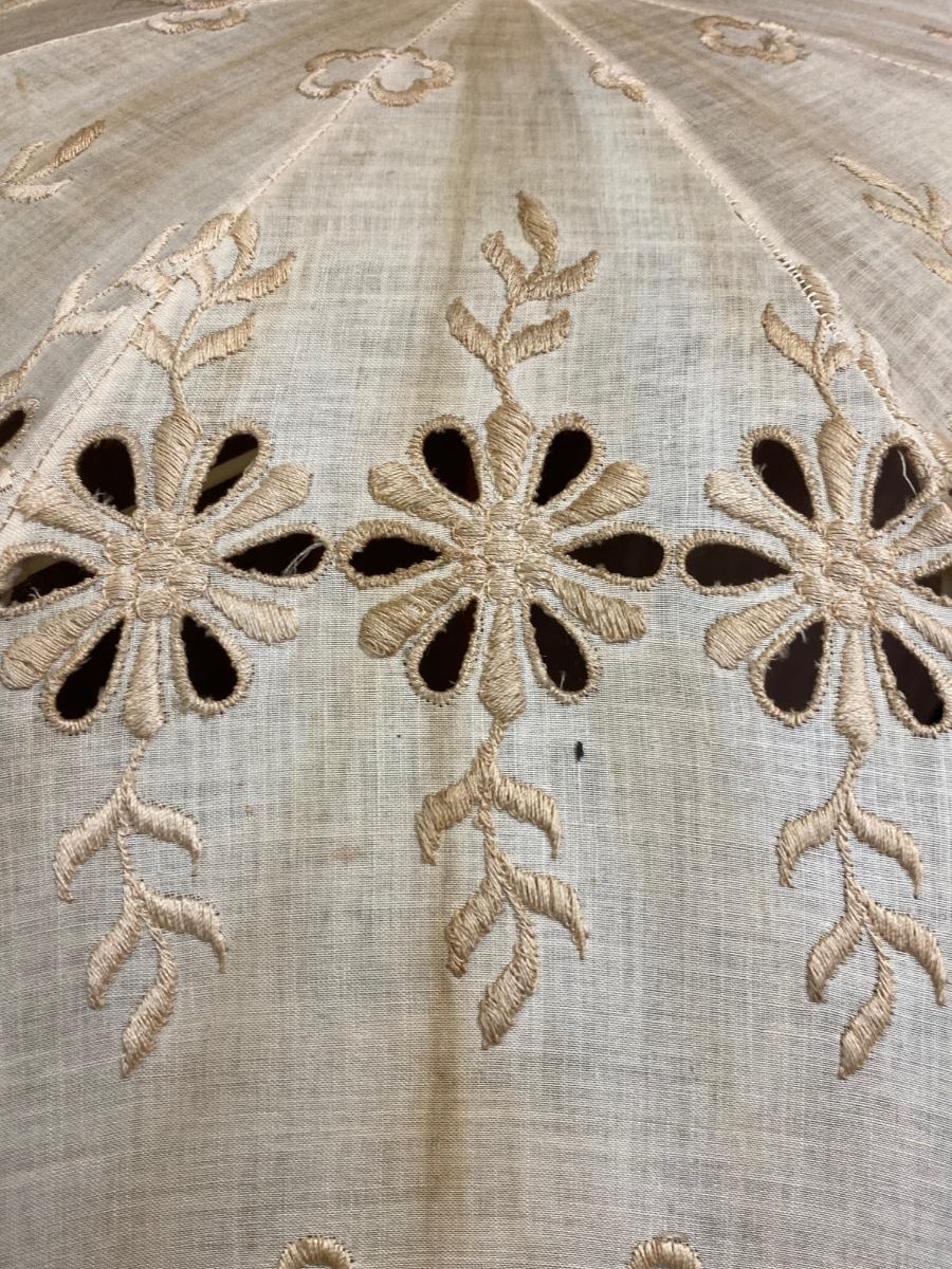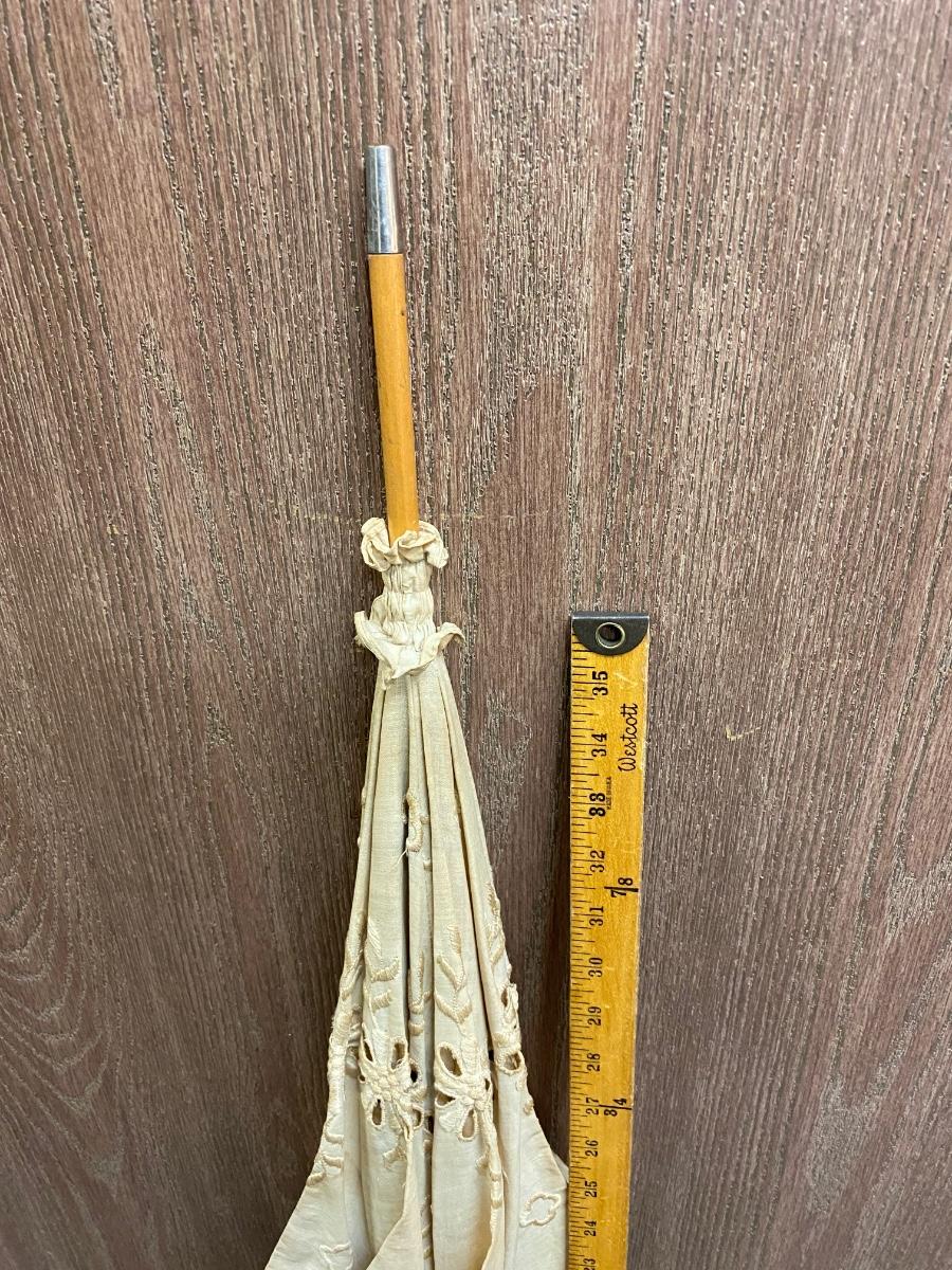 Vintage Antique Victorian Floral Eyelet Linen Parasol Umbrella with Natural Wood Handle