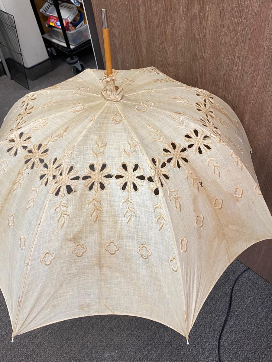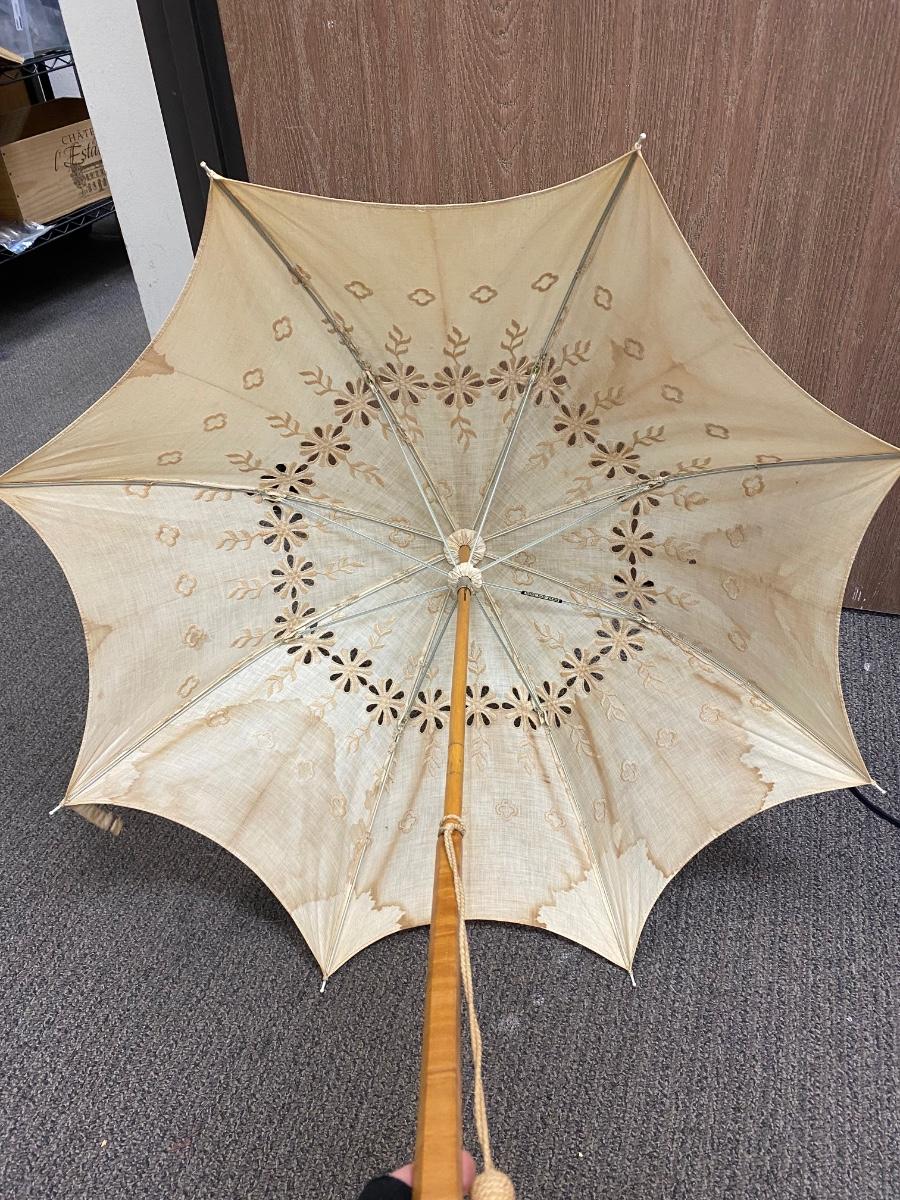 Vintage Antique Victorian Floral Eyelet Linen Parasol Umbrella with Natural Wood Handle. In good vintage condition. There is some discoloration and staining but no holes in fabric. Extra long, about 40" length. Opens nicely, sturdy frame.