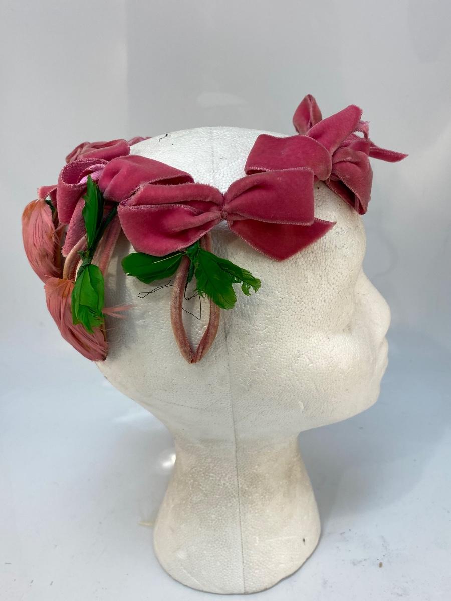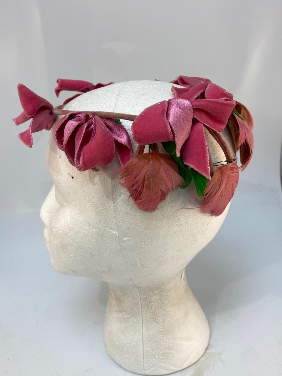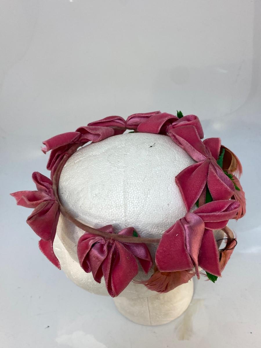 Vintage Pink Velvet Bows & Feathers Crown Fascinator Skull Cap. In vintage condition. Needs a little reshaping. There is some discoloration from age.