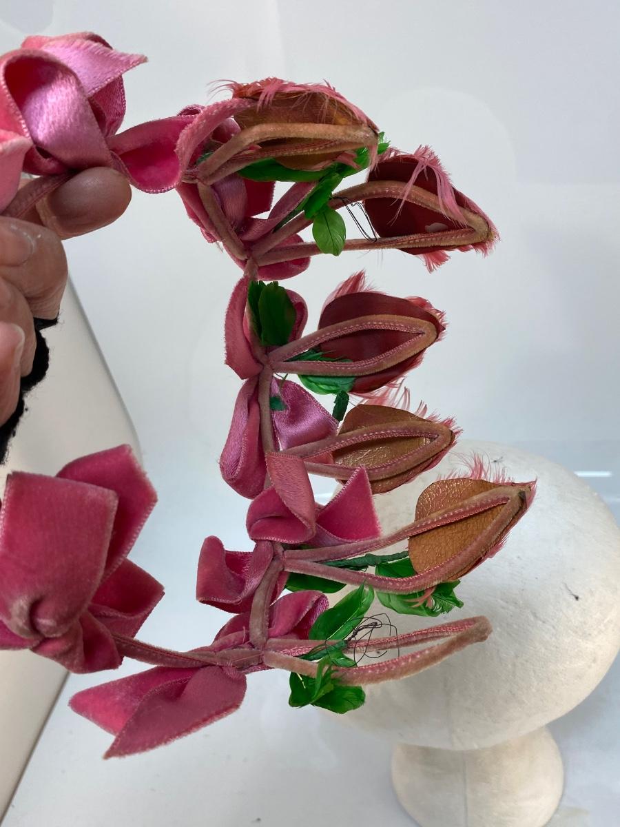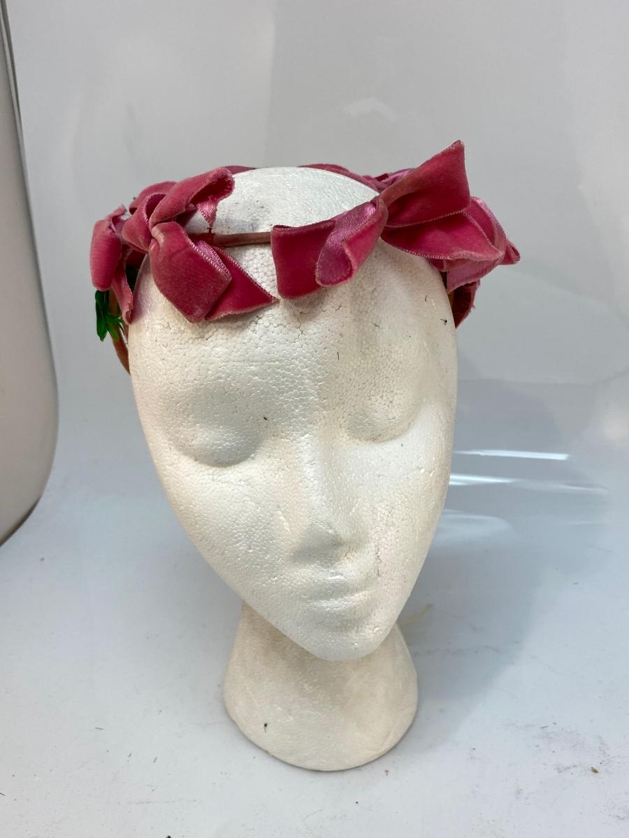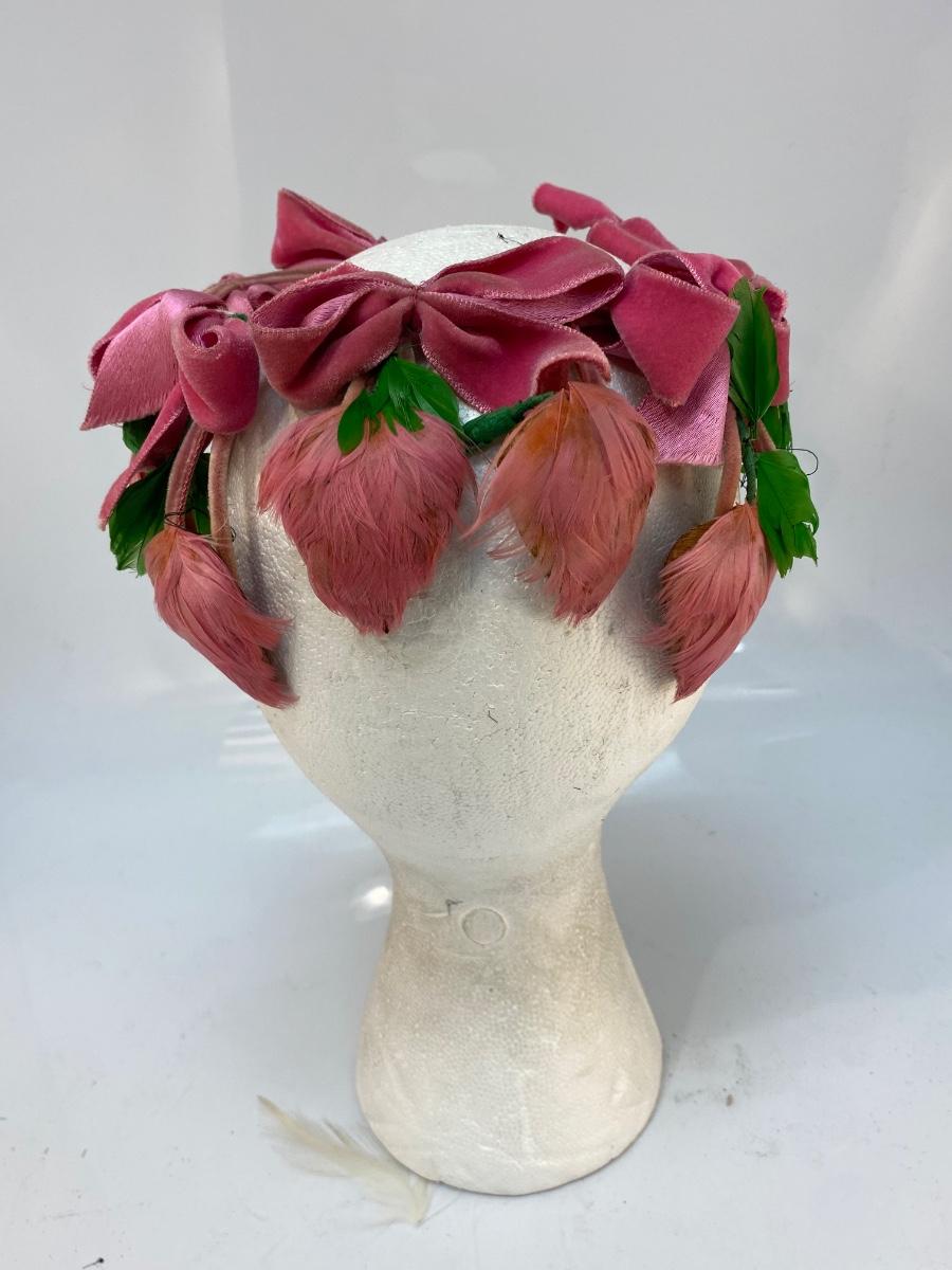 Vintage Pink Velvet Bows & Feathers Crown Fascinator Skull Cap. In vintage condition. Needs a little reshaping. There is some discoloration from age.