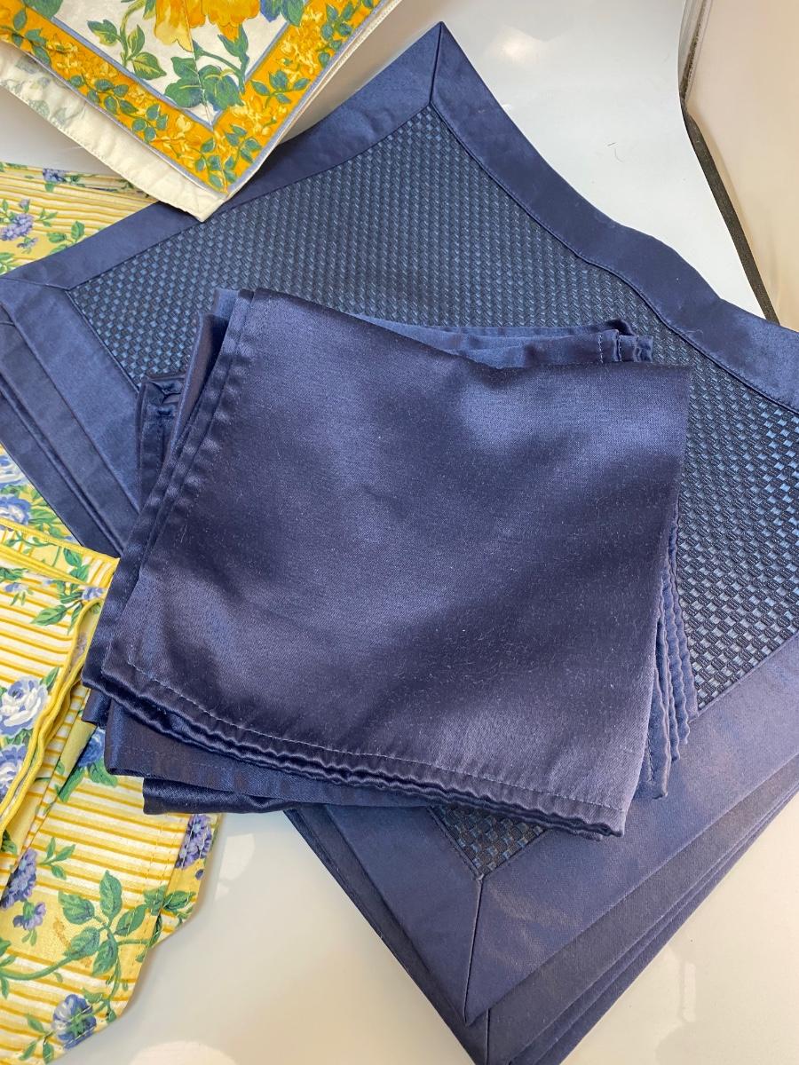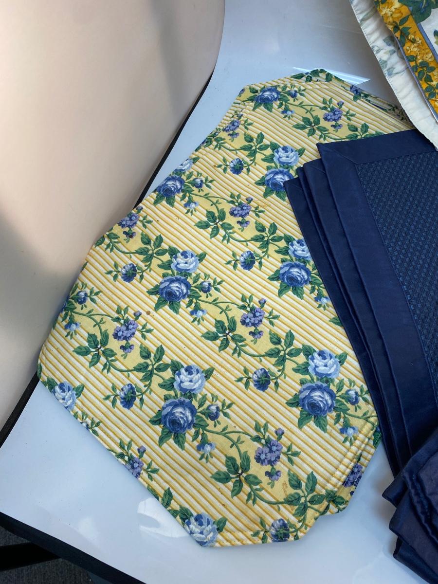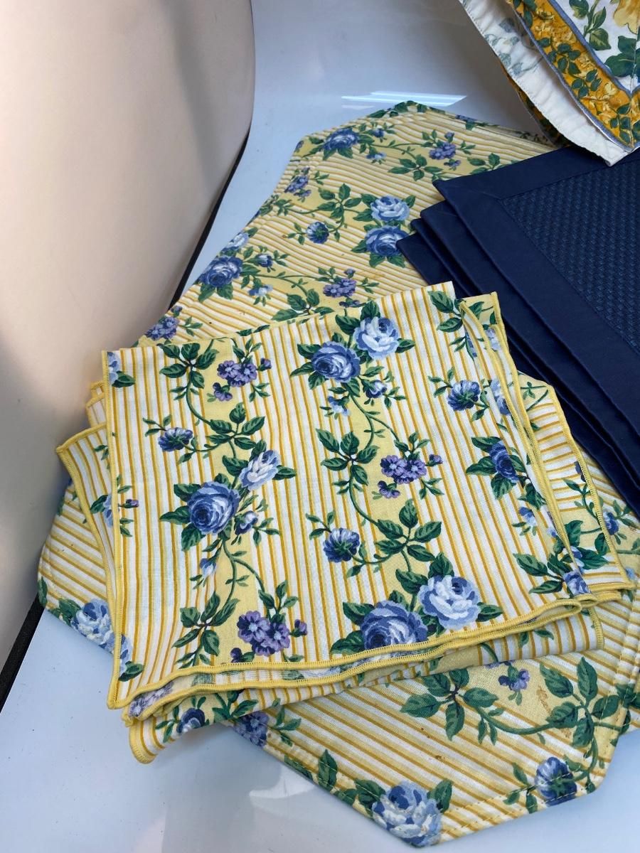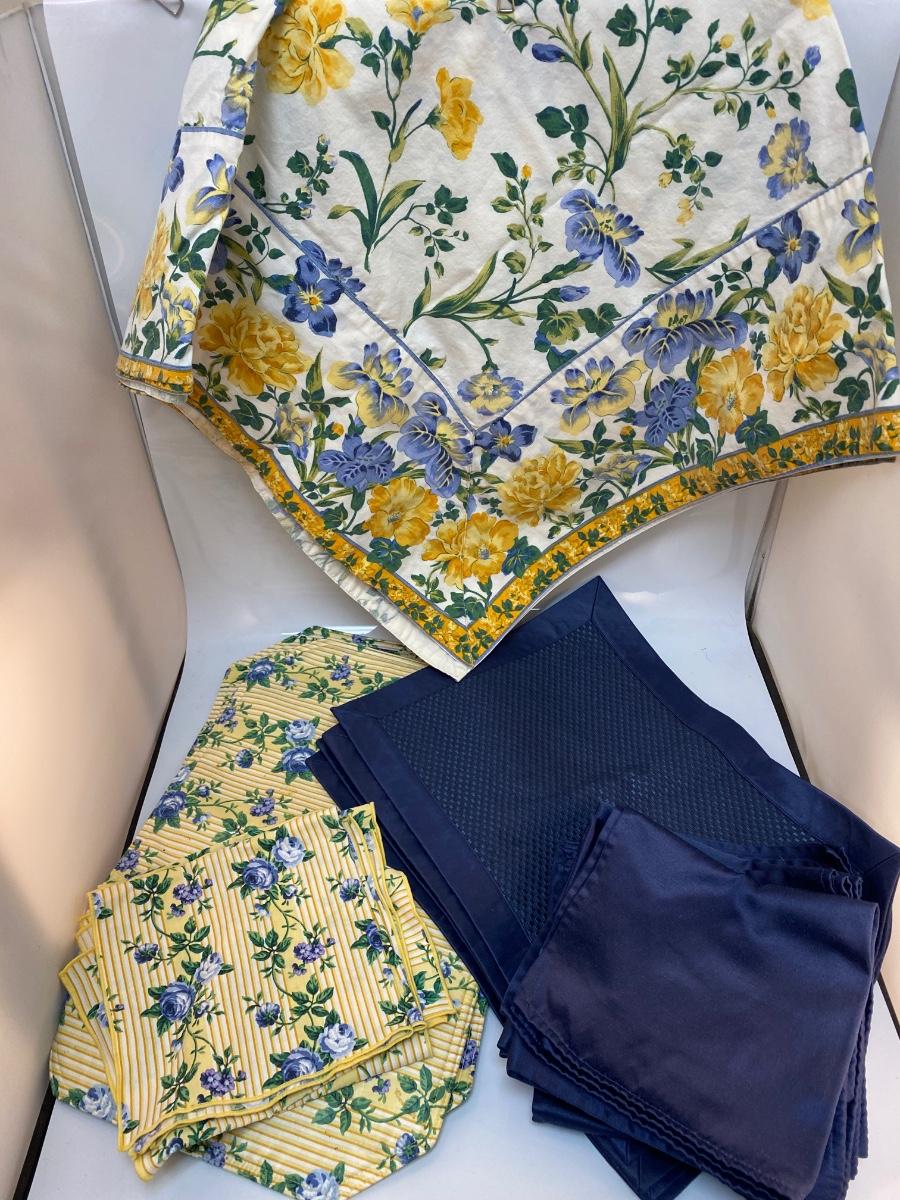 Navy Blue and Yellow French Country Floral Placemats Napkins & Square Tablecloth. In good used condition. There is some light spots but no major stains. The navy blue mats and napkins are in the better condition of the lot. Tablecloth is about 4' square.