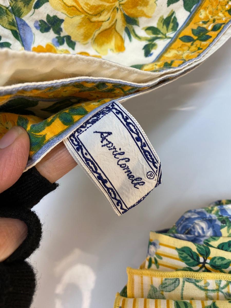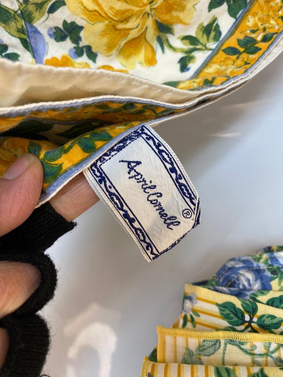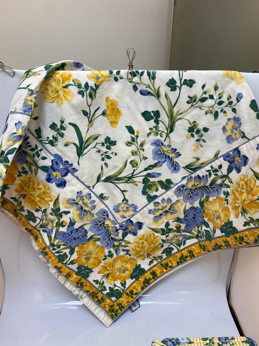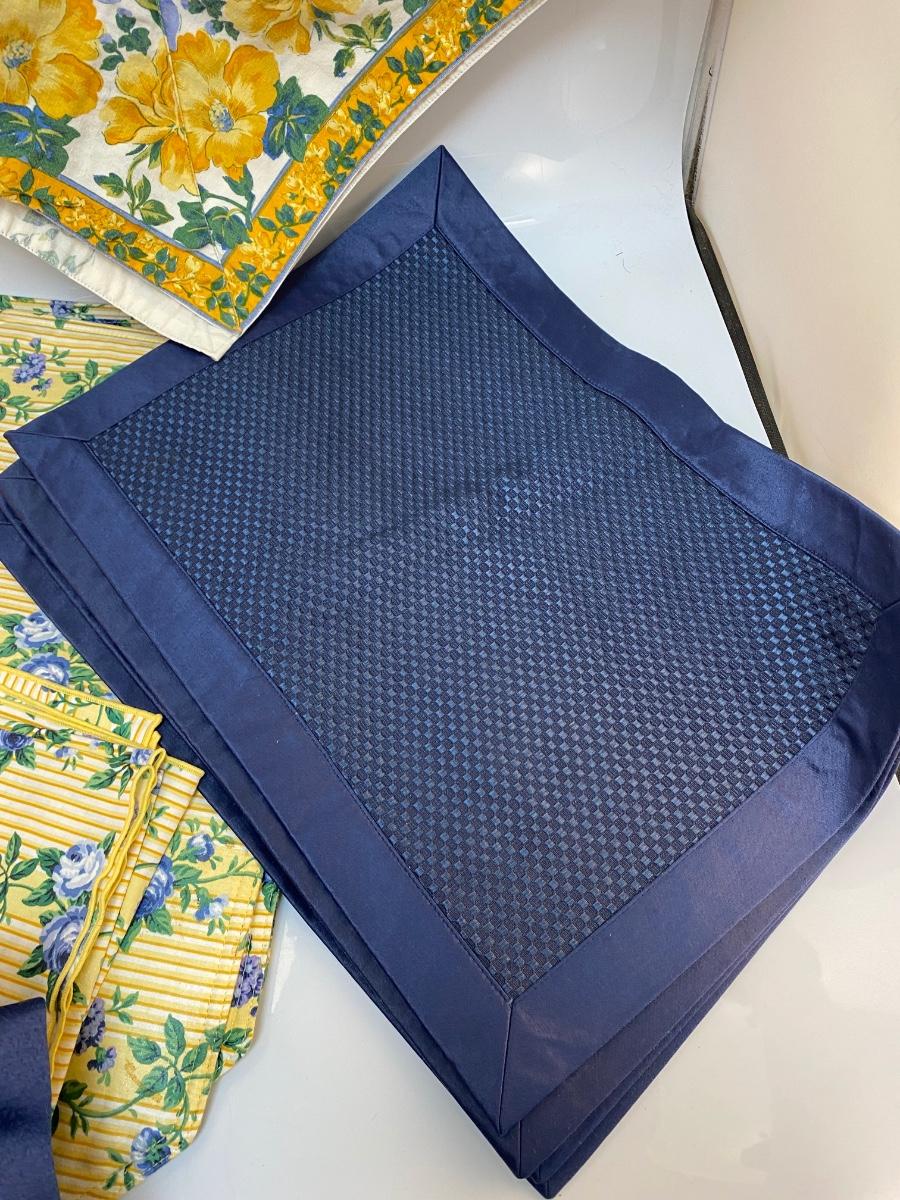 Navy Blue and Yellow French Country Floral Placemats Napkins & Square Tablecloth. In good used condition. There is some light spots but no major stains. The navy blue mats and napkins are in the better condition of the lot. Tablecloth is about 4' square.