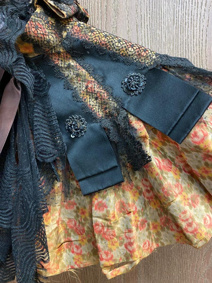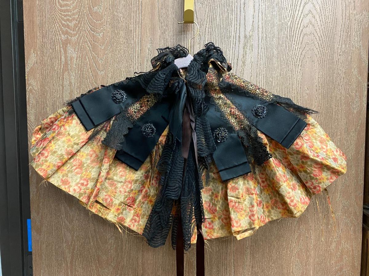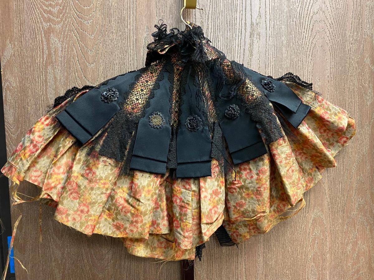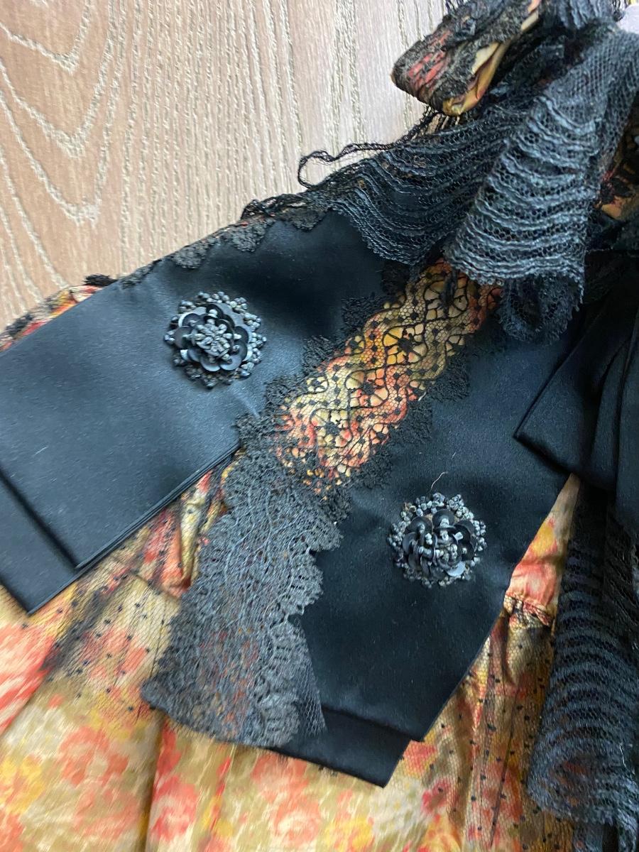 Antique Victorian Floral and Black Lace Cape Capelet Shoulder Wrap. In vintage condition, the material is falling apart and is delicate. Great for costume, pattern, or display. Would not suggest for wear as the material seems to be deteriorating and tears easily.