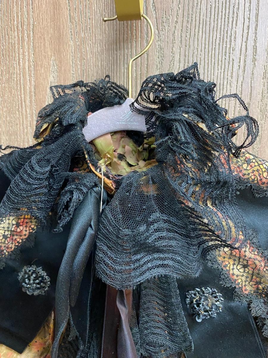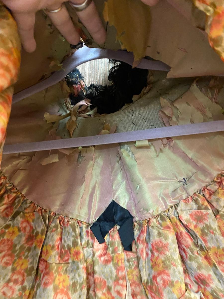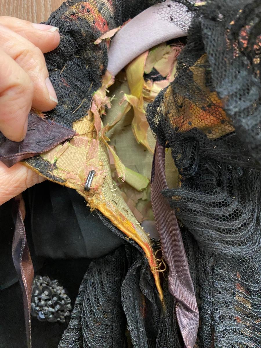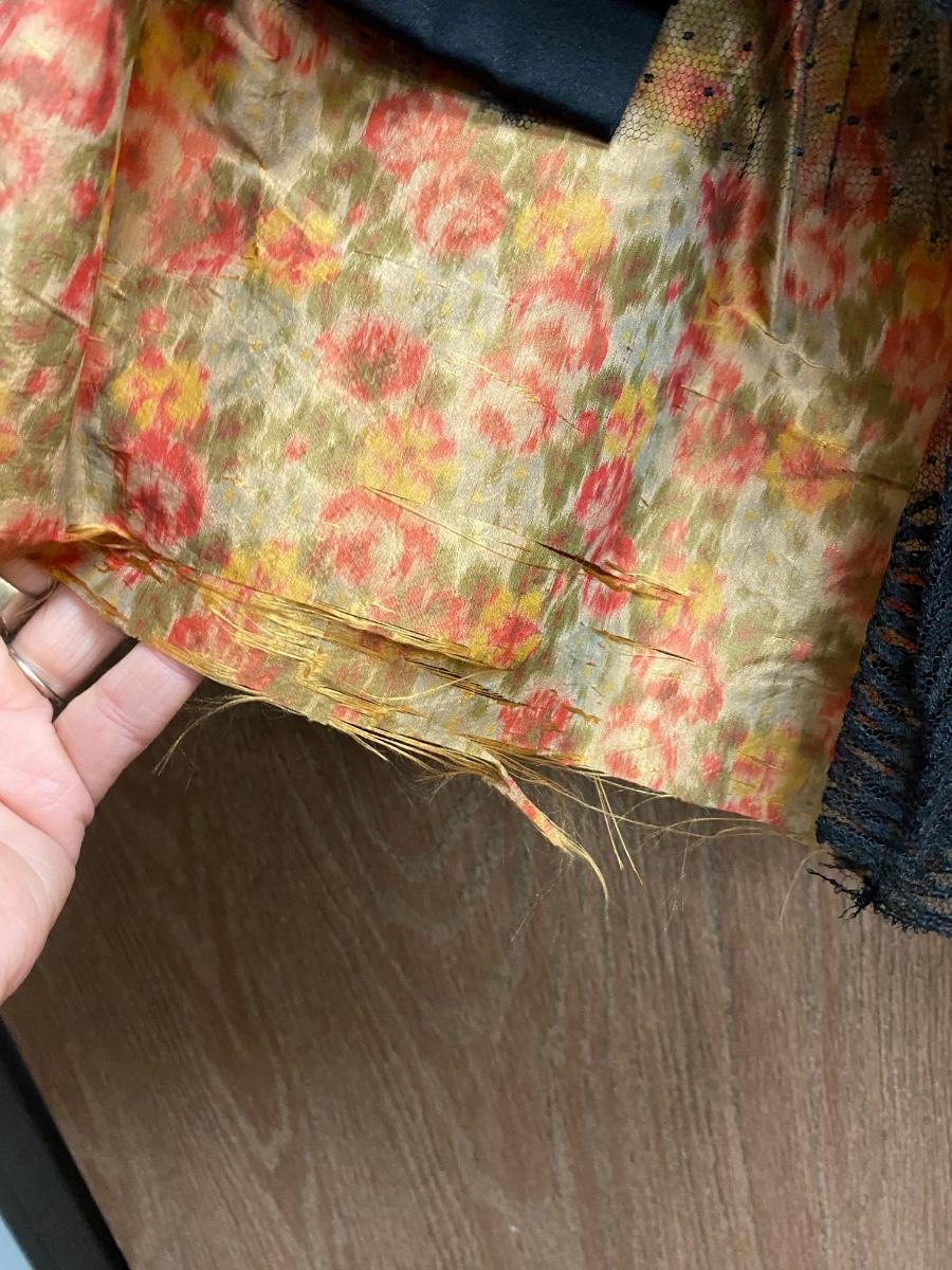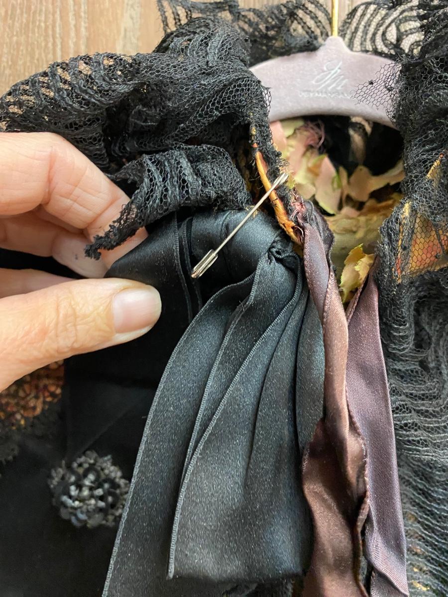 Antique Victorian Floral and Black Lace Cape Capelet Shoulder Wrap. In vintage condition, the material is falling apart and is delicate. Great for costume, pattern, or display. Would not suggest for wear as the material seems to be deteriorating and tears easily.
