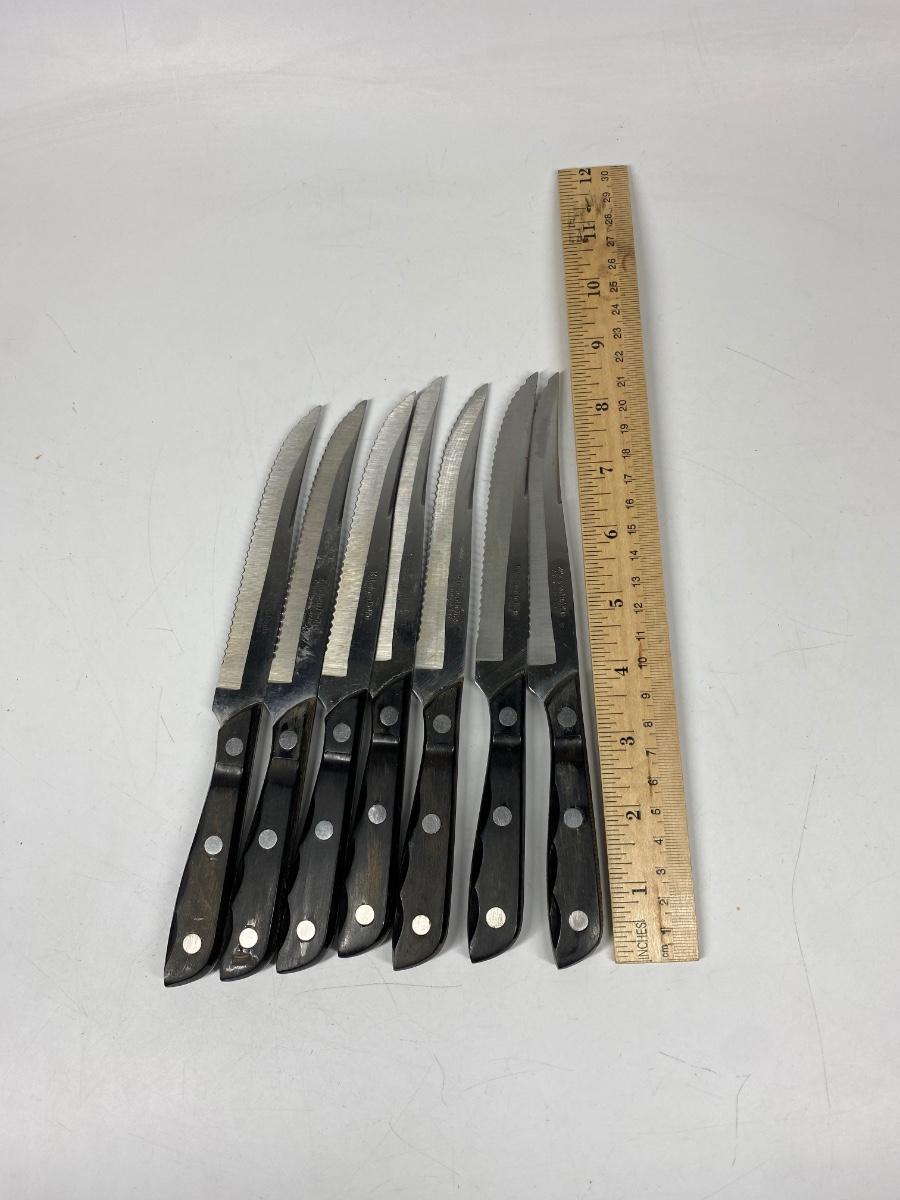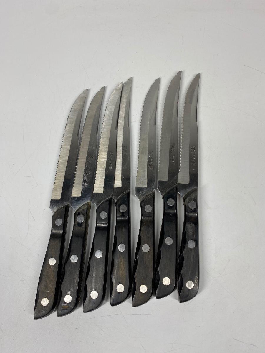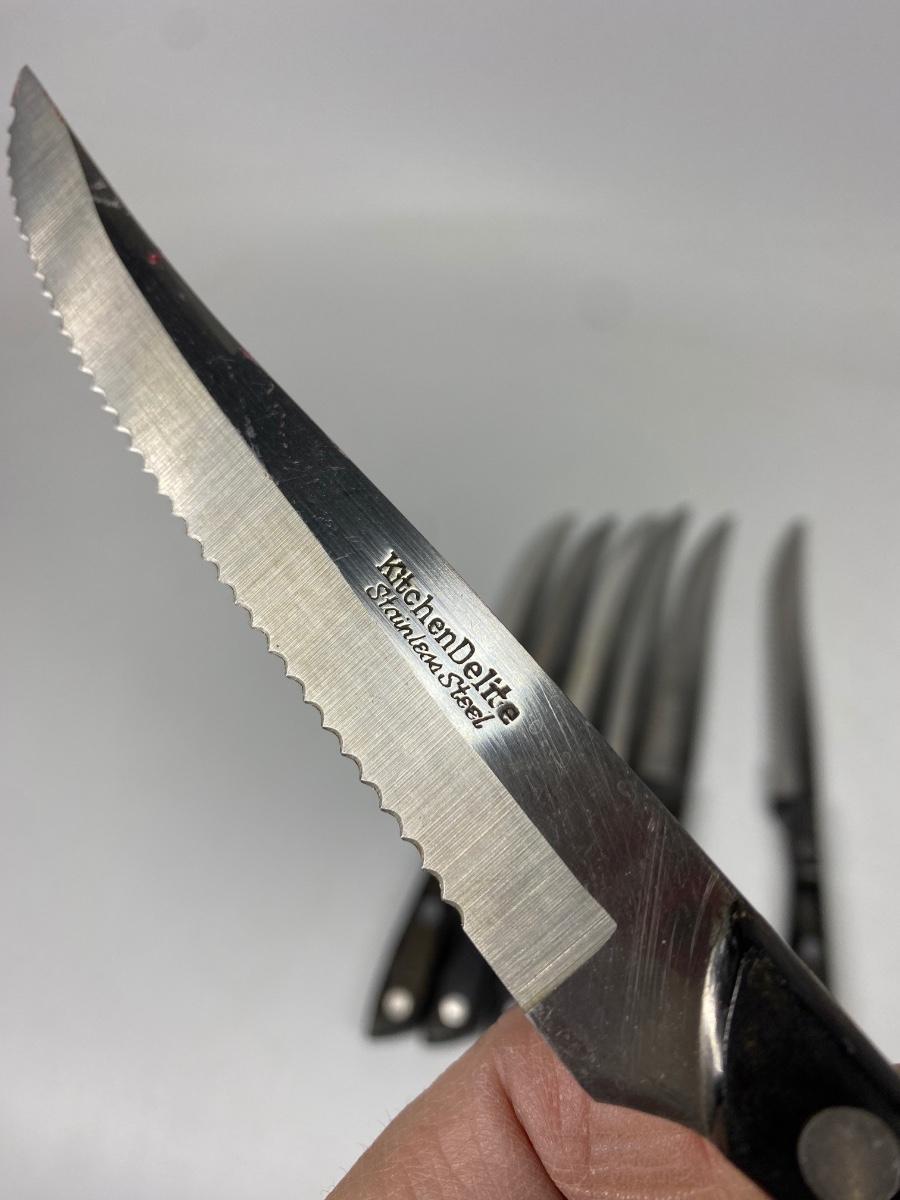 Set of 7 Kitchen Delite Stainless Steel Steak Knives Cutlery Set. in good previously used condition. Handles show light wear.