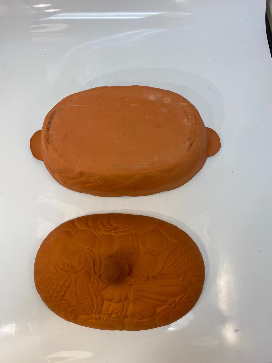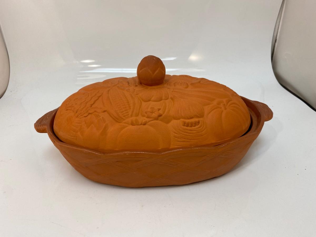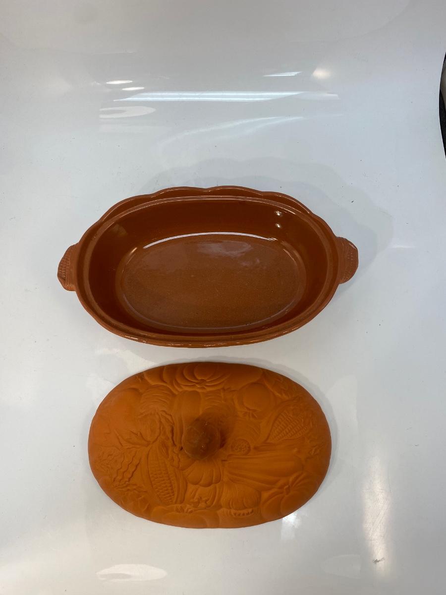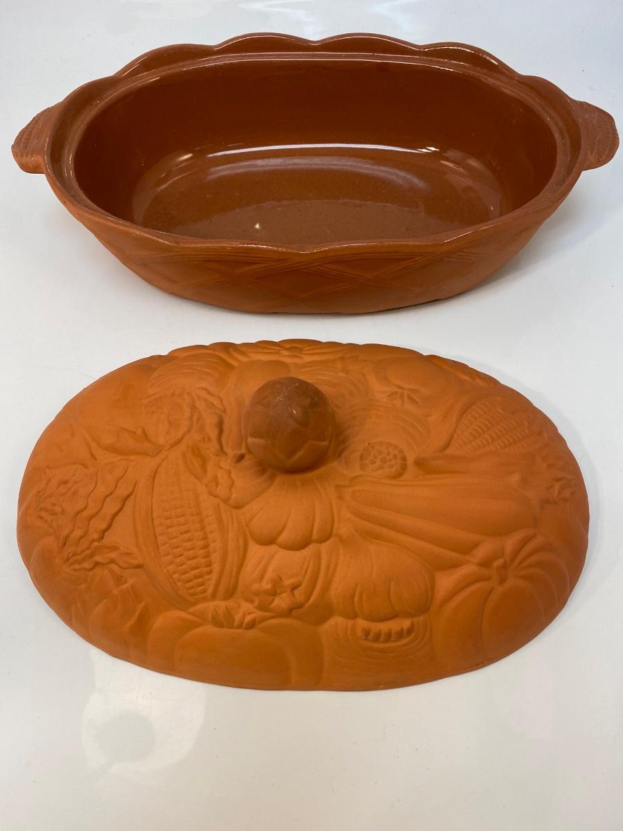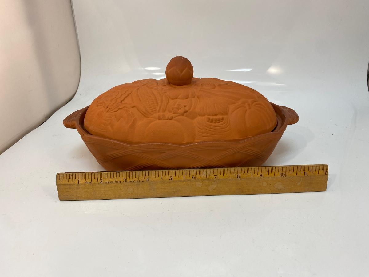 Vintage Retro Oblong Terra Cotta Pottery Casserole Dish Dutch Oven Vegetable Pattern Lid