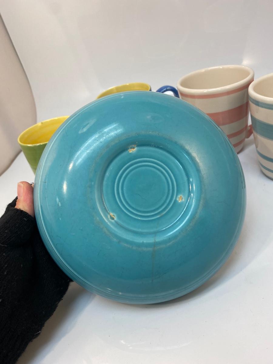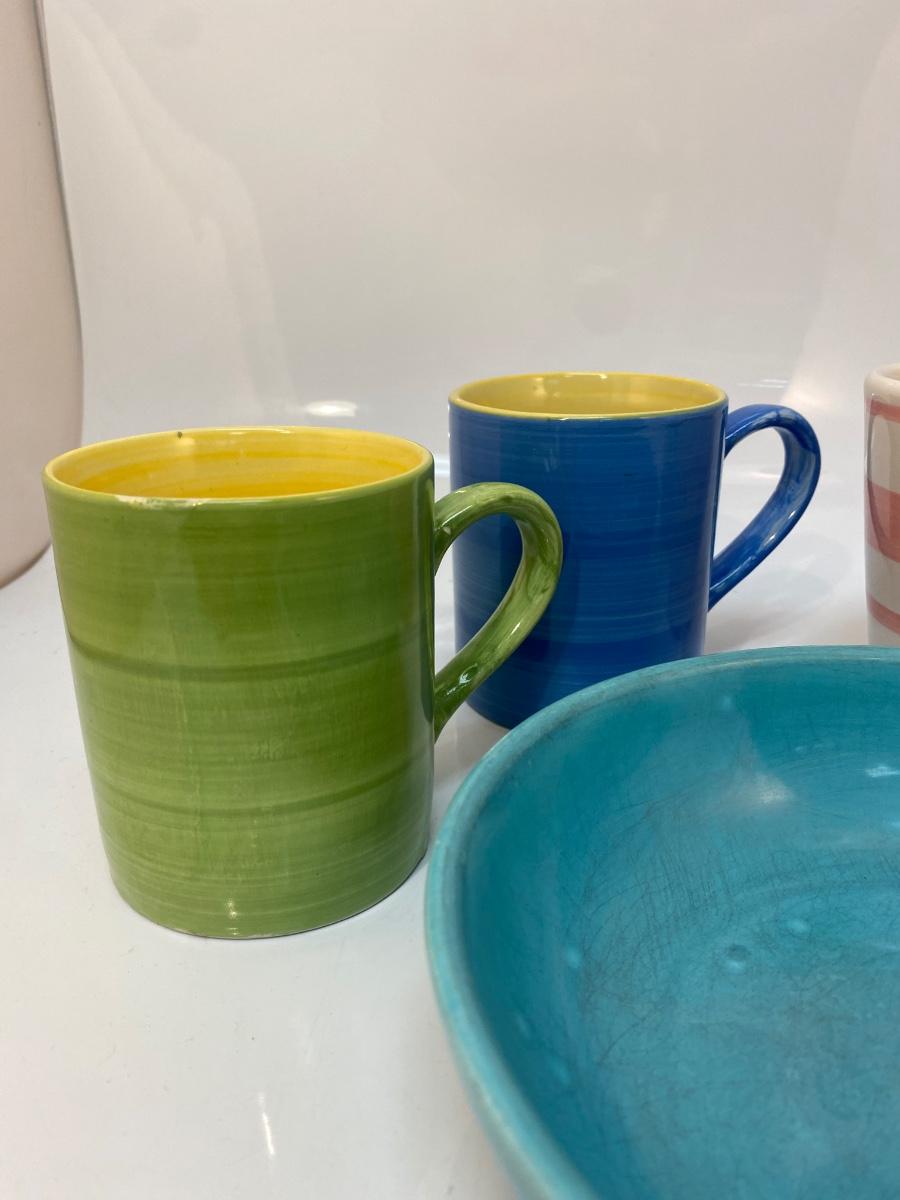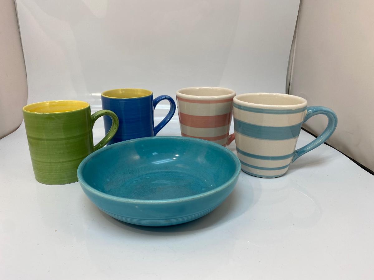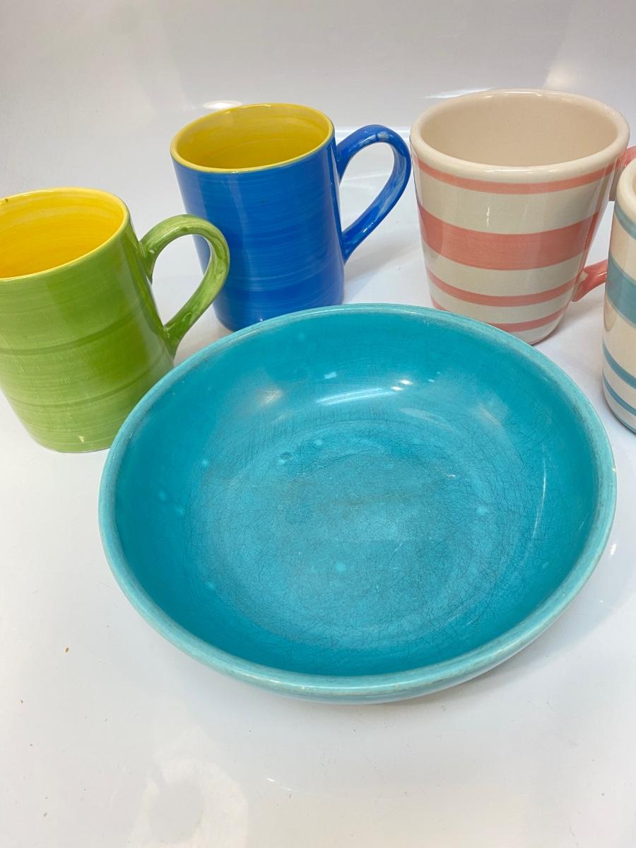 Springtime Colors Coffee Cups Mugs Vintage Pottery Bowl. Bowl shows age. No chips noticed on any piece.