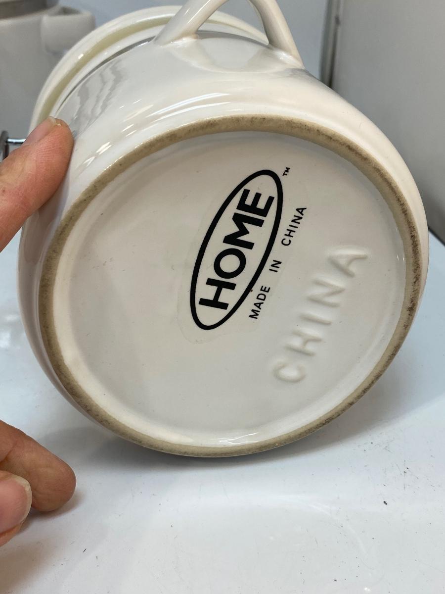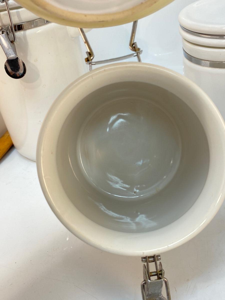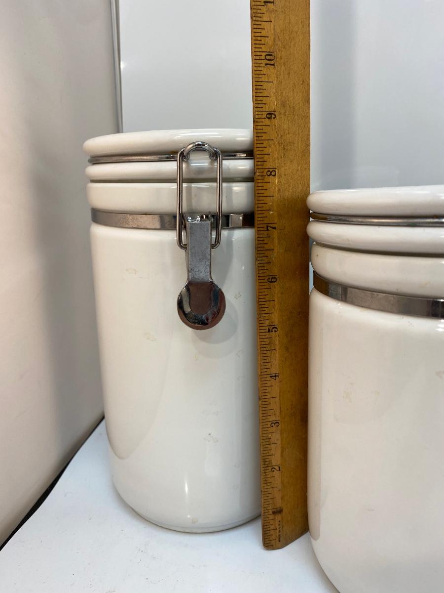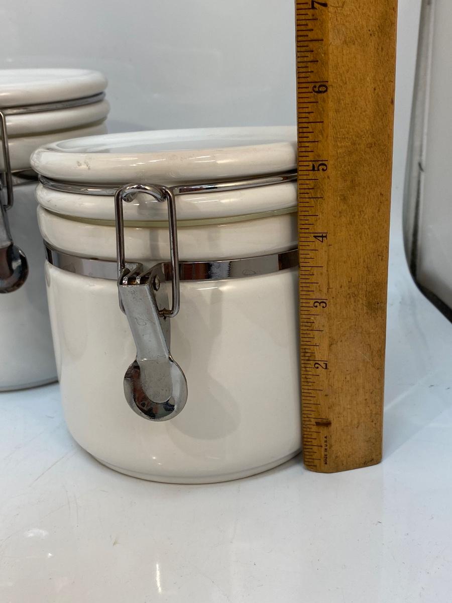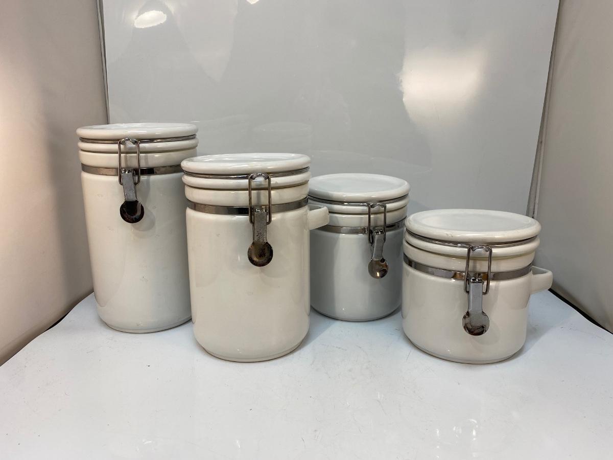 Set of 4 White Ceramic Counter Sitting Canister Set. Good used condition. Open and close easy. All lids have rubber seals.