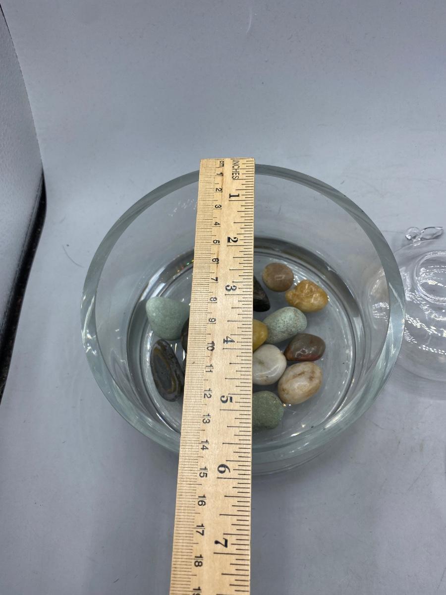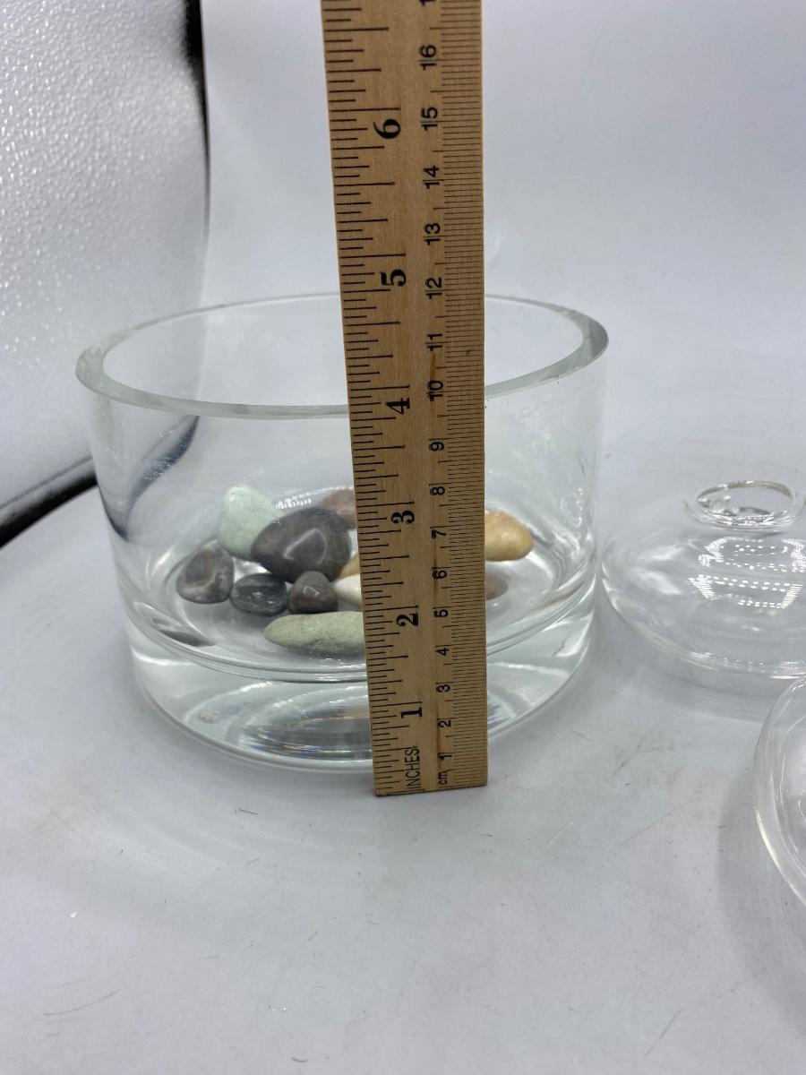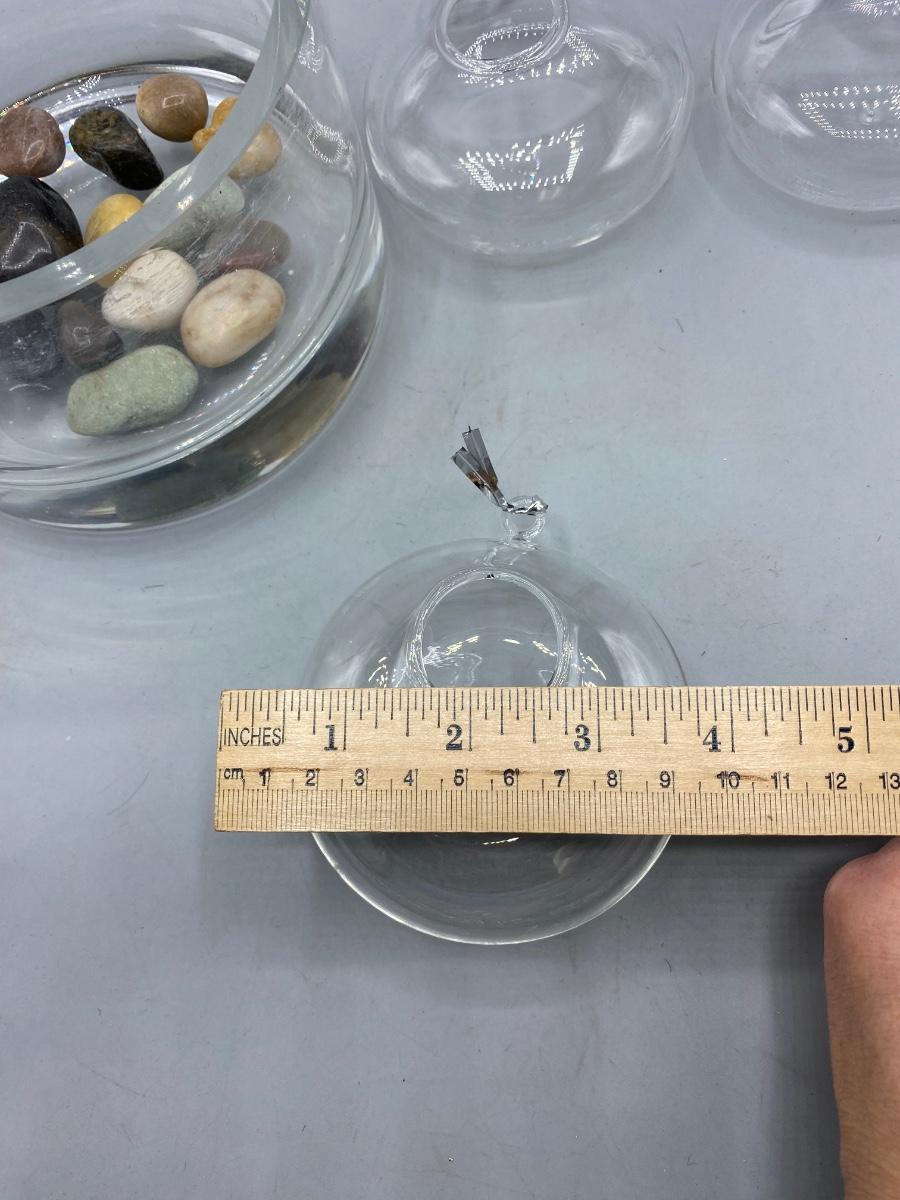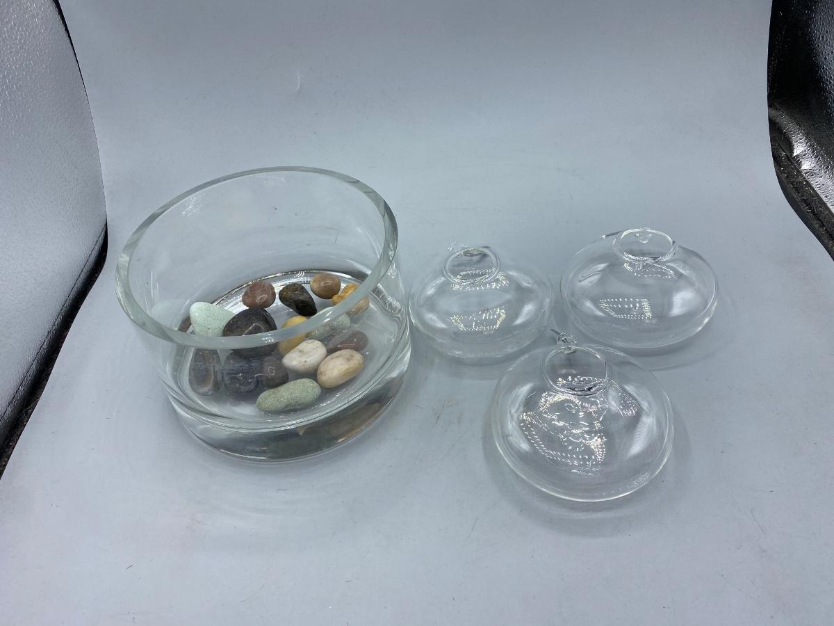 Set of 3 Blown Glass Hanging Ornaments for Crafting & Glass Bowl with Decorative Rocks. Blown glass ornaments have a hole near top on oneside, great for crafting projects. All glass pieces in good condition, no chips found.
