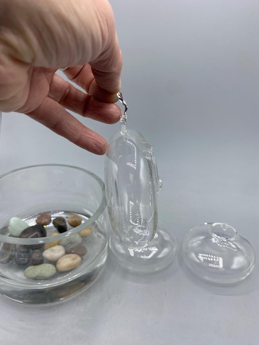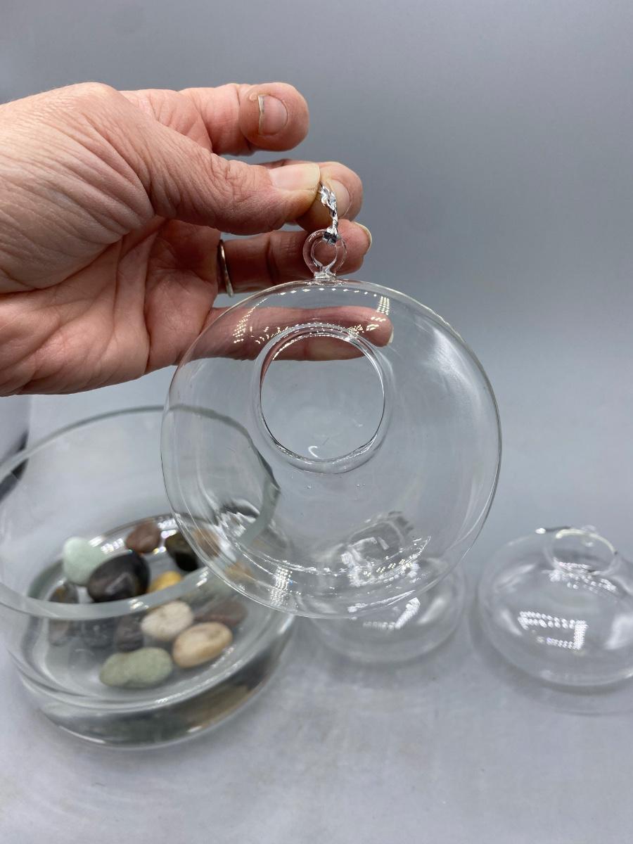 Set of 3 Blown Glass Hanging Ornaments for Crafting & Glass Bowl with Decorative Rocks