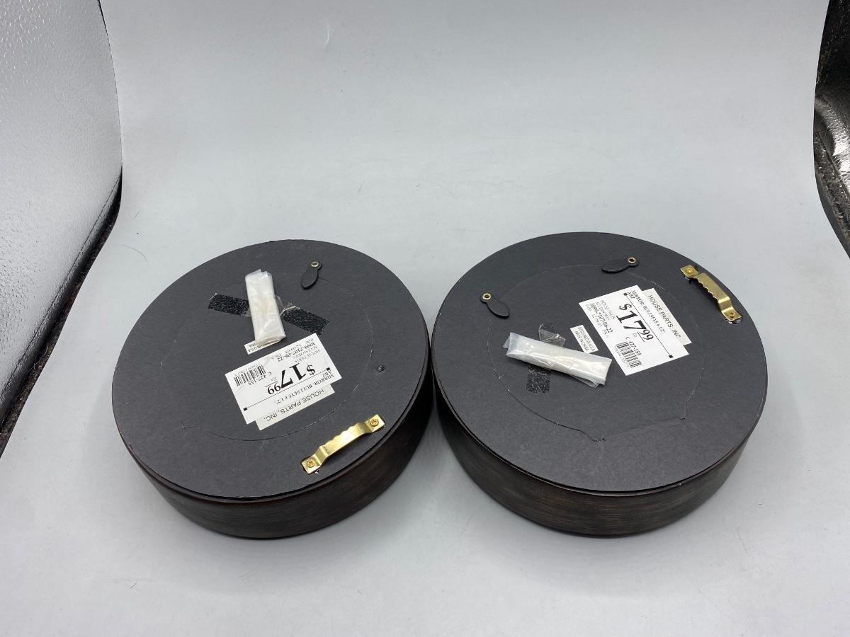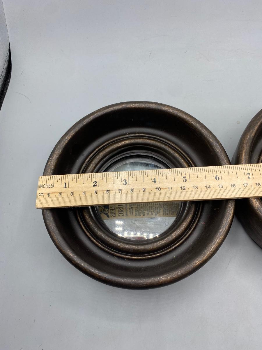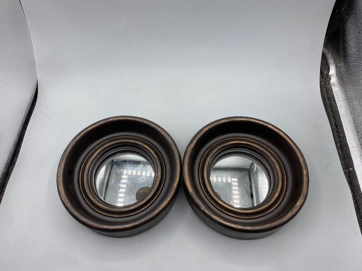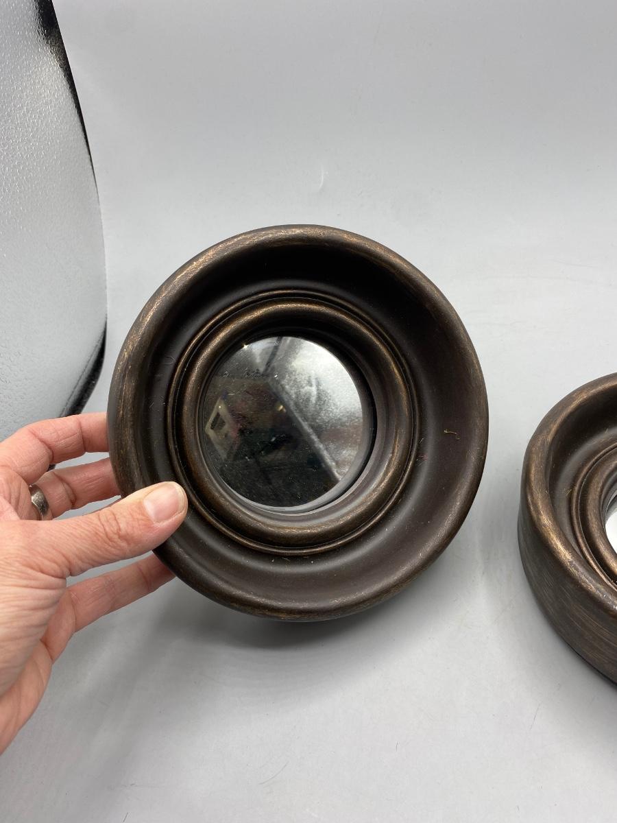 Pair of 6.5" Round Wall Mirrors. Thick frames, mirror is probably only about 2.5" size. Mirror can be removed, and frames repurposed. See photos.