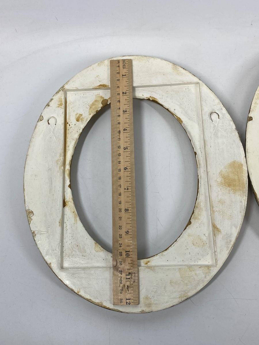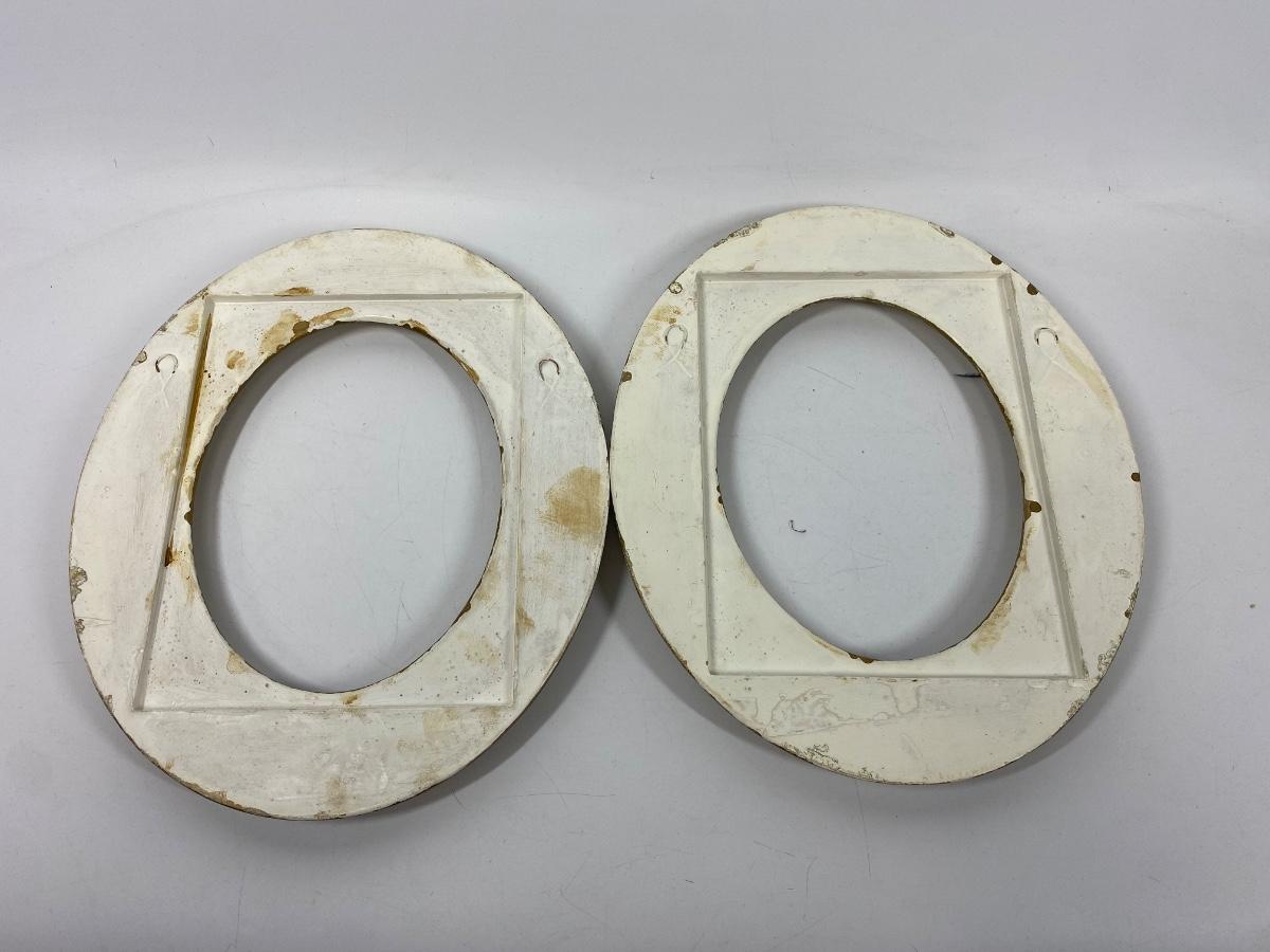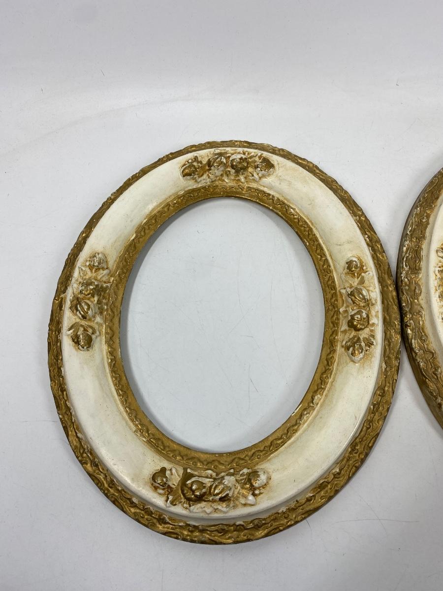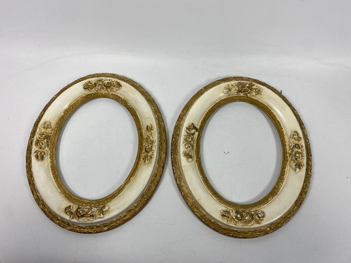 Pair of Vintage Antique Plaster Oval Frames Floral Details Gold Trim. In good, aged condition. No glass or backs. Worn look to the gold, can be repainted if desires. Has two metal loop brackets in the back for hanging. About 7x9 inside opening and 12x9 outside of frame. No maker marks.